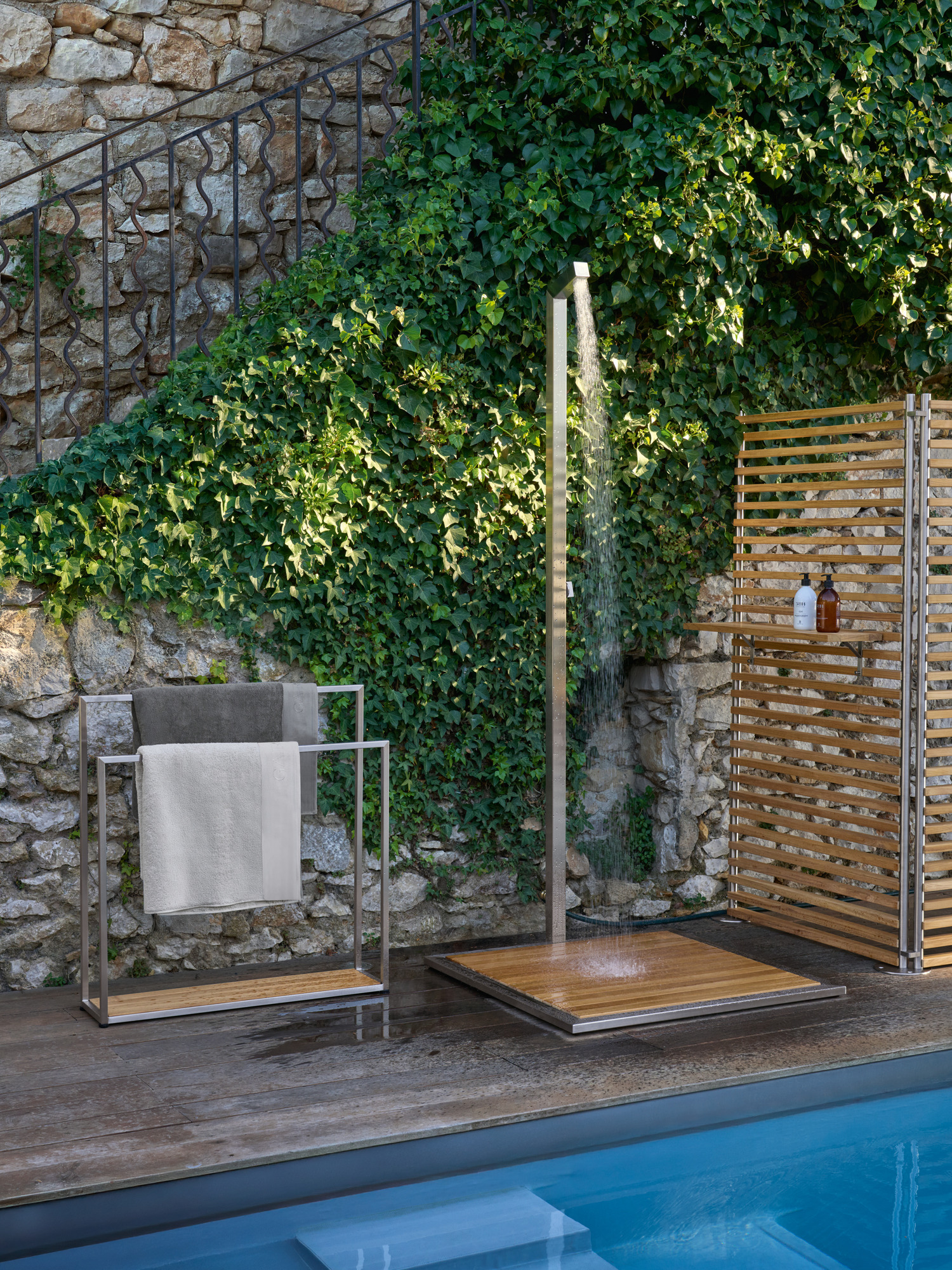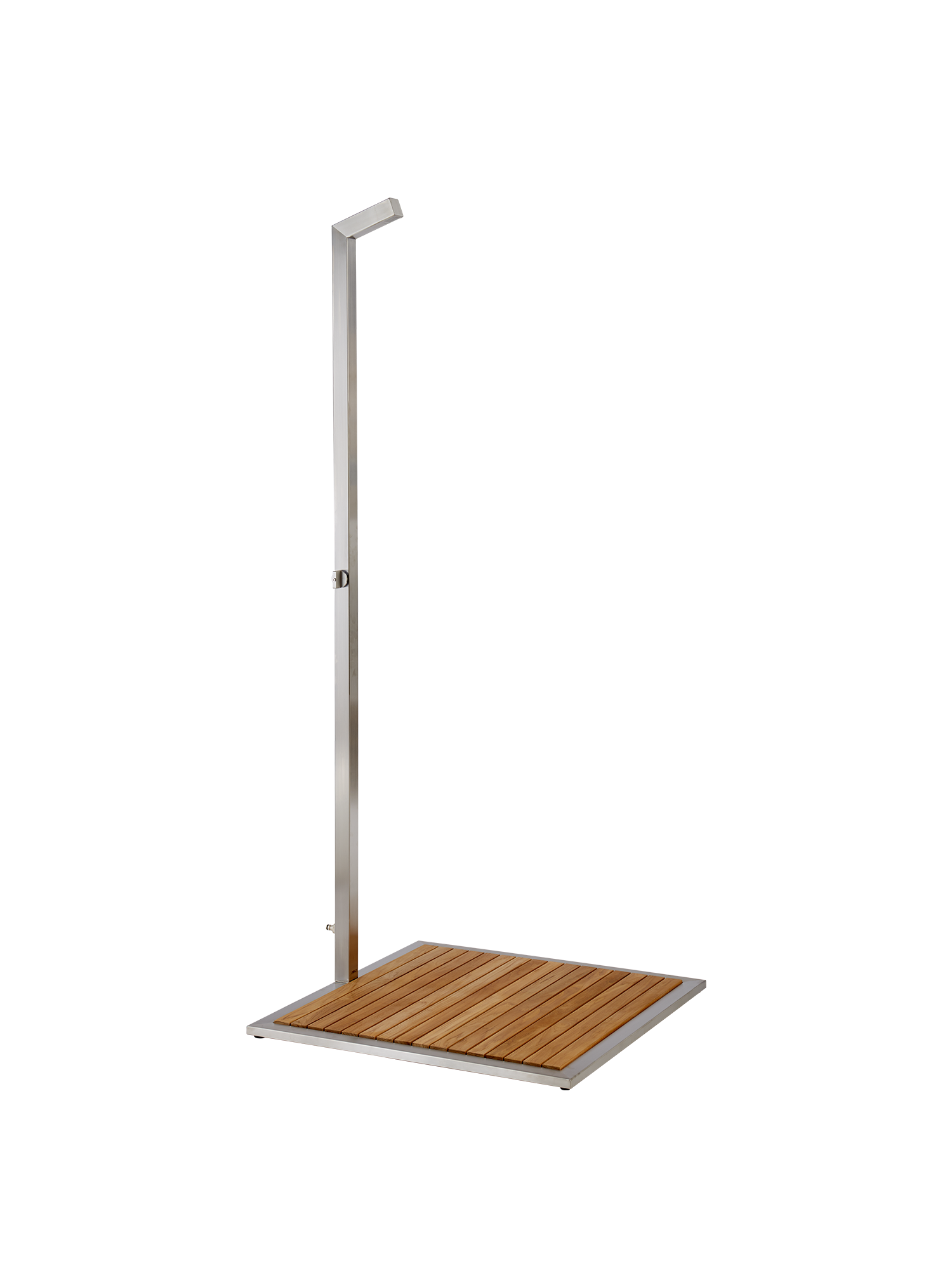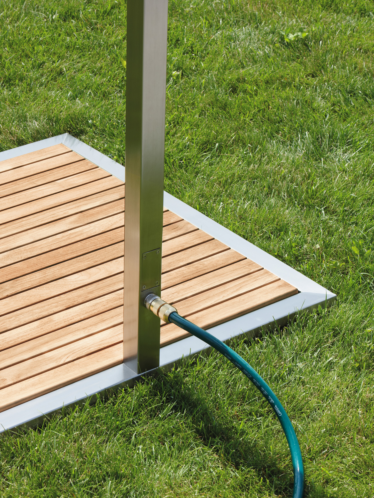 A refreshing shower on hot days becomes possible with the garden shower of stainless steel with a floor board of teak. Its steady stream of water can be easily regulated with a fitting placed to the side. For connecting to the tap, a commercially available garden hose, which can also be ordered from Garpa, is perfectly adequate (see 'Accessories').