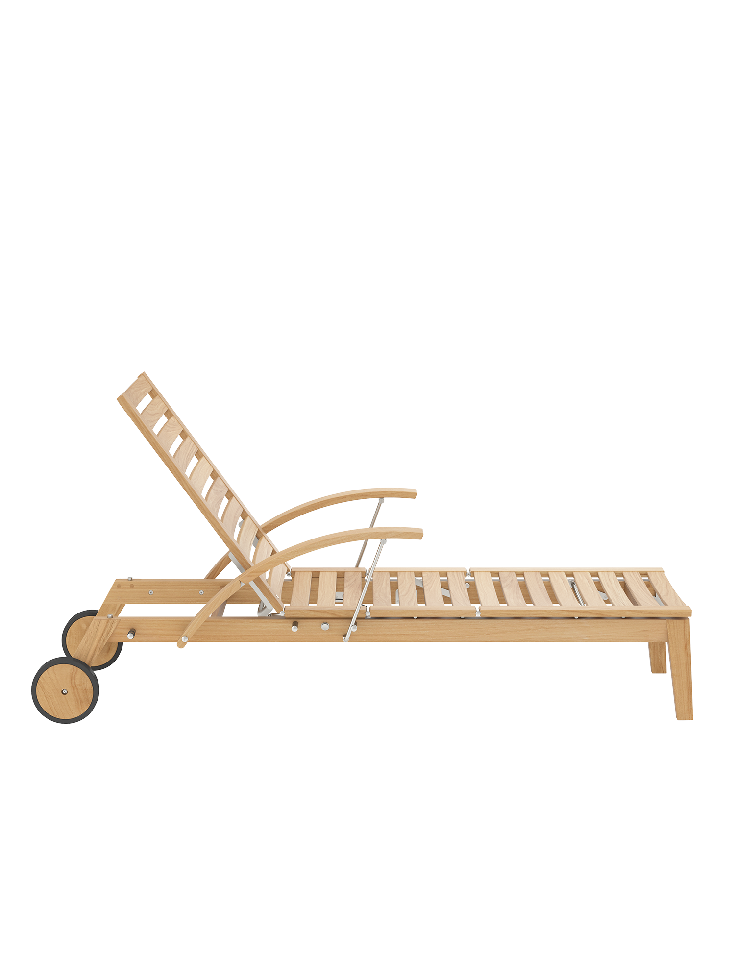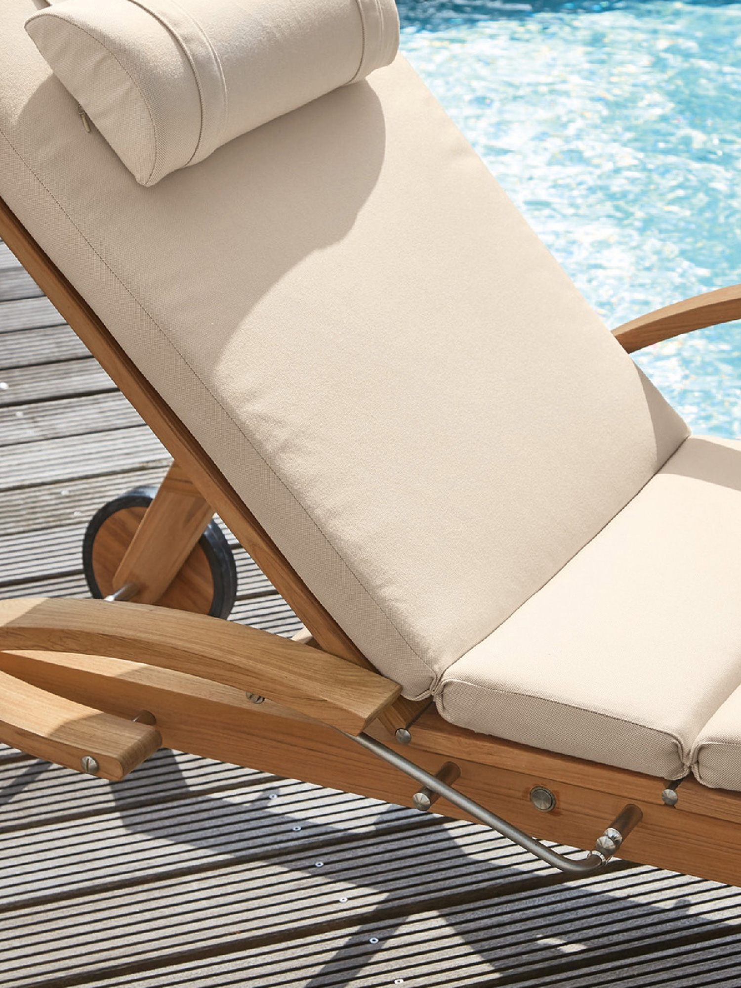 Hamptons combines simple elegance with the highest comfort and sophisticated technology. The backrest of the teak lounger can be adjusted at the touch of a button with the help of a hydraulic piston. Discreetly hidden under the seat, it takes care of the variable positioning. The armrests can be swung back to facilitate access.