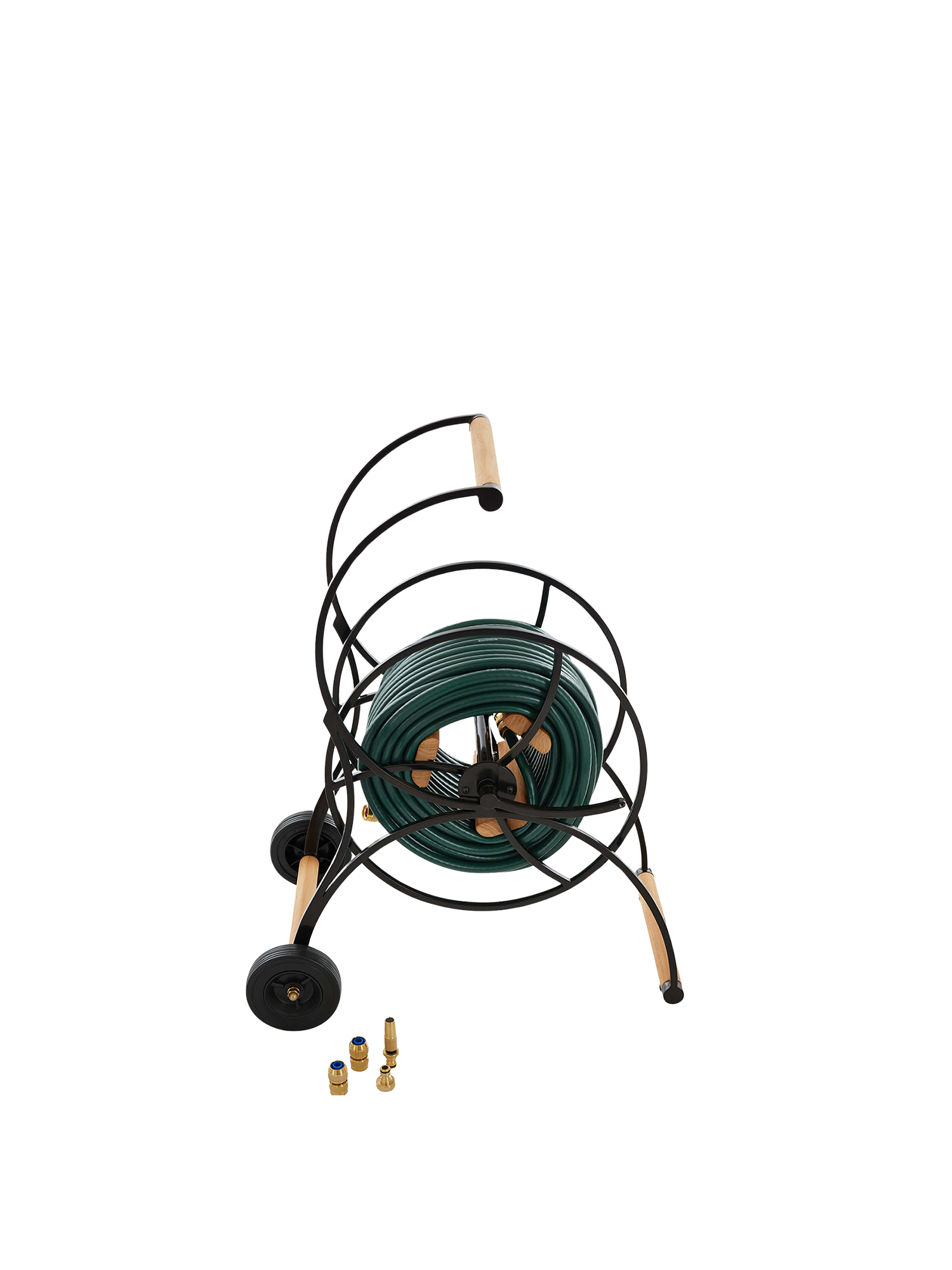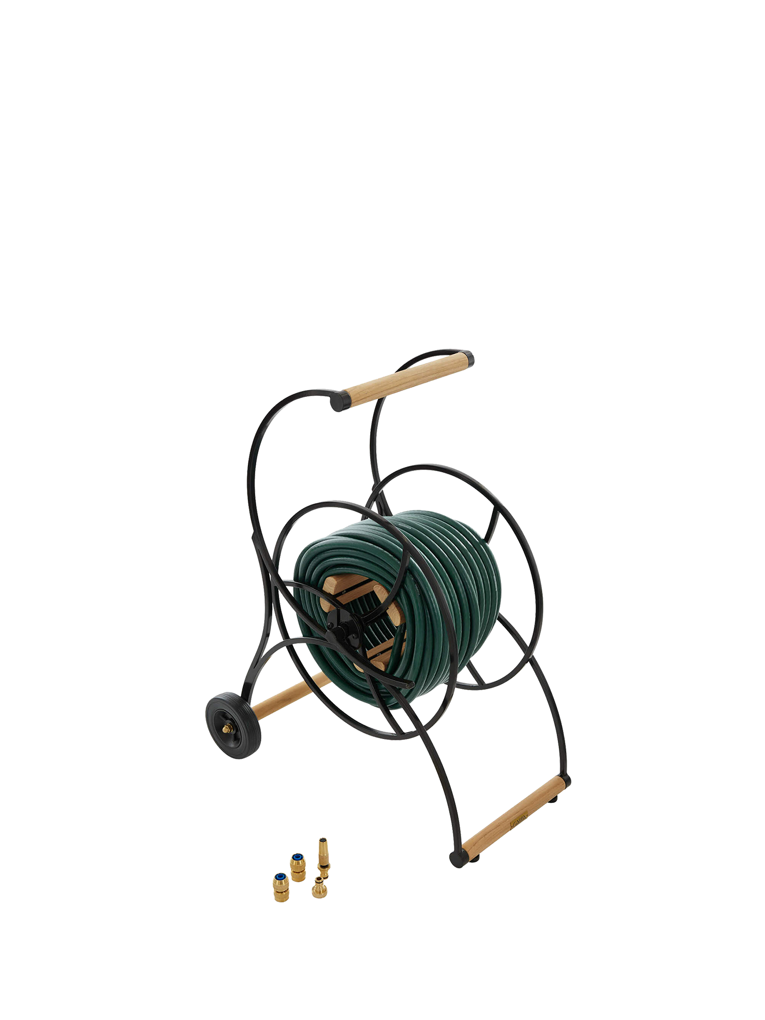 The robust hose caddy has handles of teak wood and is of galvanised, powder-coated steel. The 50 m 1/2-inch garden hose in elegant dark green is rolled in with a handle and delivered with connectors of high-quality brass