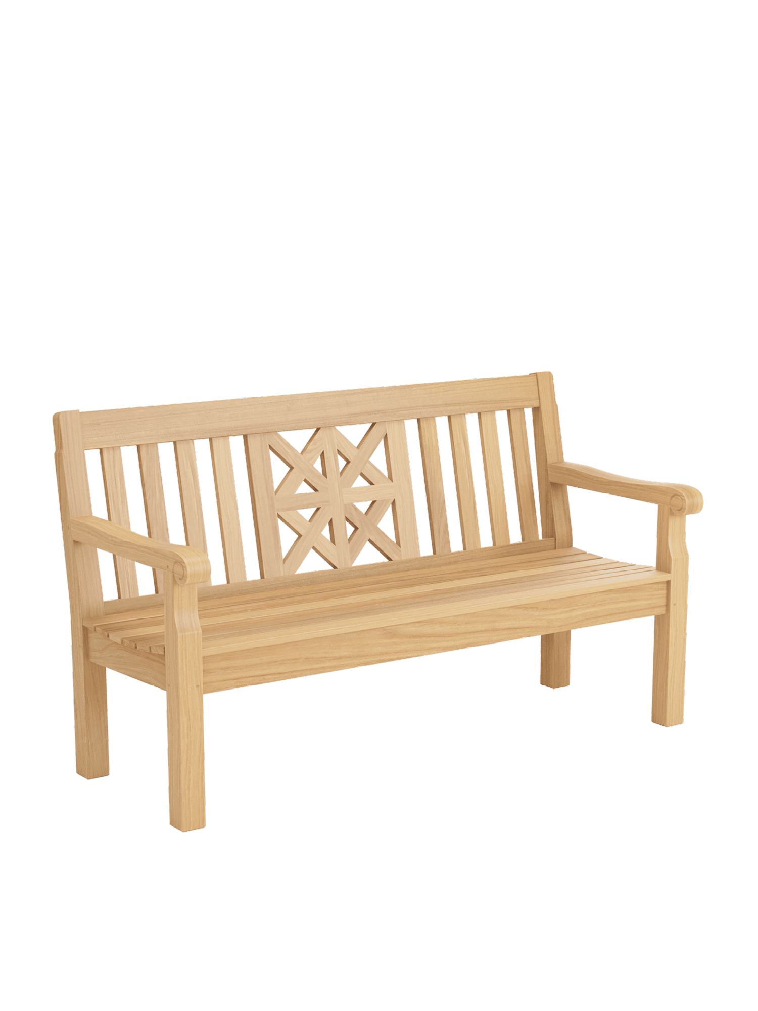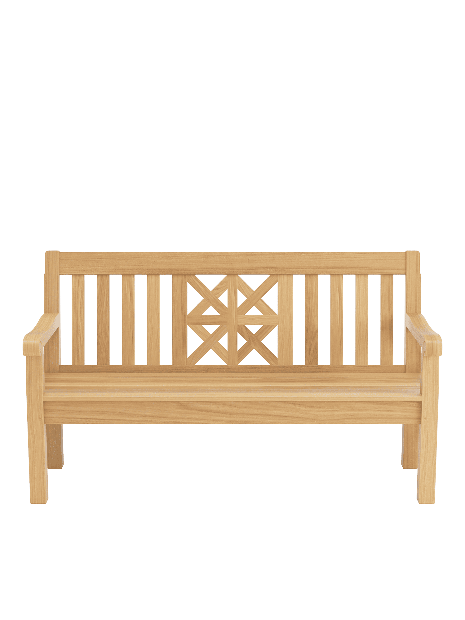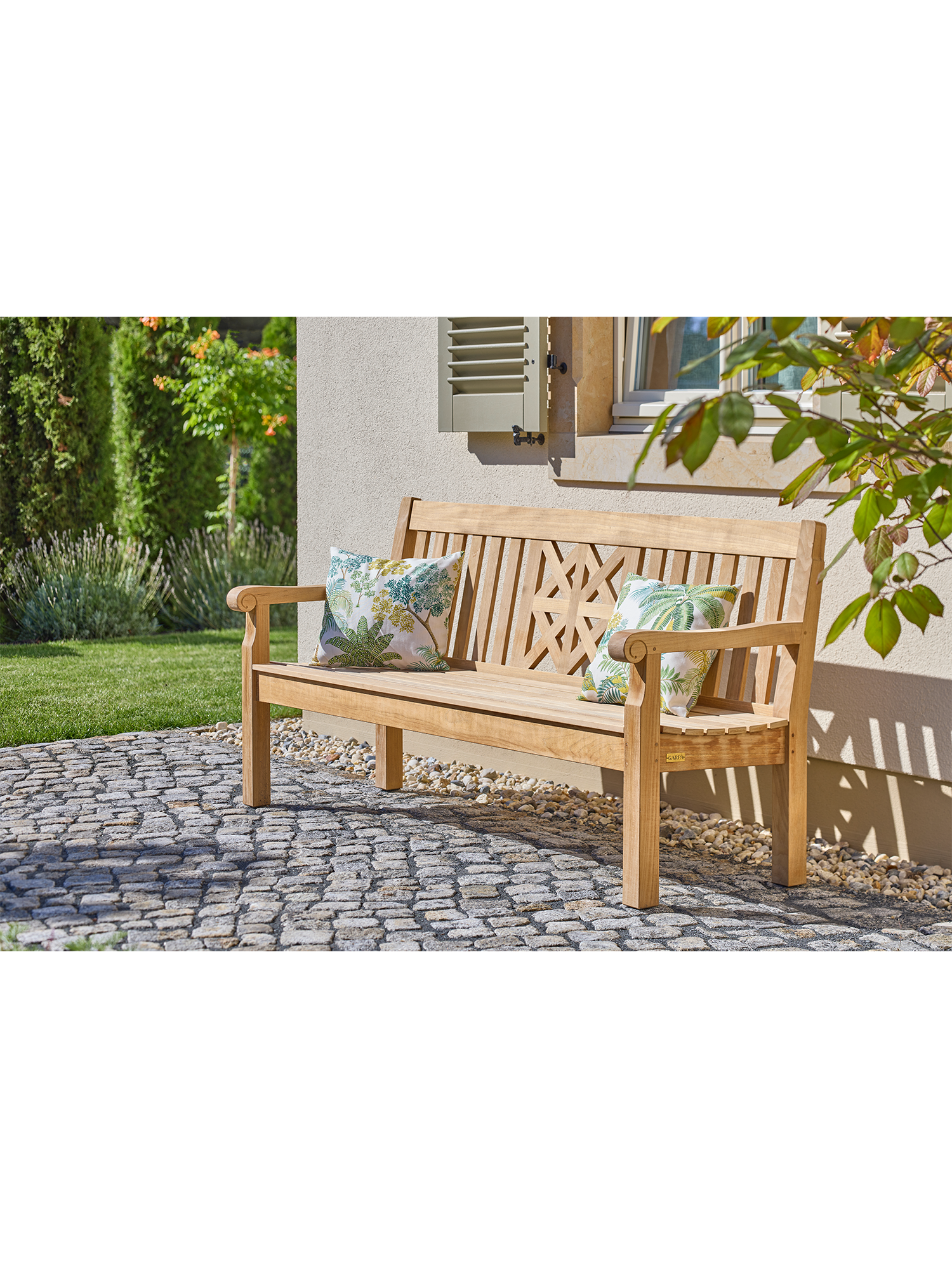 With a generously calculated seat, closely aligned teak slats, and an ergonomically angled backrest, the bench from the Kensington series ensures a relaxed position. All slats are dowelled and merge smoothly into the crosspiece so that there is no uneveness.
