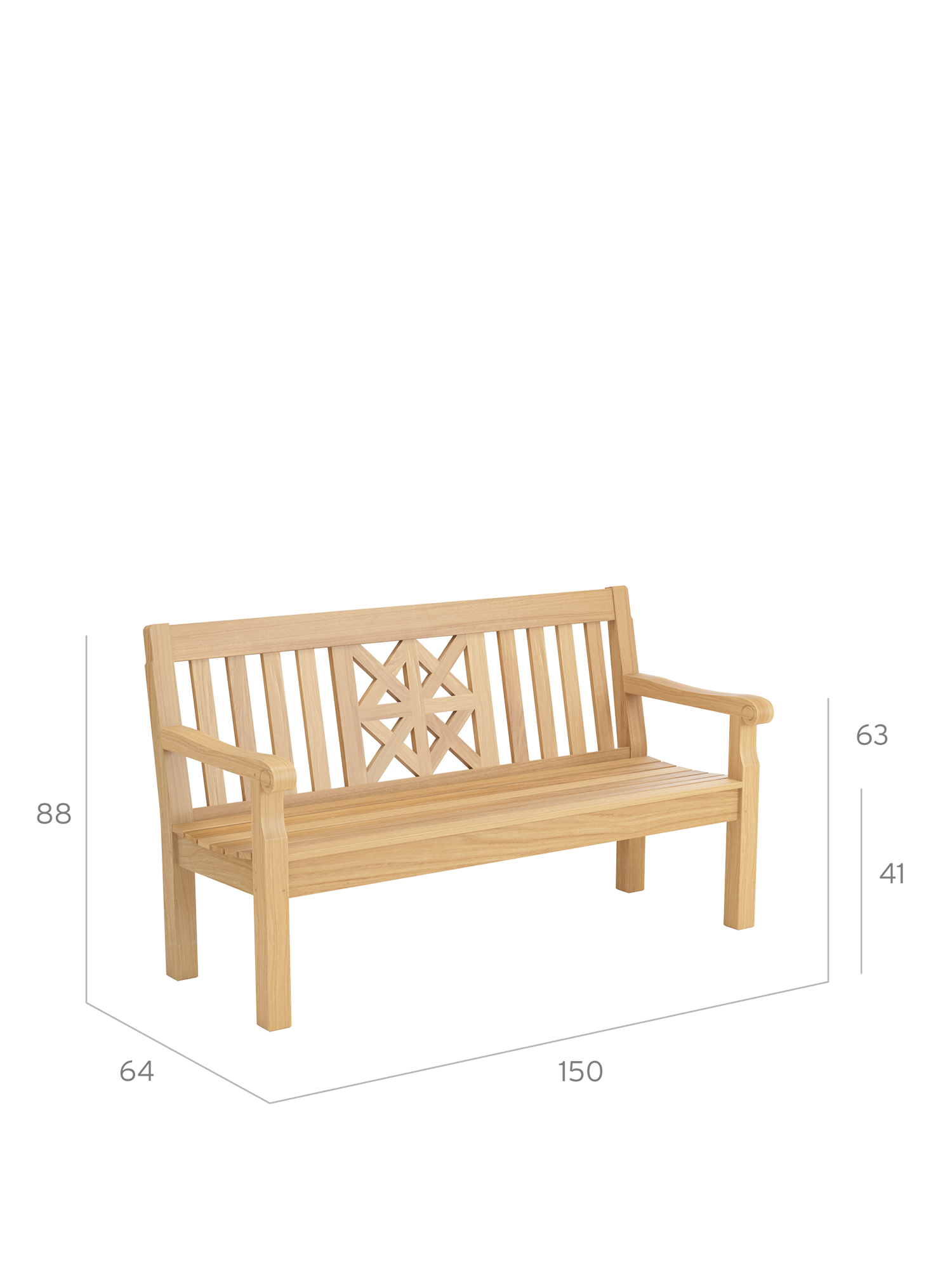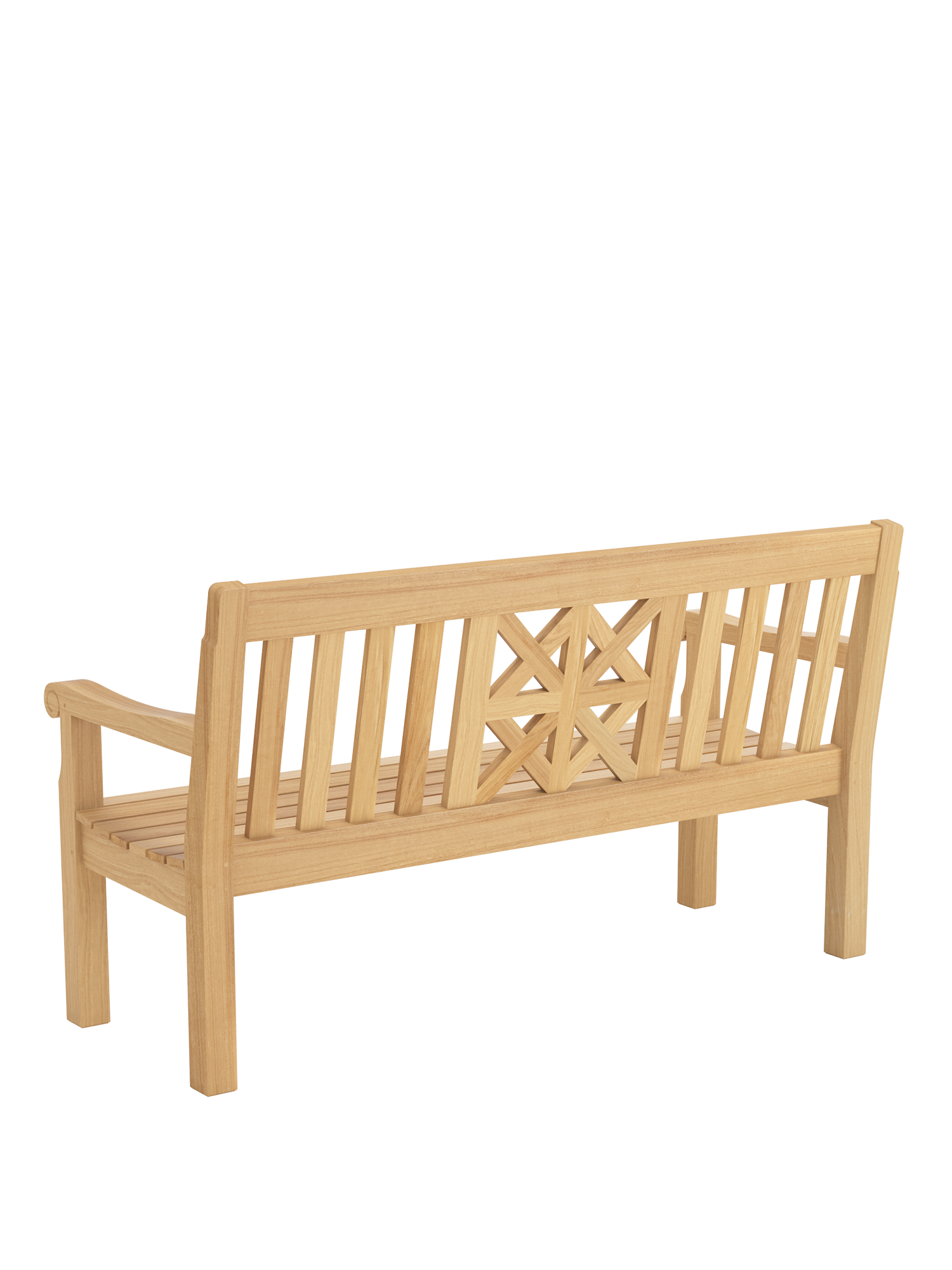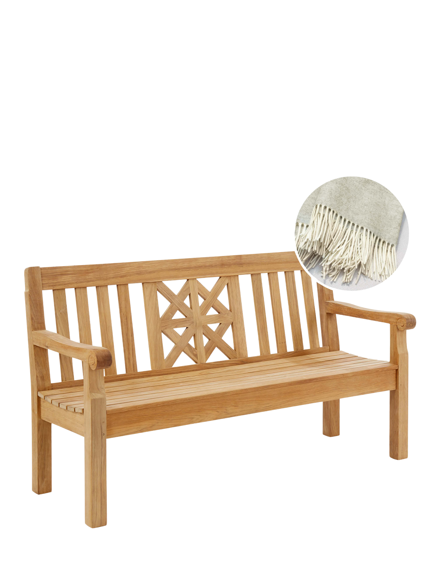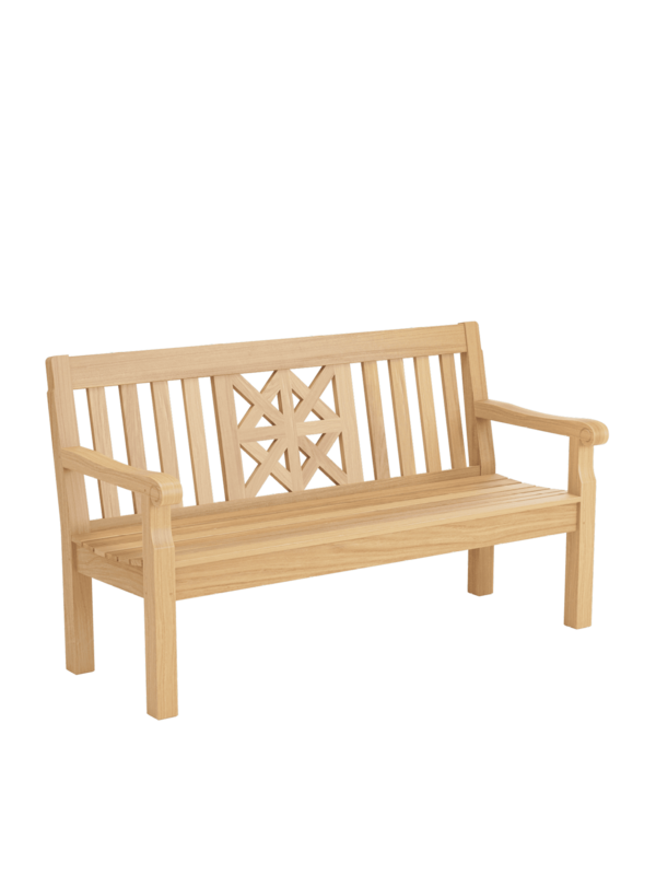 With a generously calculated seat, closely aligned teak slats, and an ergonomically angled backrest, the bench from the Kensington series ensures a relaxed position. All slats are dowelled and merge smoothly into the crosspiece so that there is no uneveness.