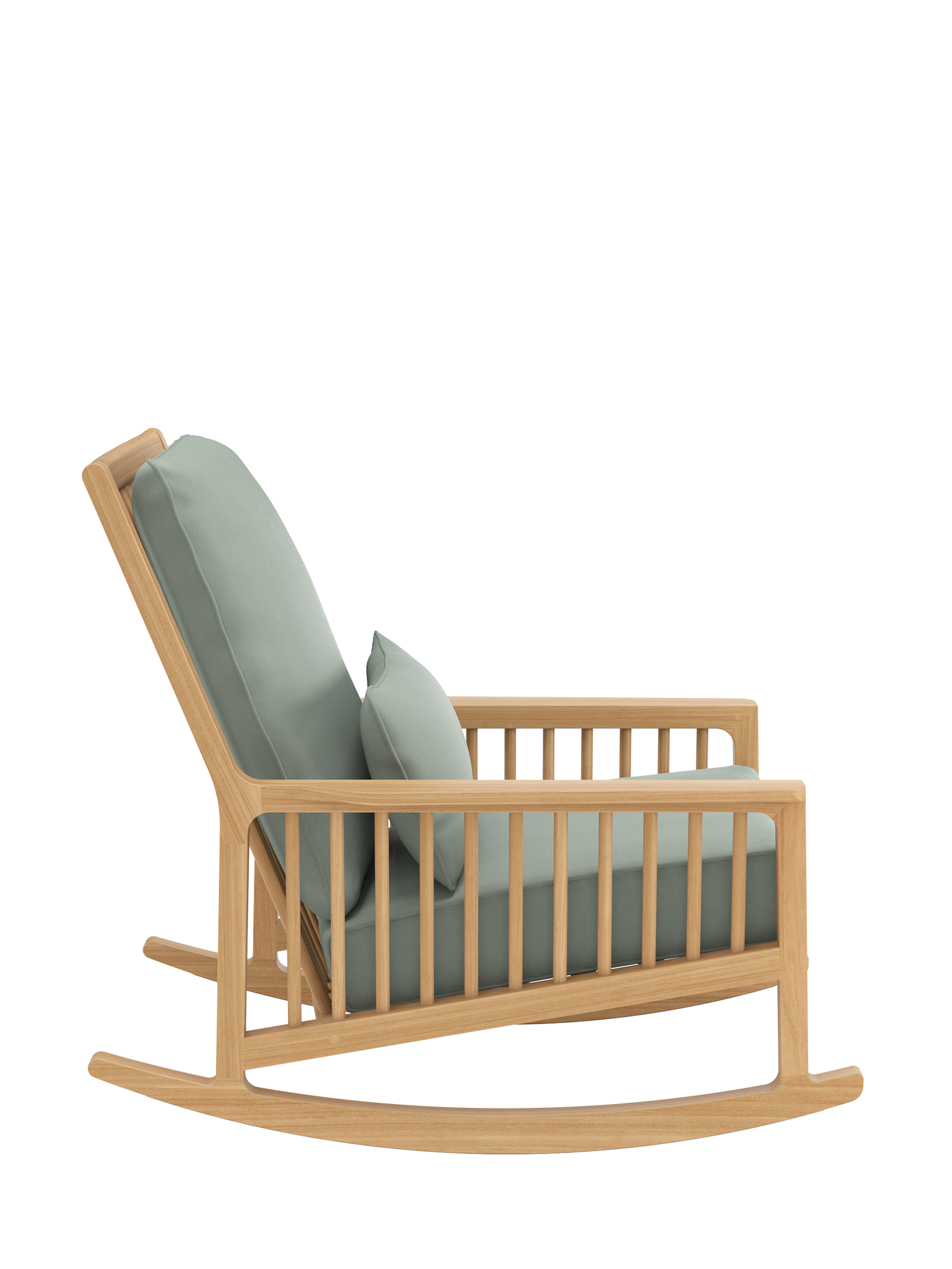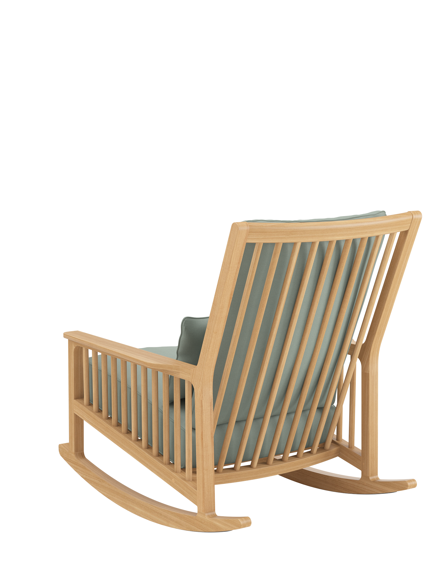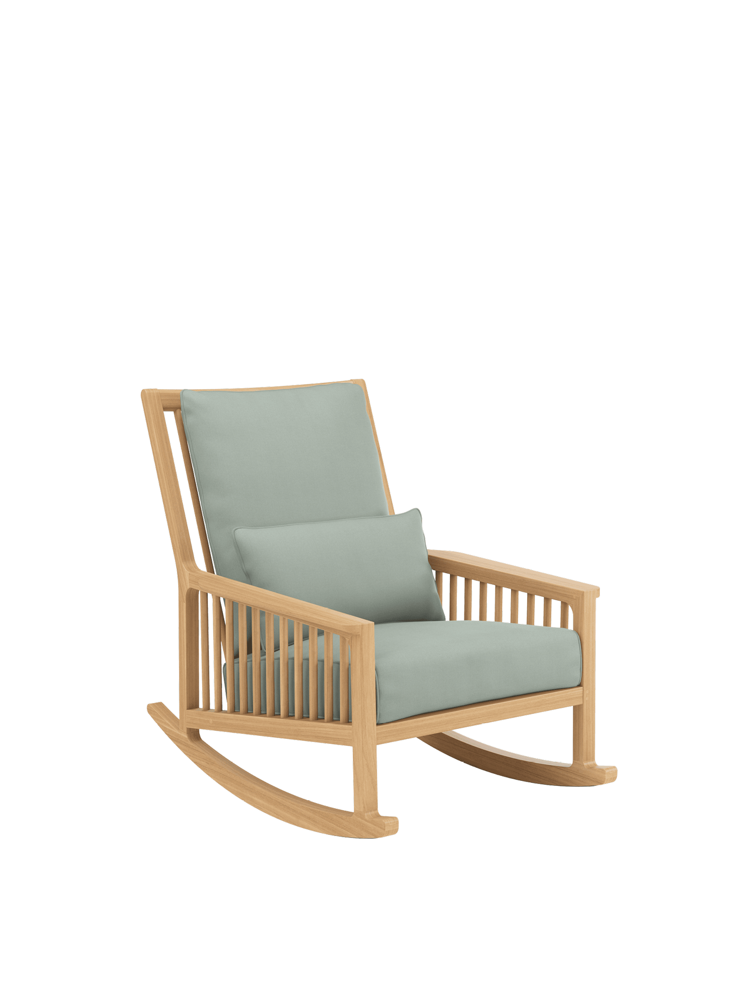 The shoulder-high backrest is made for reclining, and the pleasant depth is especially inviting. One quick movement, a lift of the legs, and you are gently tilting on elegant teak runners – and how delightful to be able to sink into the dreamily soft cushioning of the rocking chair. A covering of synthetic material beneath the runners protects sensitive flooring.