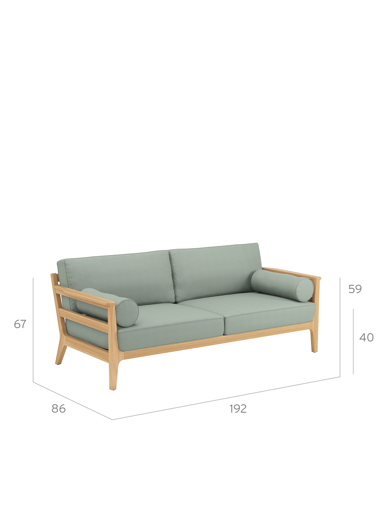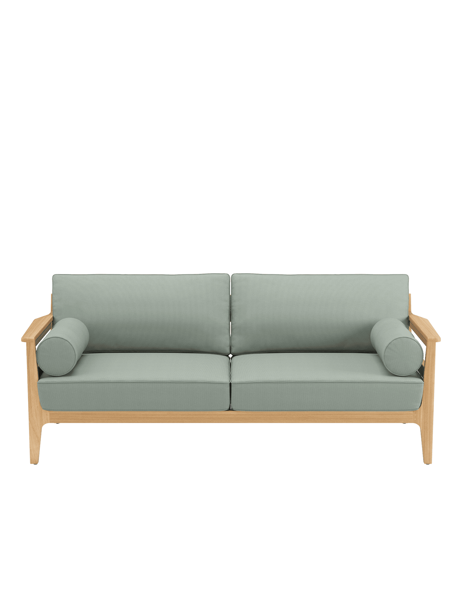 The spacious furniture in lounge format provides a cosy retreat. The frames are made of high-quality plantation teak, and the seats are covered with fabric that firmly supports the comfortable upholstery. The beautiful piped seams provide eye-catching detail that lends the classic ensemble its maritime charm. All cushions are colour edged, including the padded bolsters that serve as armrests for the sofas.
