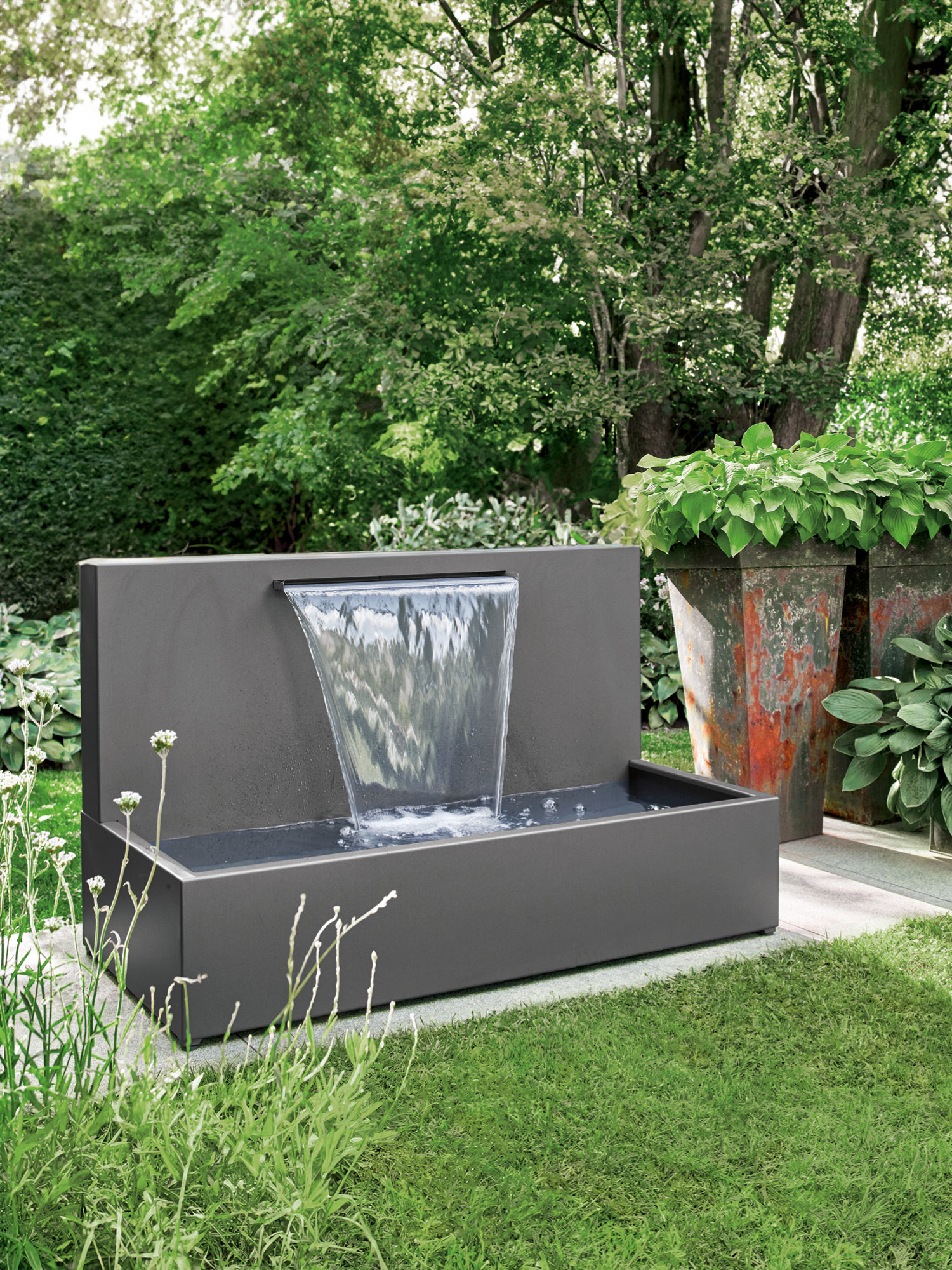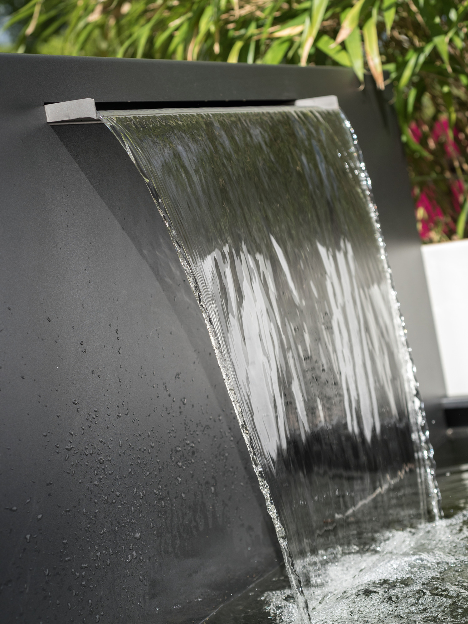 The fountain in purist design is made from anthracite-grey coated aluminium cuts just as fine a figure whether free-standing or resting in front of a wall. The water flows evenly in a wide stream into the basin, bringing harmonious movement into the garden or onto the terrace.