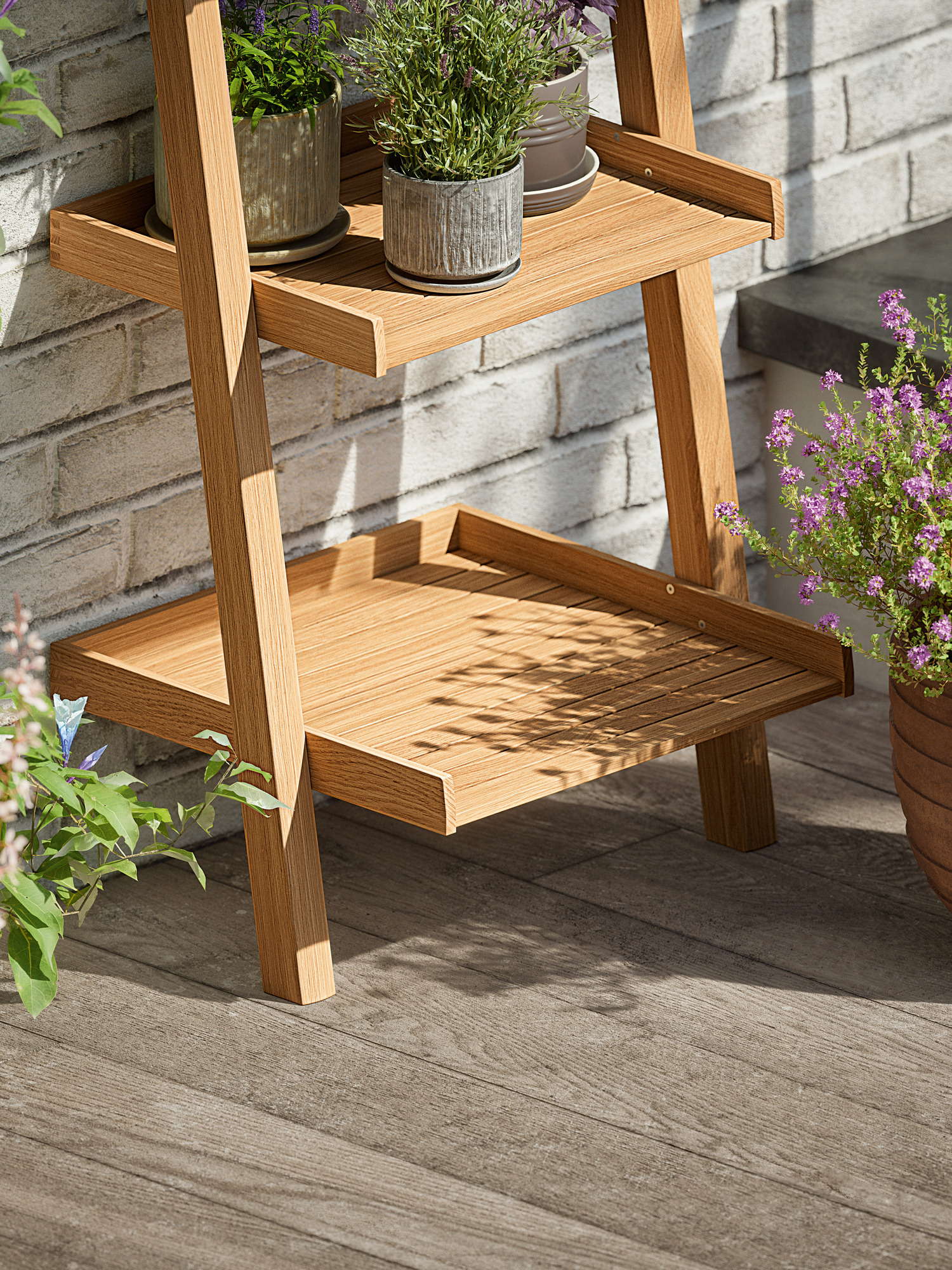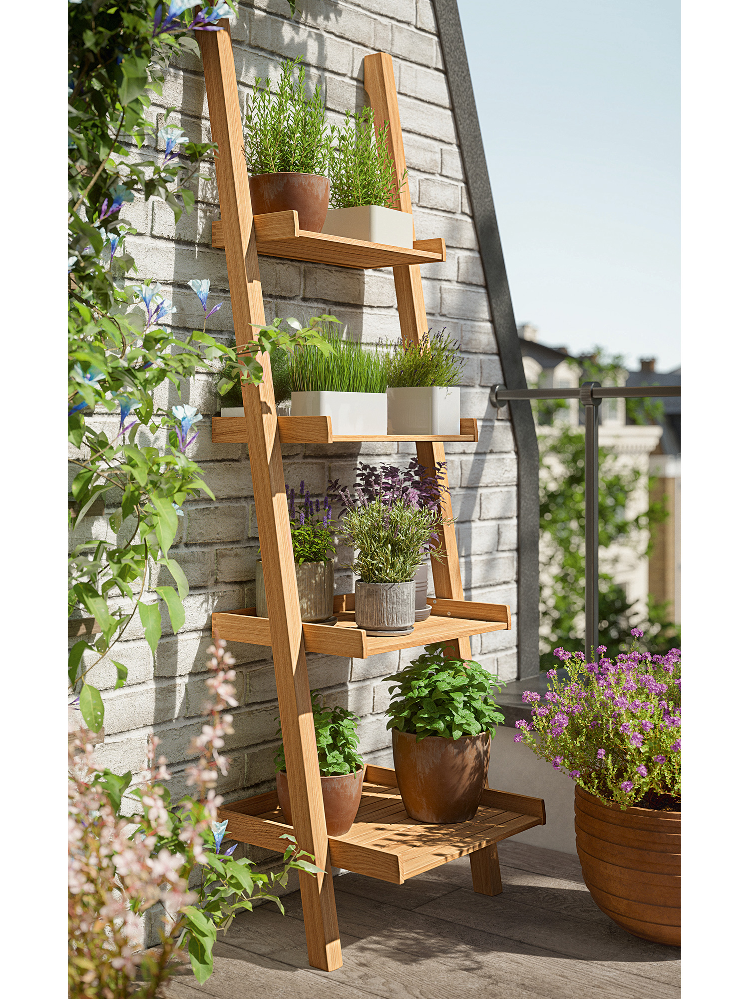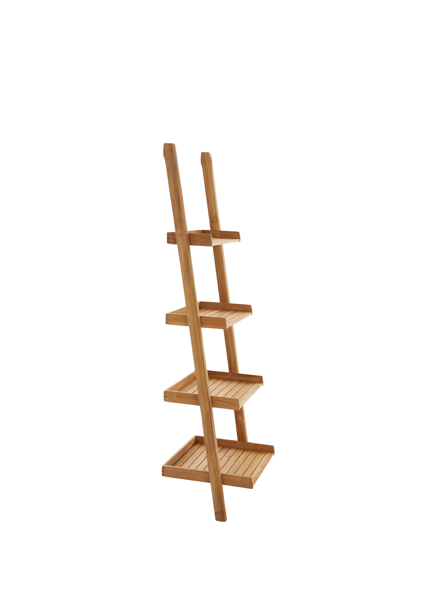 The shelf of weatherproof teak is finished in the finest standards of traditional craftsmanship. Outdoors, it leans elegantly against the house wall, is home to lanterns and pots of herbs, makes space for watering cans and garden tools or holds seasonal decorations. As they descend, the four shelves become deeper; with edging on three sides, each shelf looks almost like a tray. The posts are rounded at the front, the shelves are of tightly fitting teak slats. It can also be firmly mounted. Mounting hooks, which can be screwed into the wall, are included in the delivery.