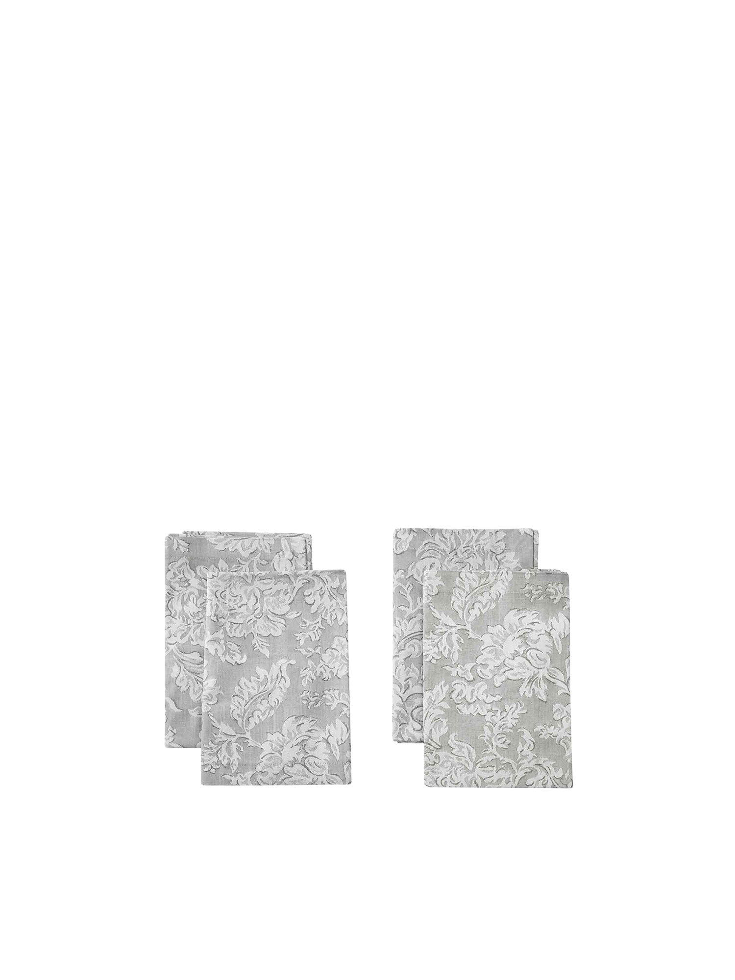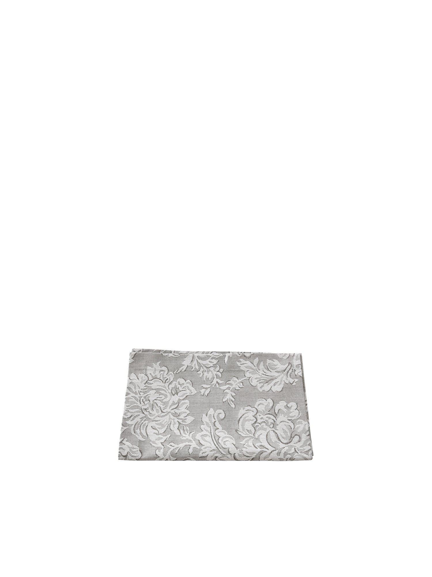 Pale grey tendrils of blossoms and leafs with dark grey accents romantically trail along a shimmering medium grey background. The napkins elaborately made of sumptuous Italian cotton jacquard, put a shine on the table.