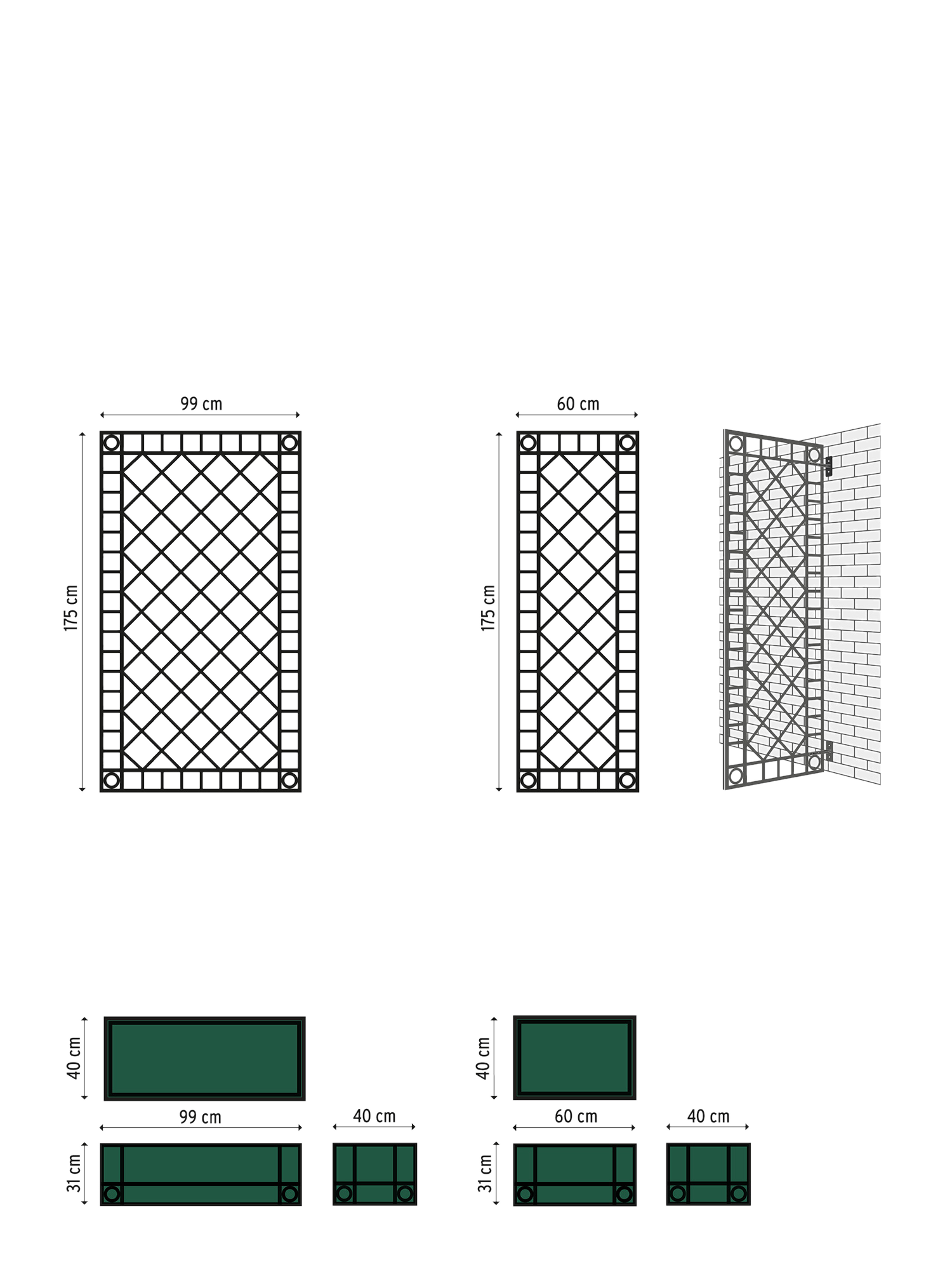 Narrow or wide trellis elements can be attached to the back of the planters or fixed between them. An additional mounting allows for a right-angled attachment to the house wall, if extra stability is required.