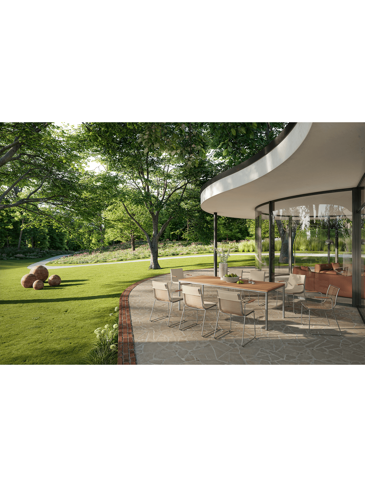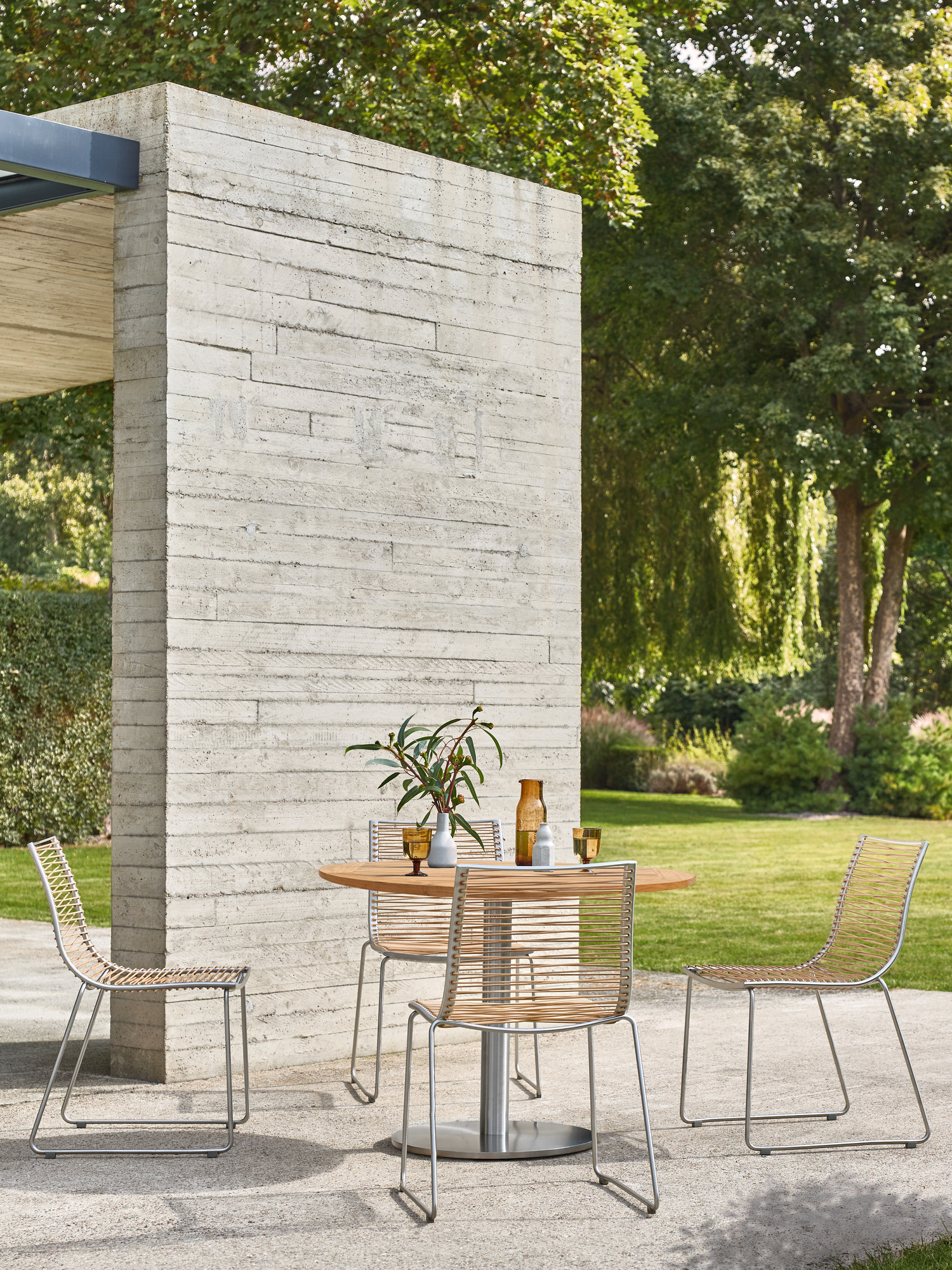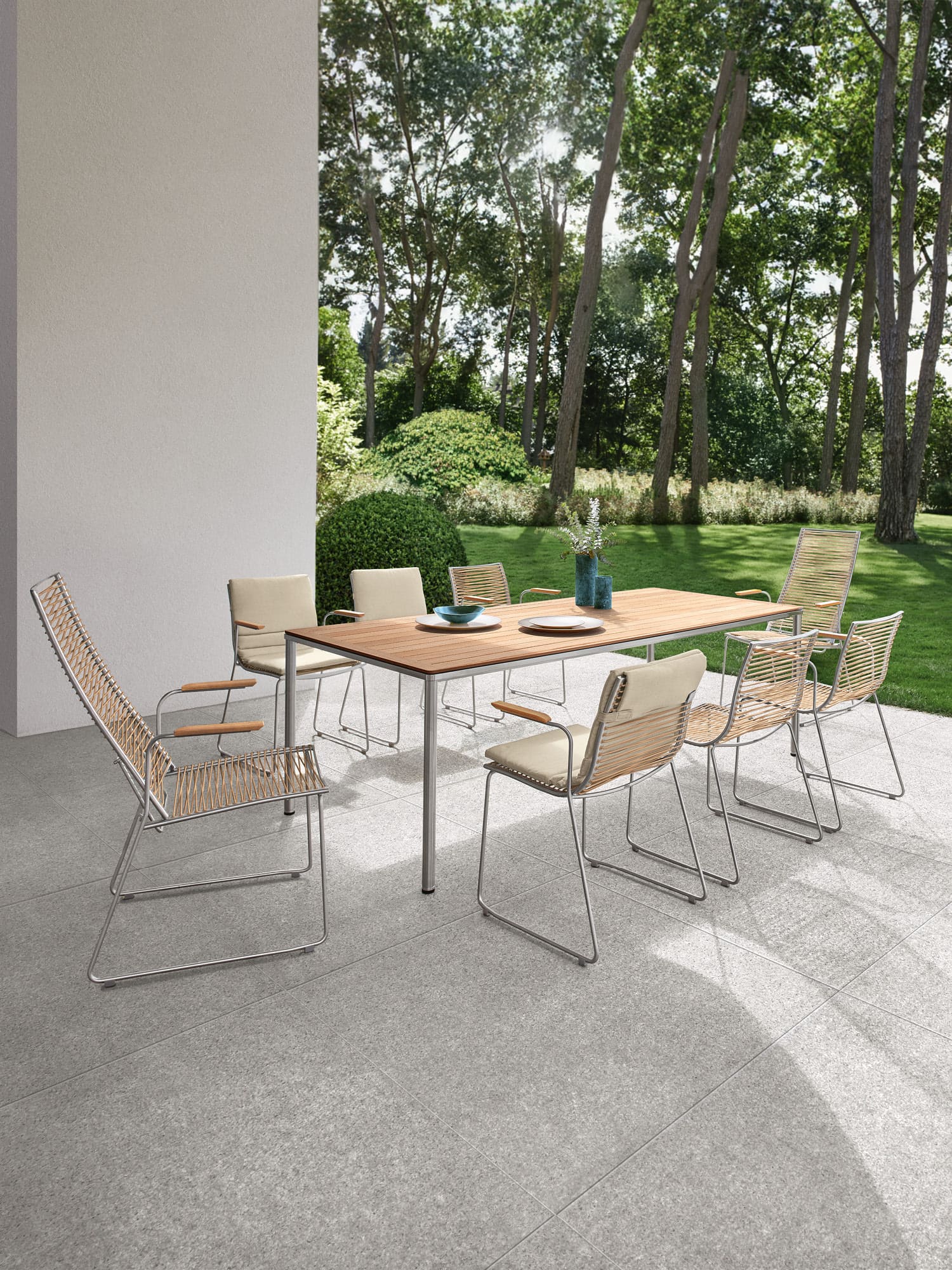 To complete the seating group, matching tables are available in different formats and with teak-slatted tops or tops of synthetic resin (HPL). Pan chairs, with their simple elegance, combine attractively also with other modern tables in our collection. For an overview of all matching tables, click on "Matching tables' further down on this page.