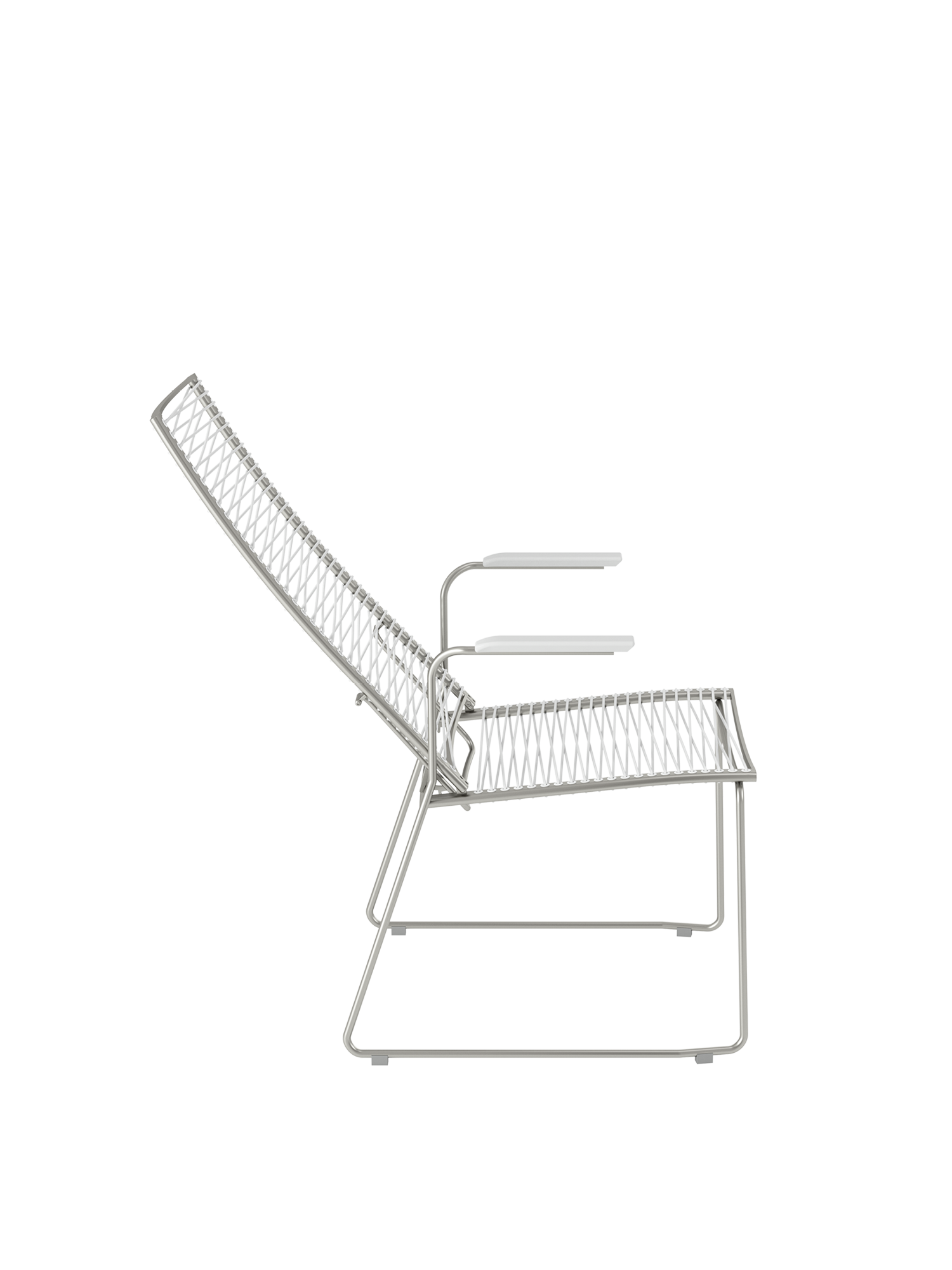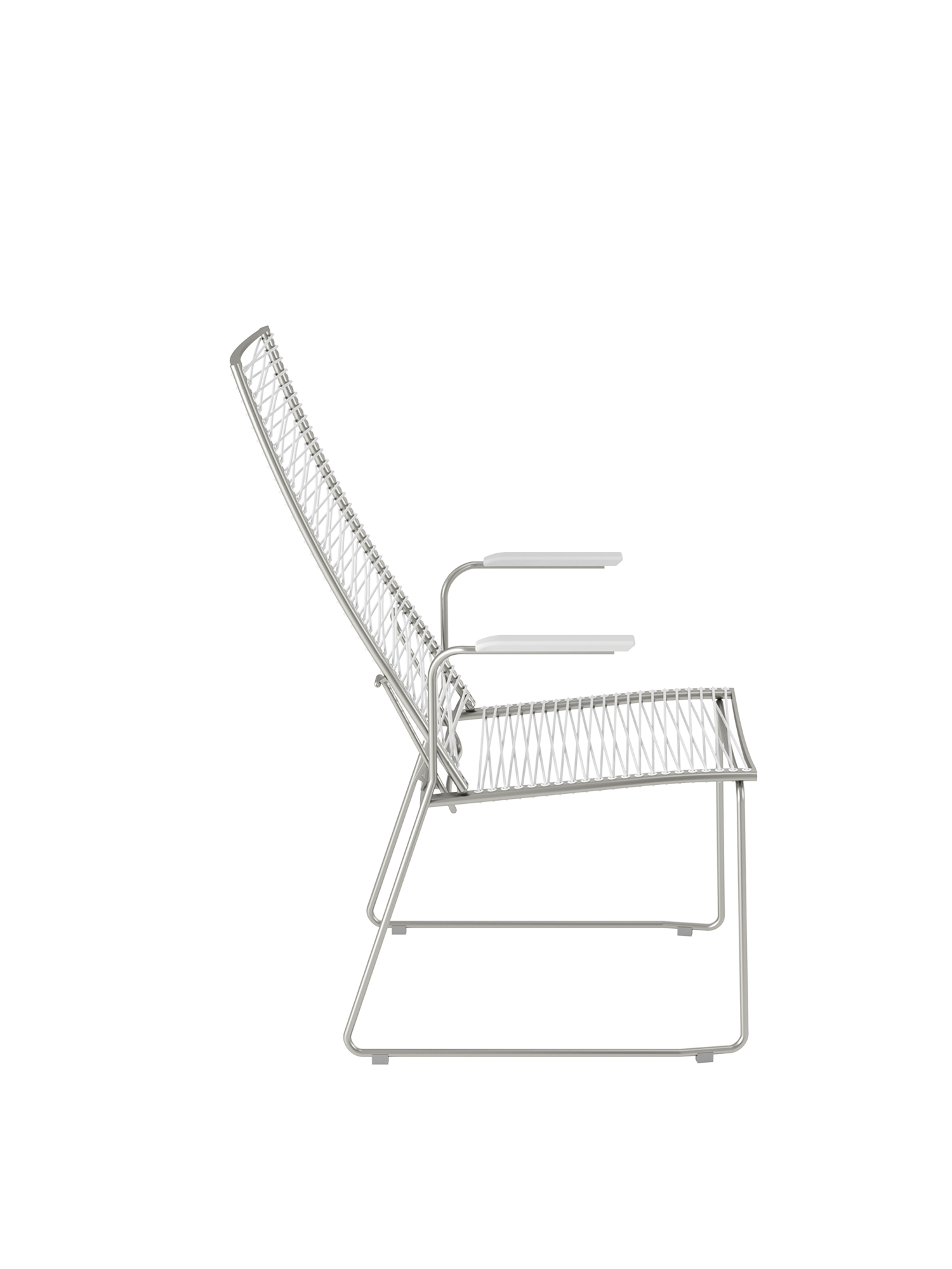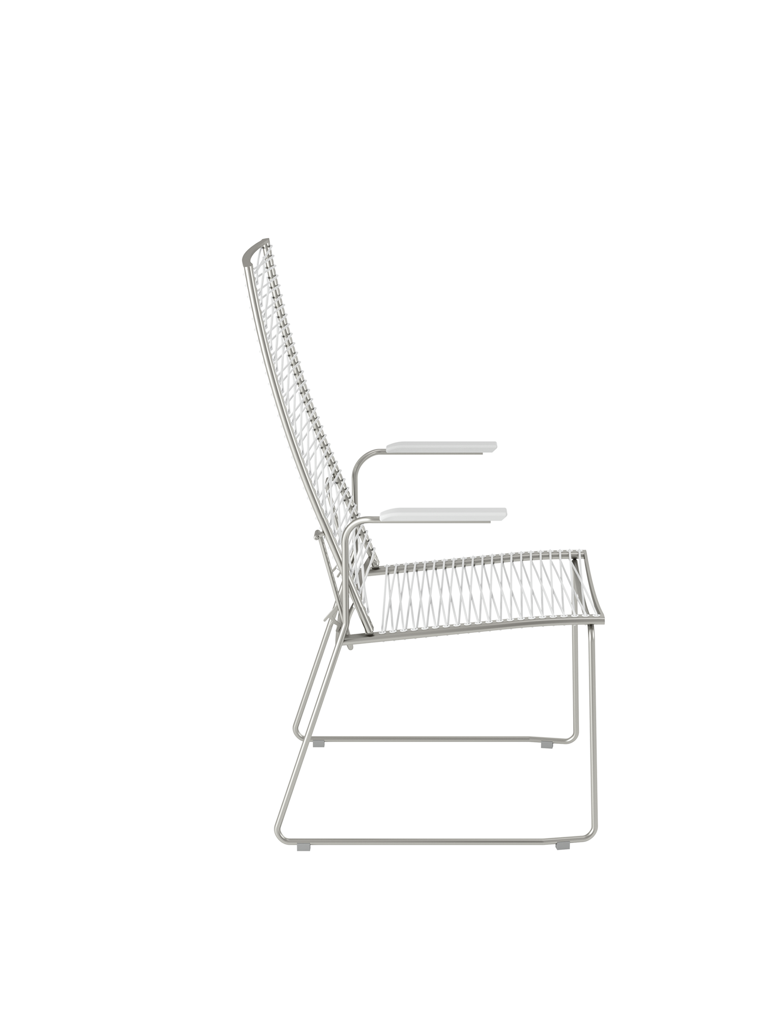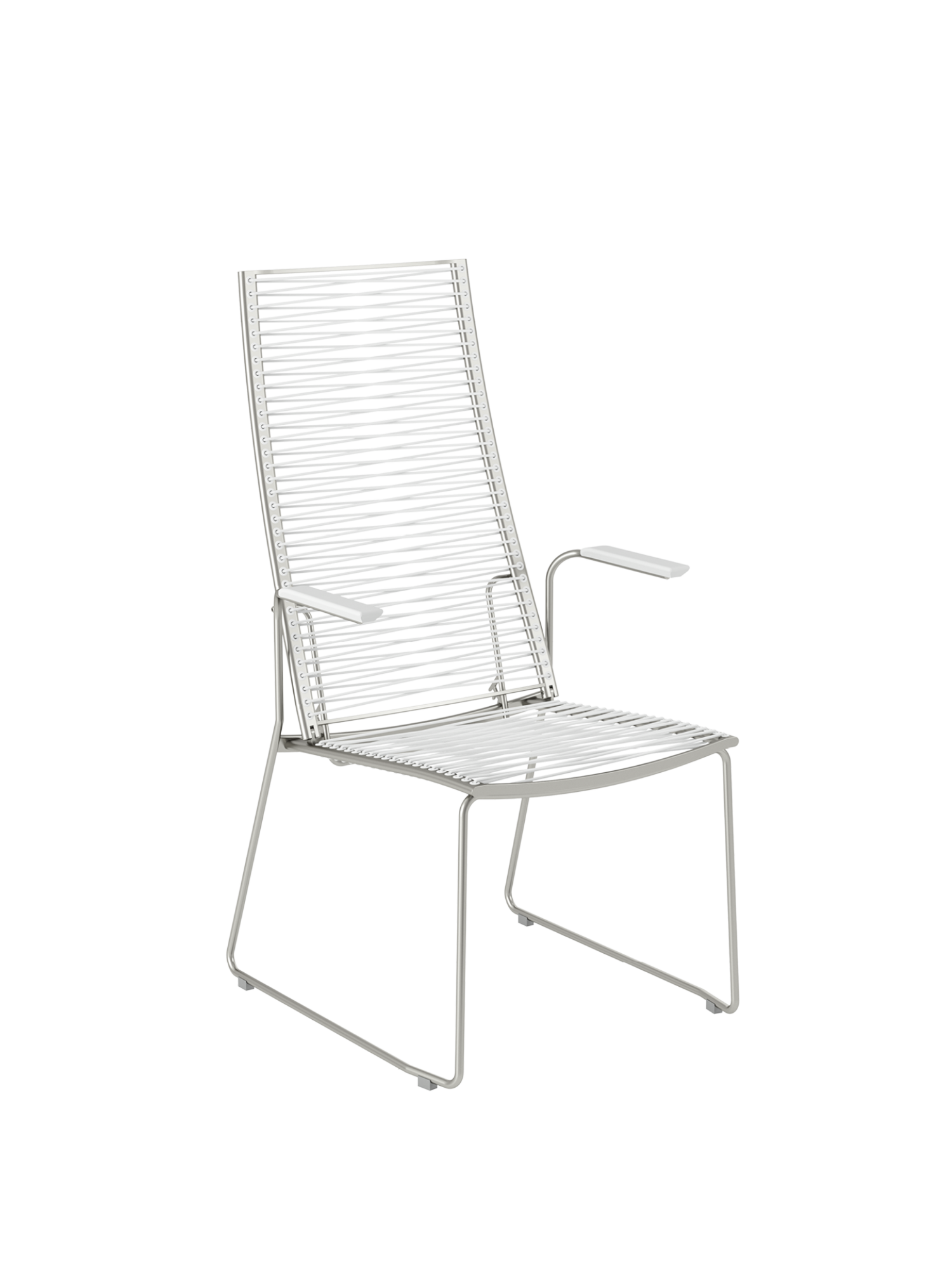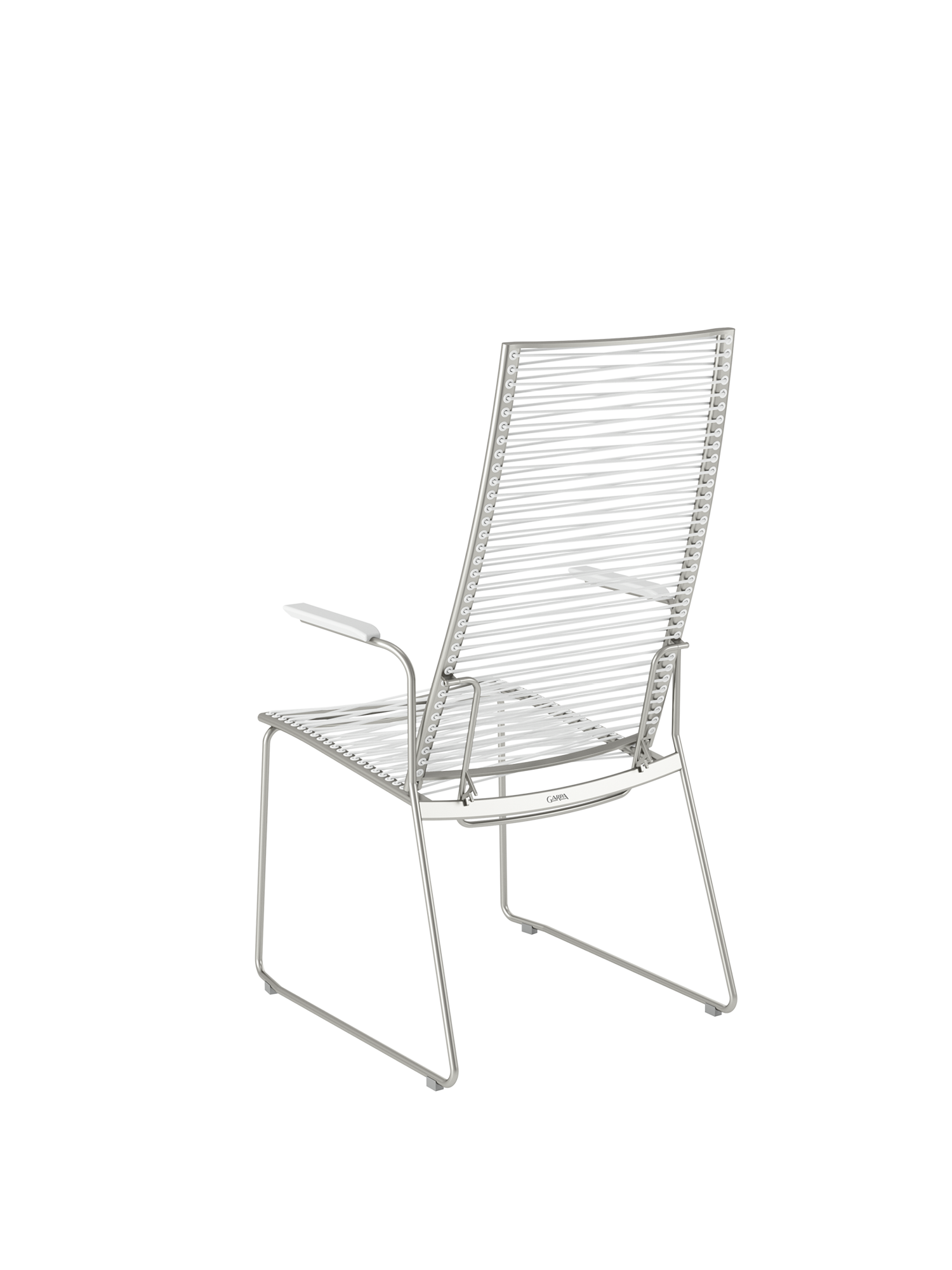 To ensure extra seating comfort for taller people, the backrest of the Pan Highback made of stainless steel and a synthetic weave in brown or white is especially high to support shoulders and head. A matching cushion with headrest is available separately.