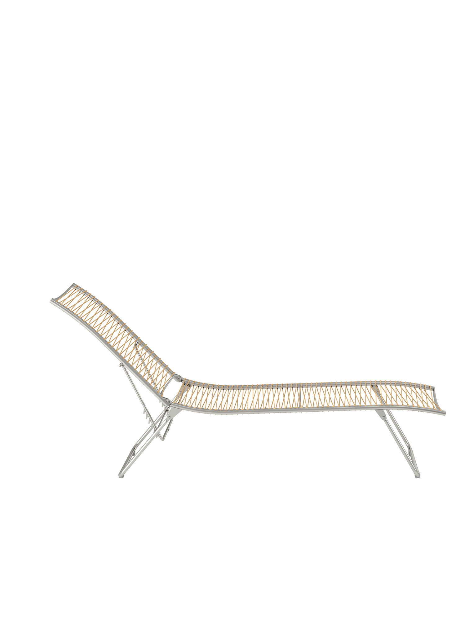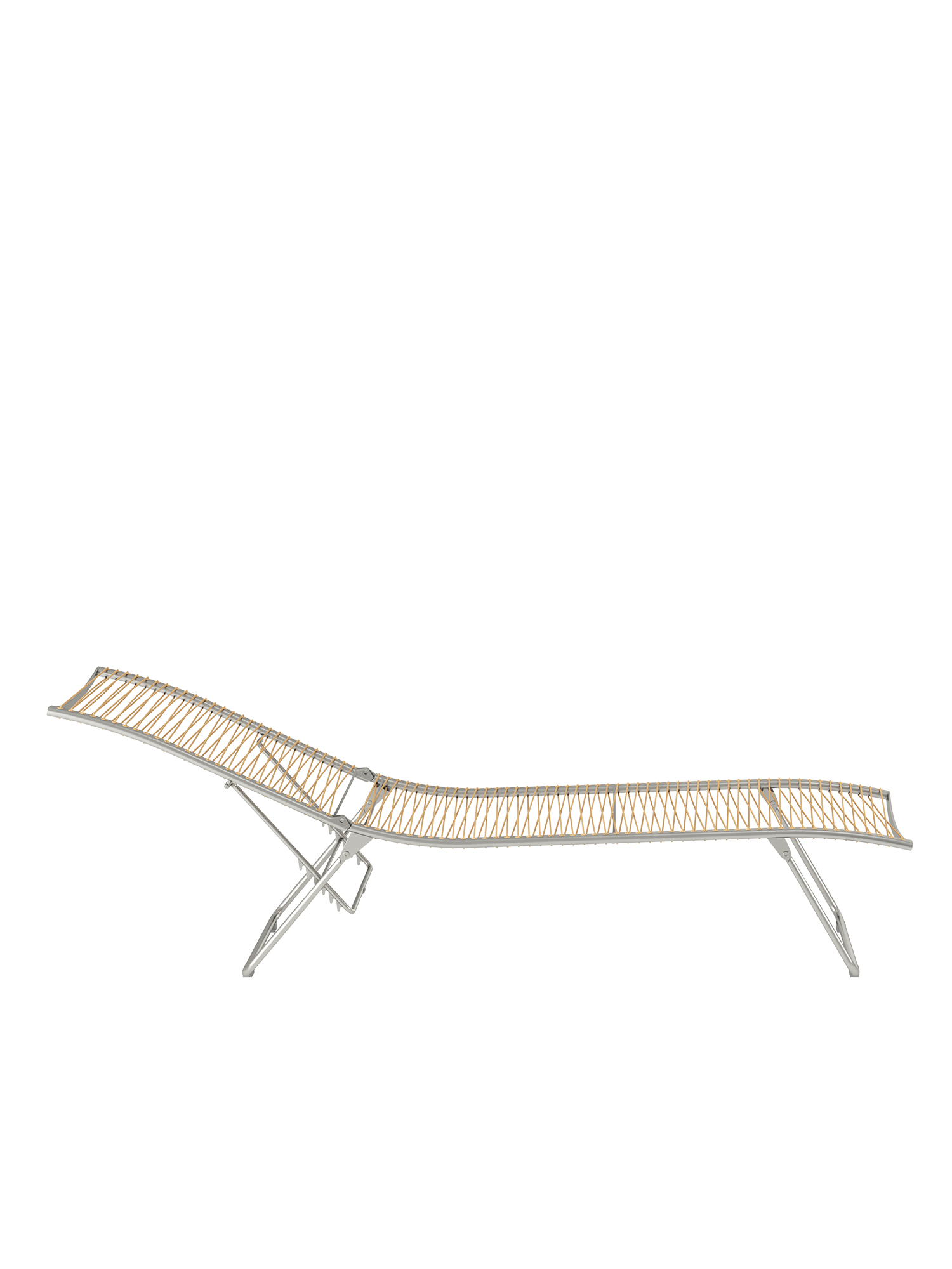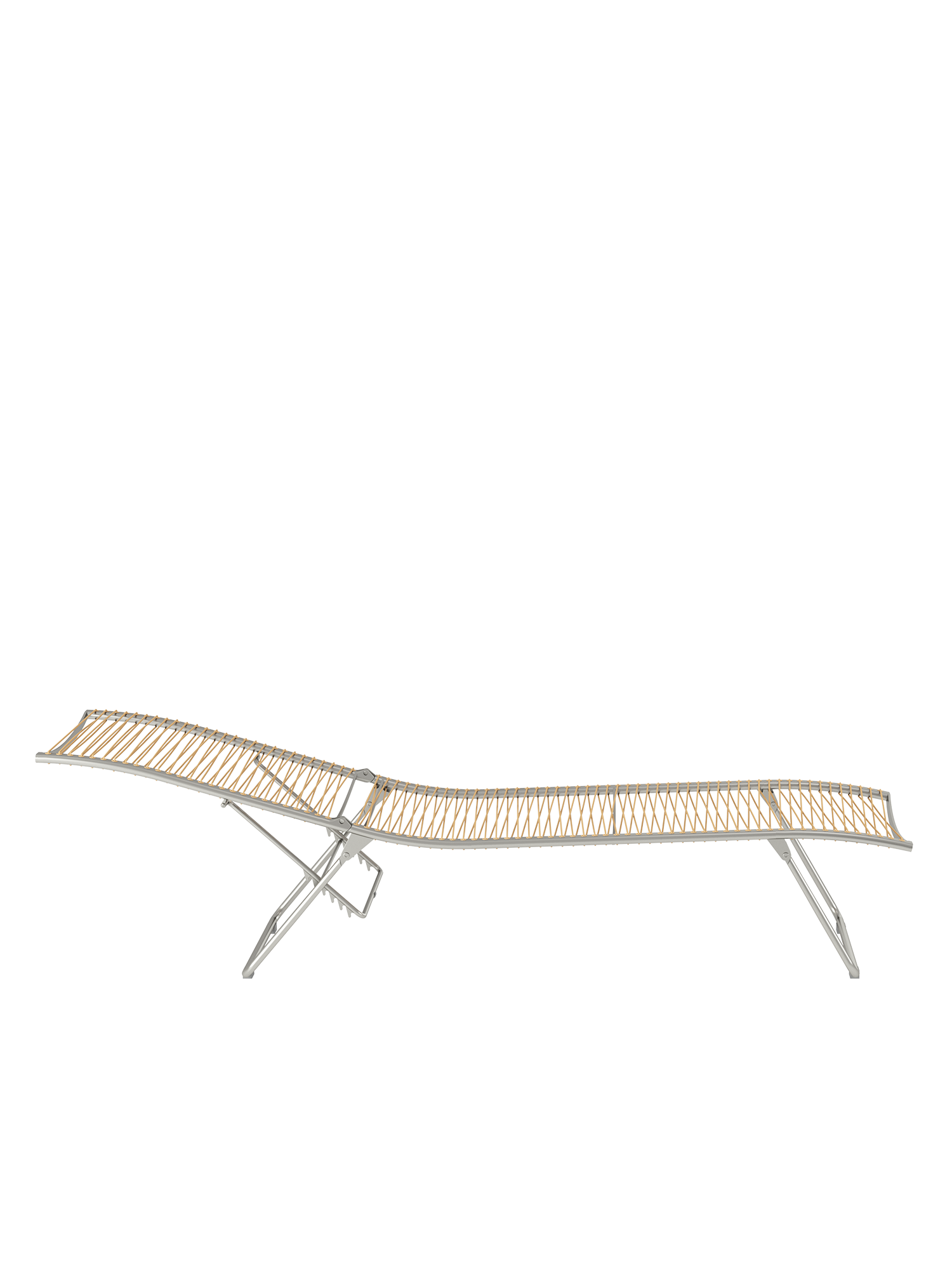 This lounger originated in the flow of a single curved line from the pen of the designer. The idea of it being foldable makes it perfect. The resilient, synthetic lacing on an elegant stainless steel frame adapts to the contours of the body. The backrest can be adjusted to six positions, making sunbathing face down possible.