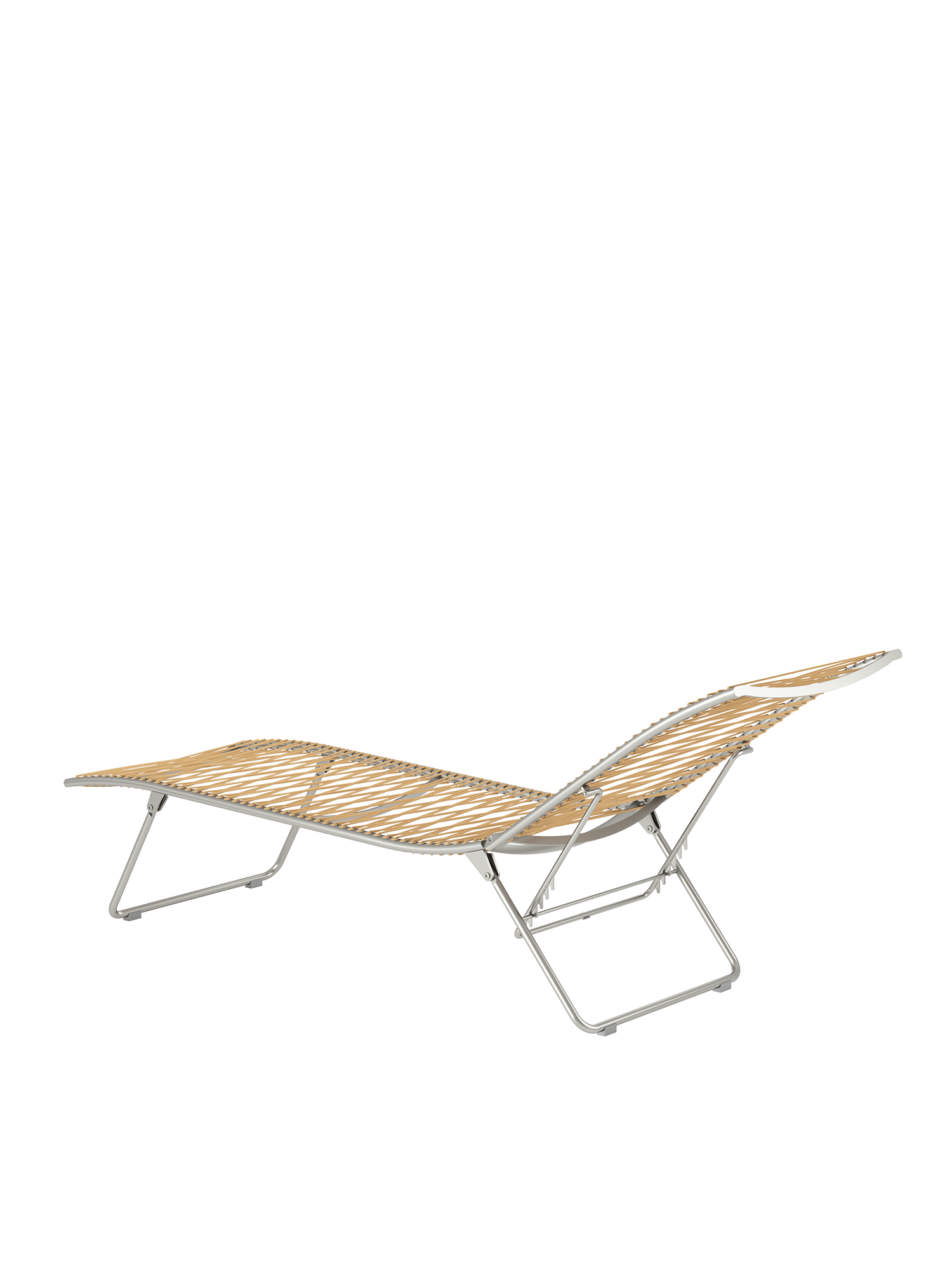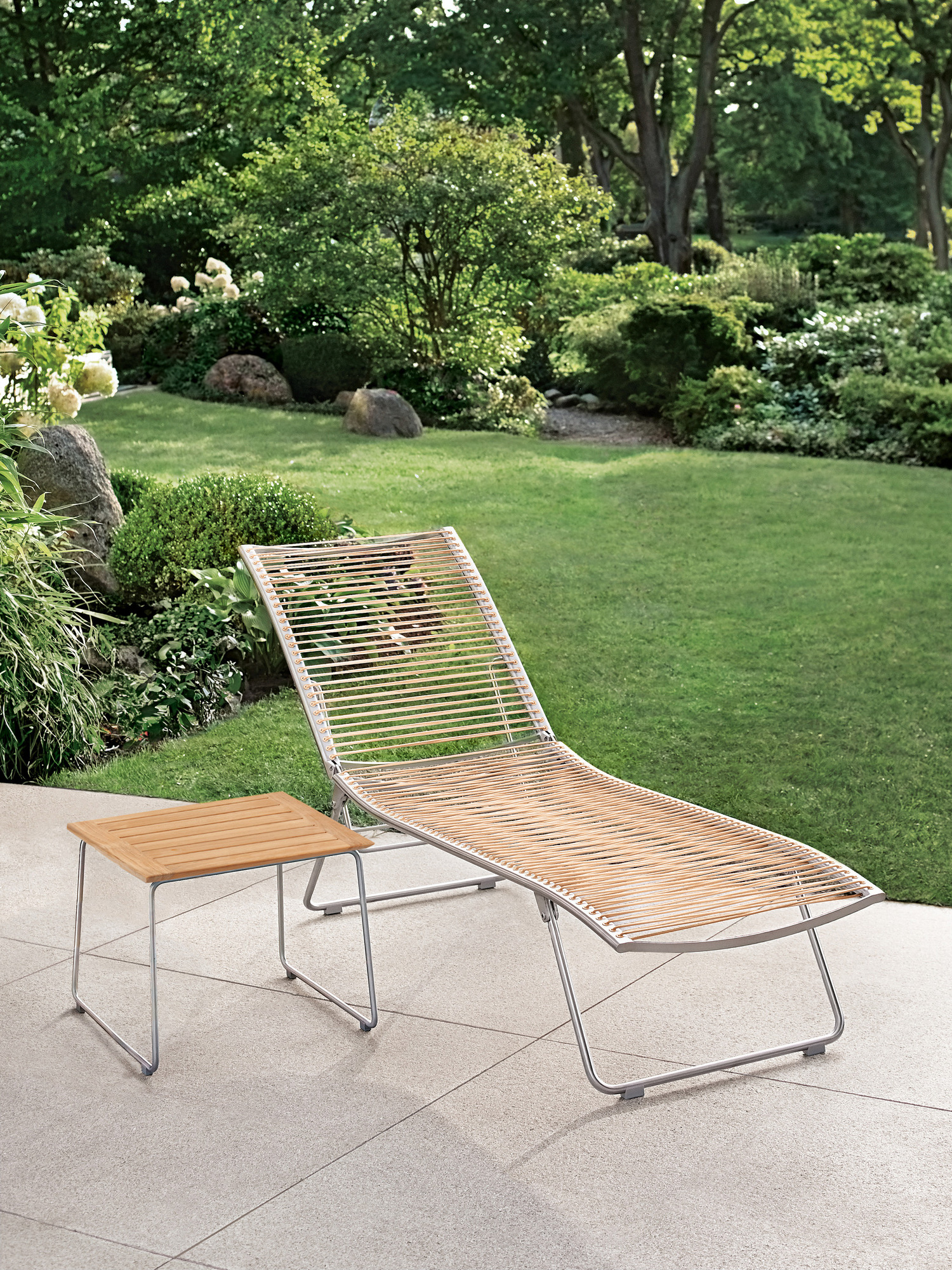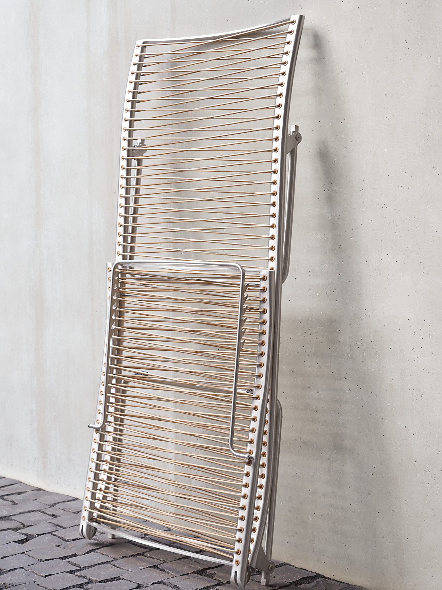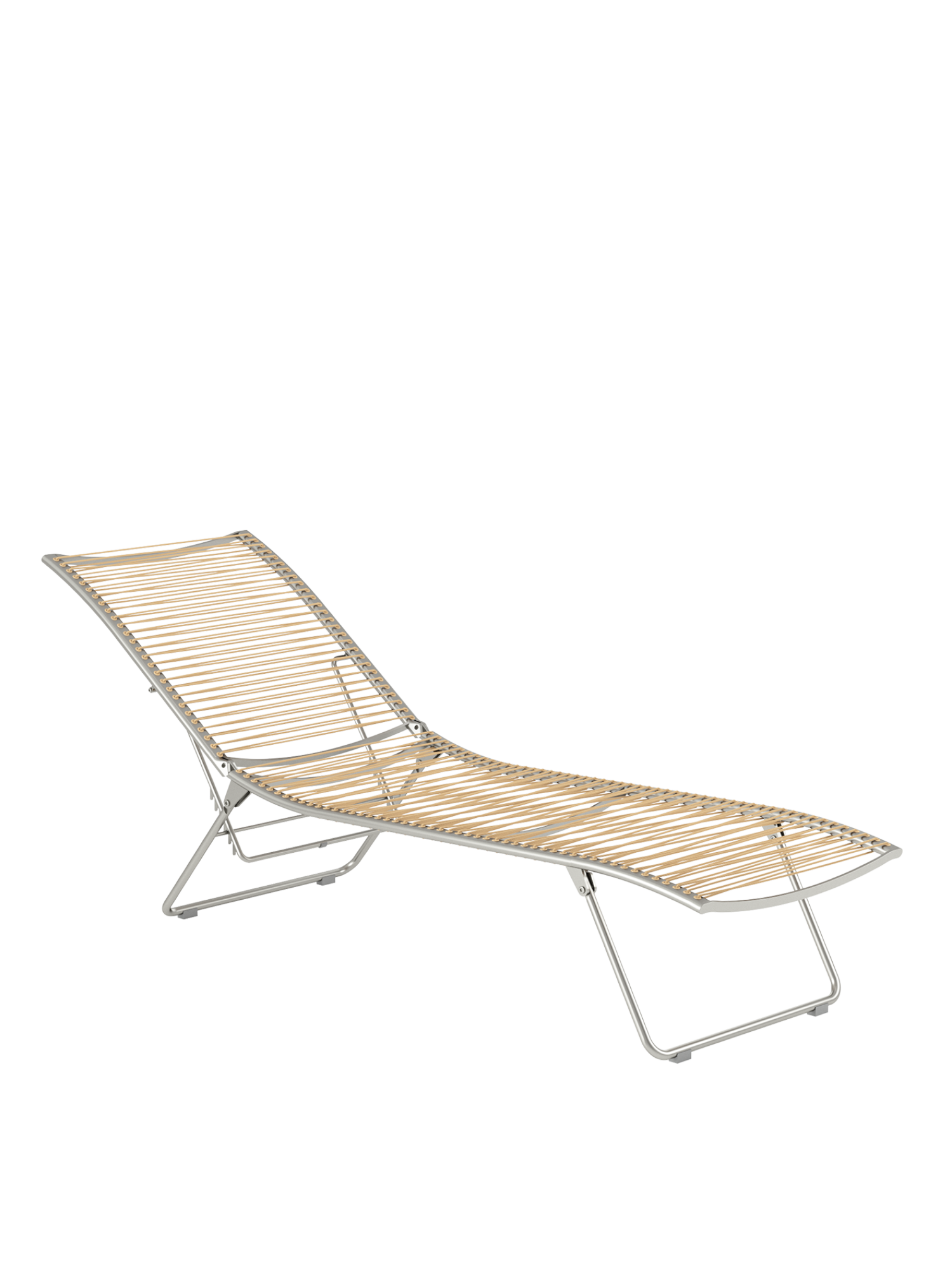 This lounger originated in the flow of a single curved line from the pen of the designer. The idea of it being foldable makes it perfect. The resilient, synthetic lacing on an elegant stainless steel frame adapts to the contours of the body. The backrest can be adjusted to six positions, making sunbathing face down possible.