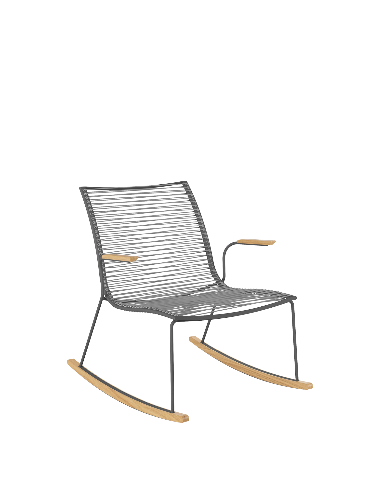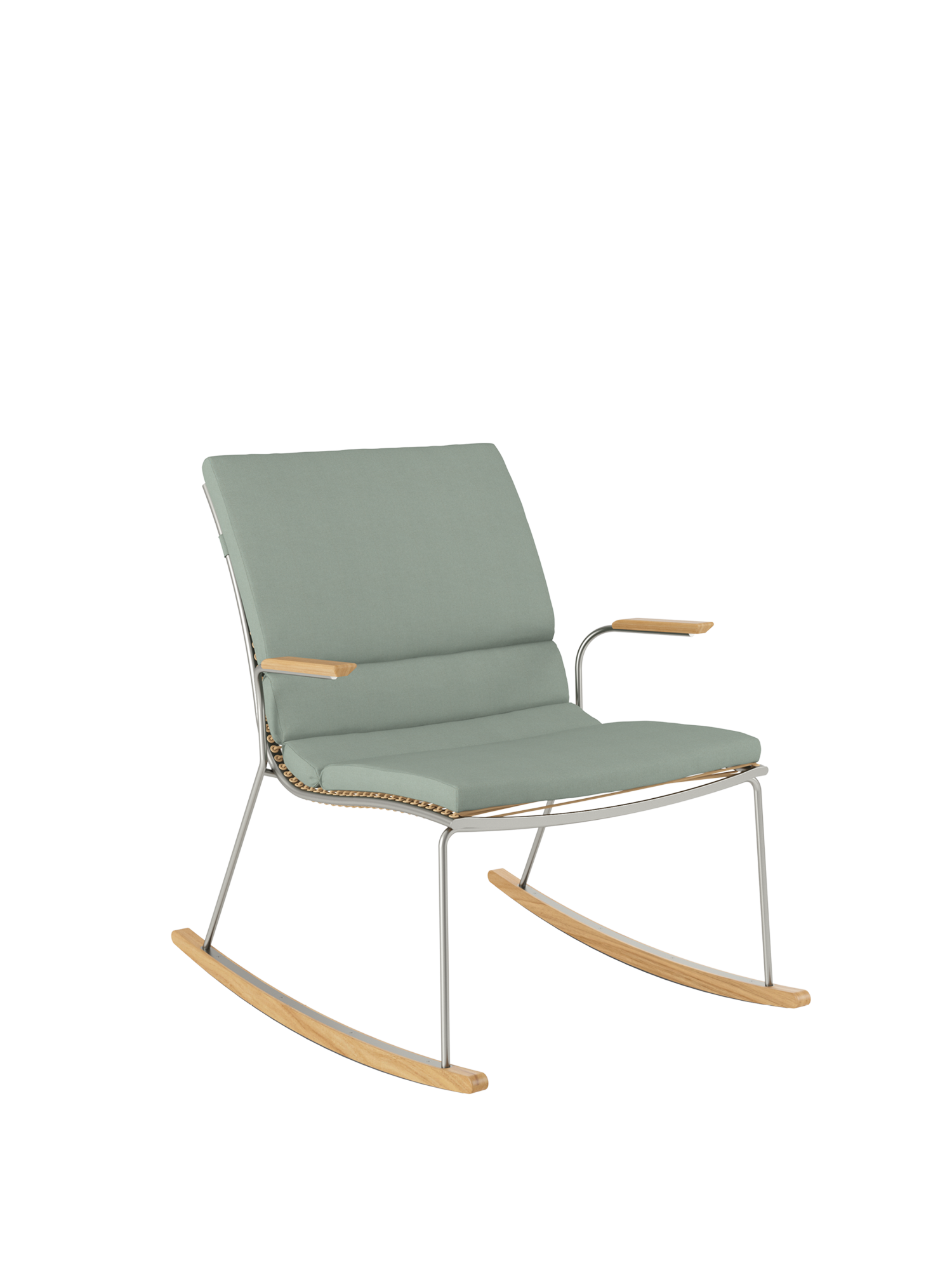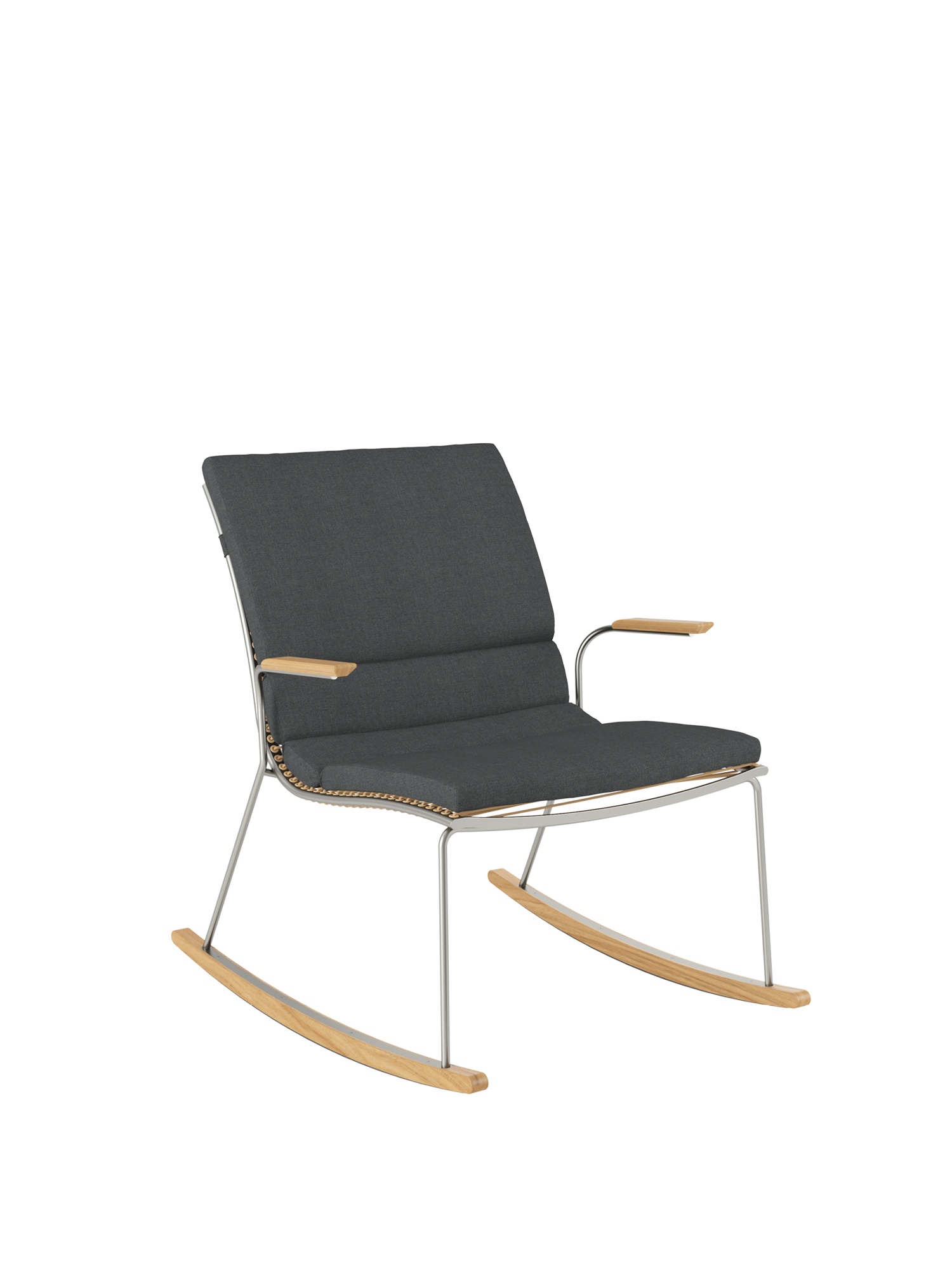 Converting kinetic energy into tranquillity is physically impossible, but this is exactly the purpose of the rocking chair: in delicate Pan design, with slender teak runners and armrests, a gentle swinging motion induces a deep feeling of restfulness. For carefree rocking, a protective strip of synthetic material is attached under the runners.