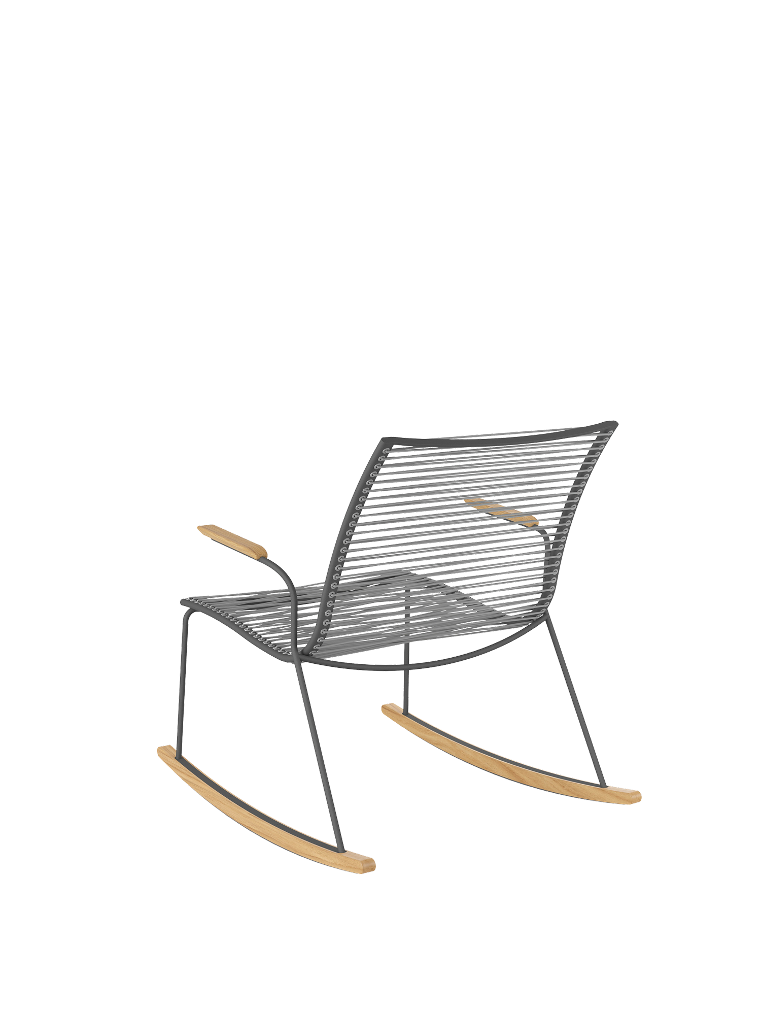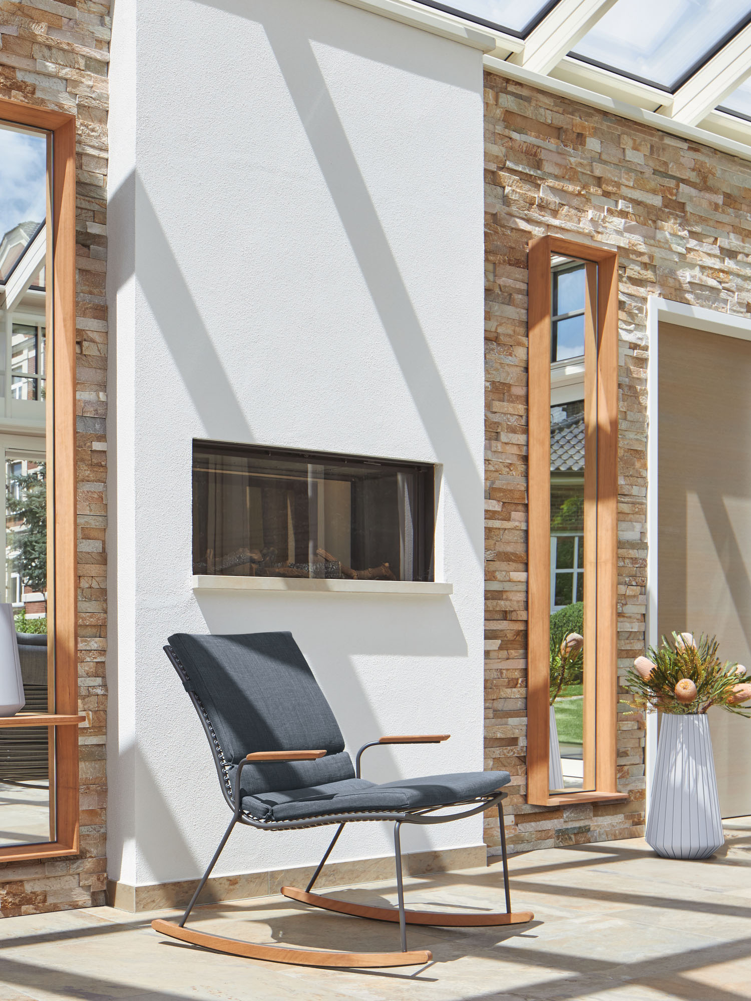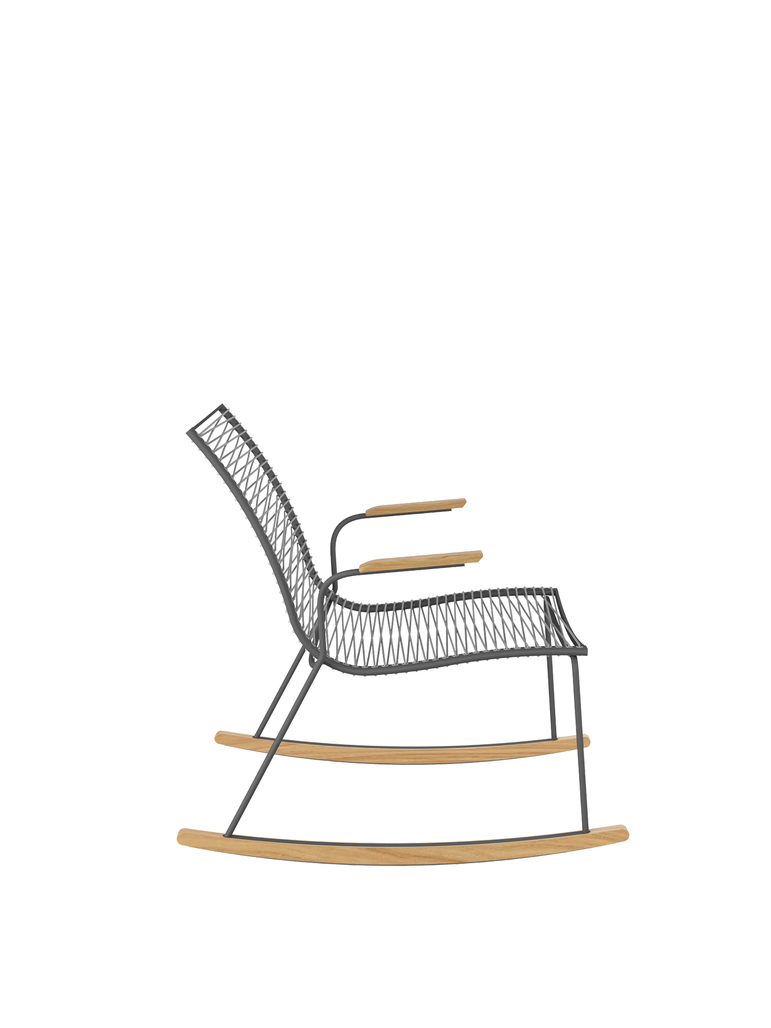 Converting kinetic energy into tranquillity is physically impossible, but this is exactly the purpose of the rocking chair: in delicate Pan design, with slender teak runners and armrests, a gentle swinging motion induces a deep feeling of restfulness. For carefree rocking, a protective strip of synthetic material is attached under the runners.