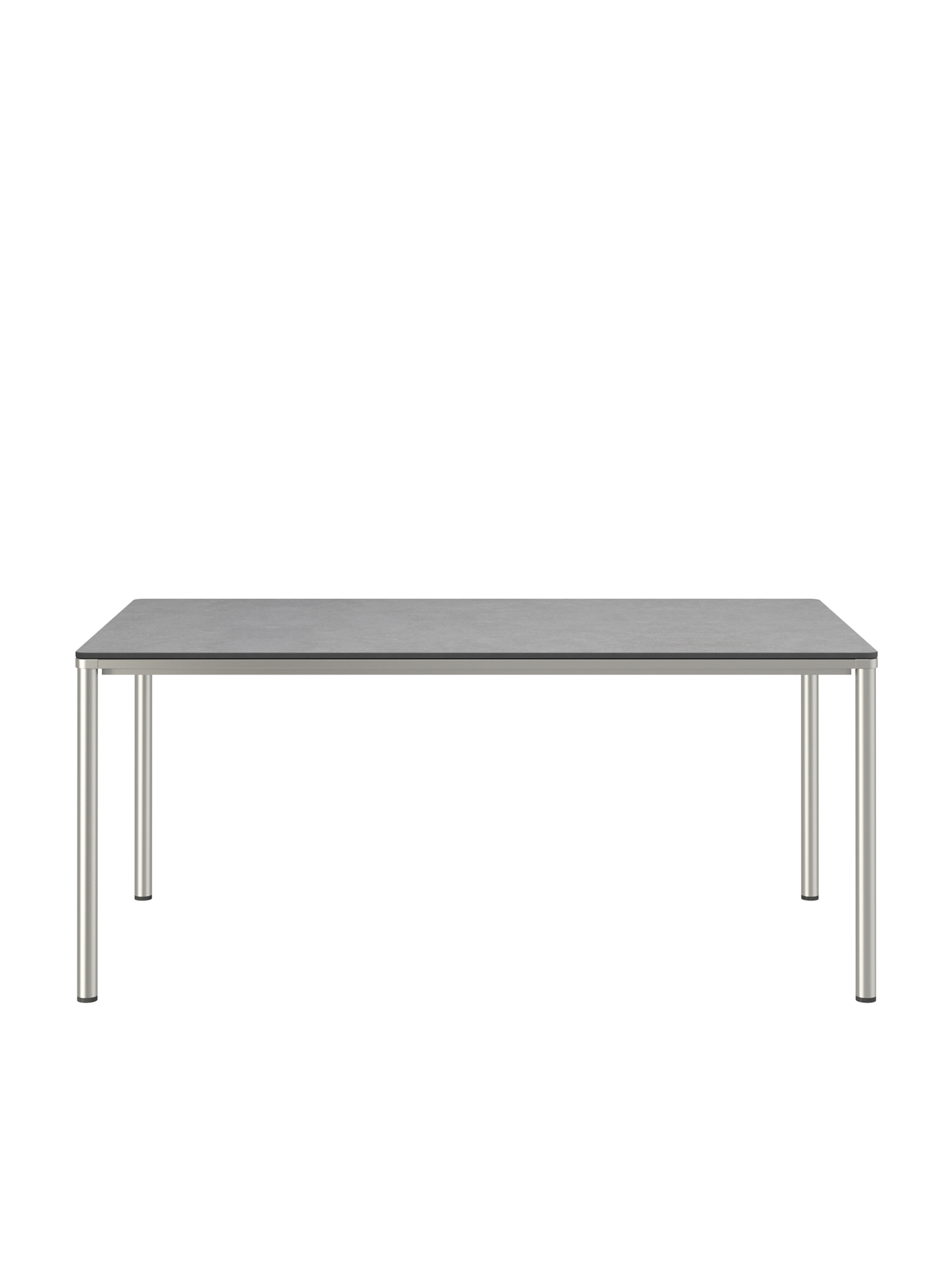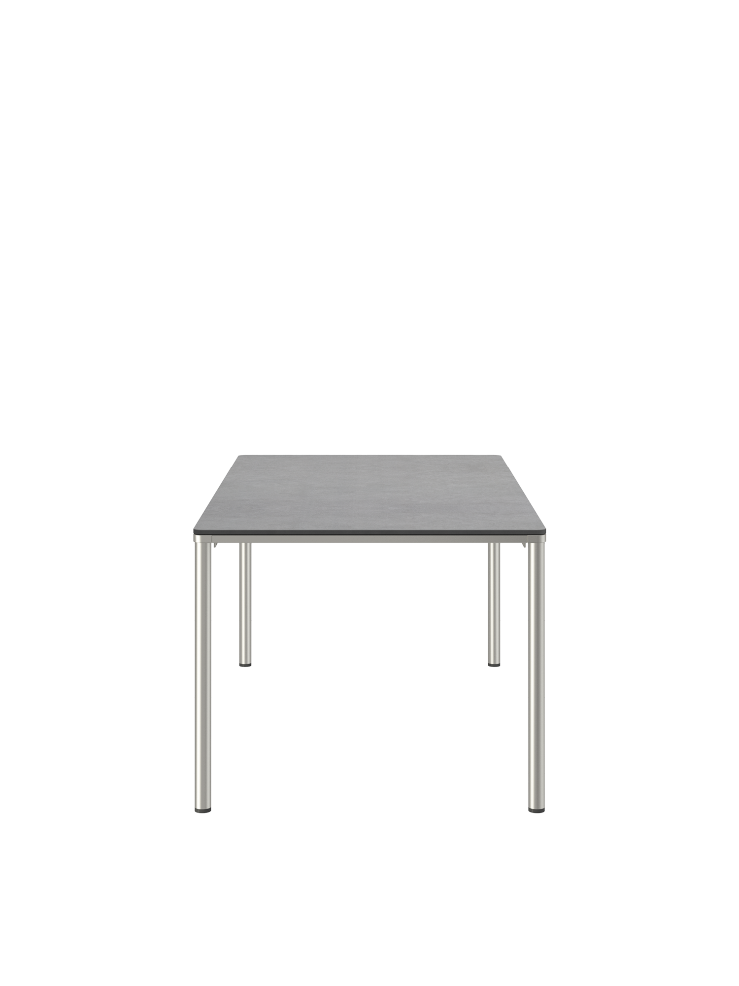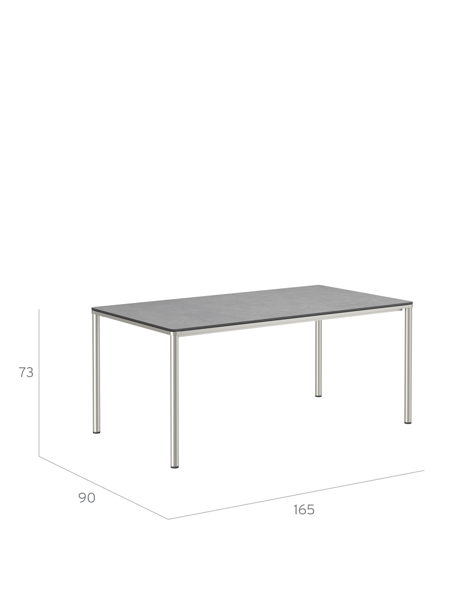 The satinised steel frames of the Portland tables allow them to be combined with all chairs of the same material. Four slender legs carry a top with a frame that appears to be made of a single piece, and that follows the rounding of the legs in the corners. The surface is made of high-quality synthetic resin.
