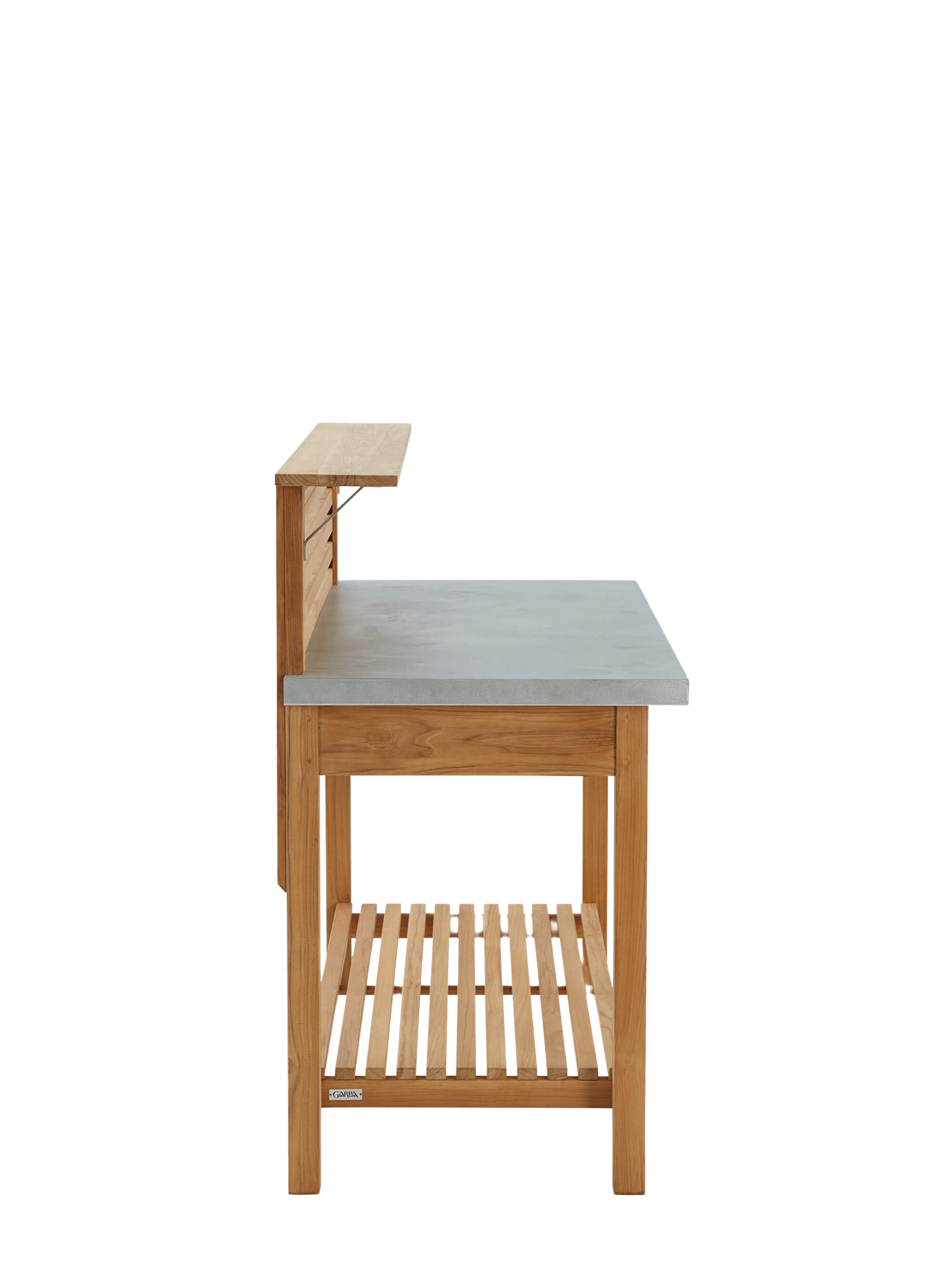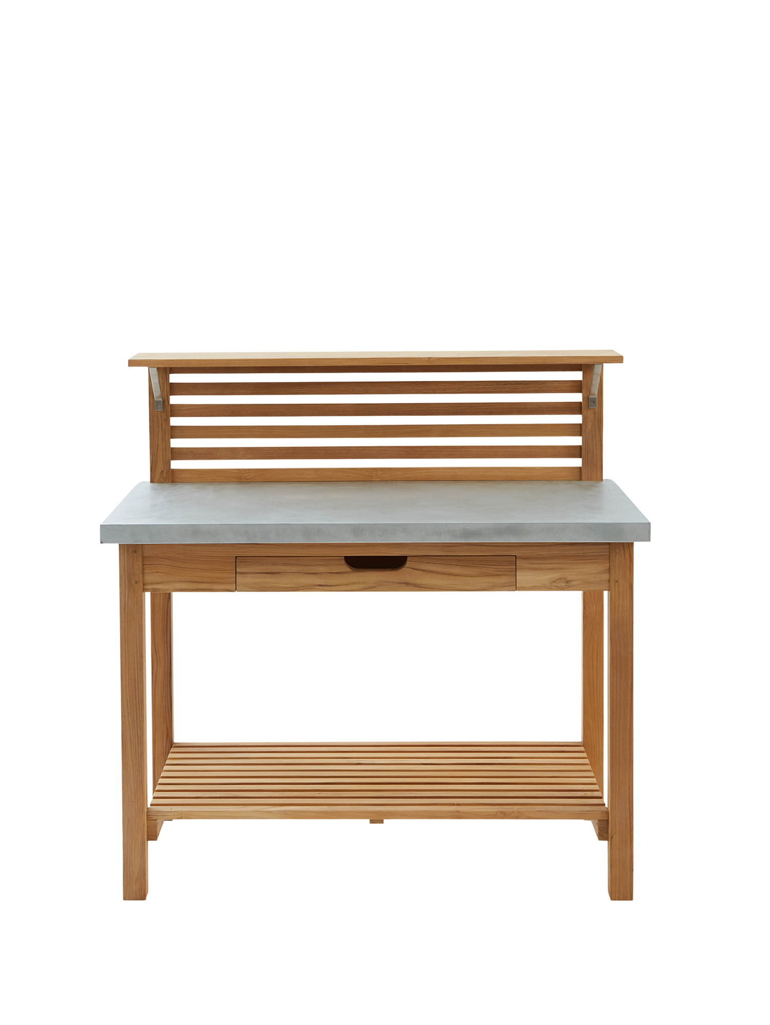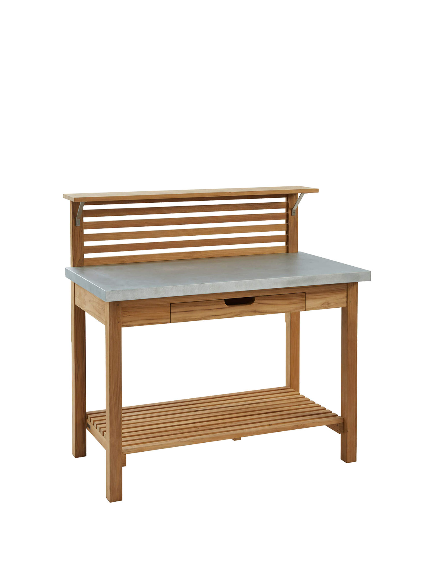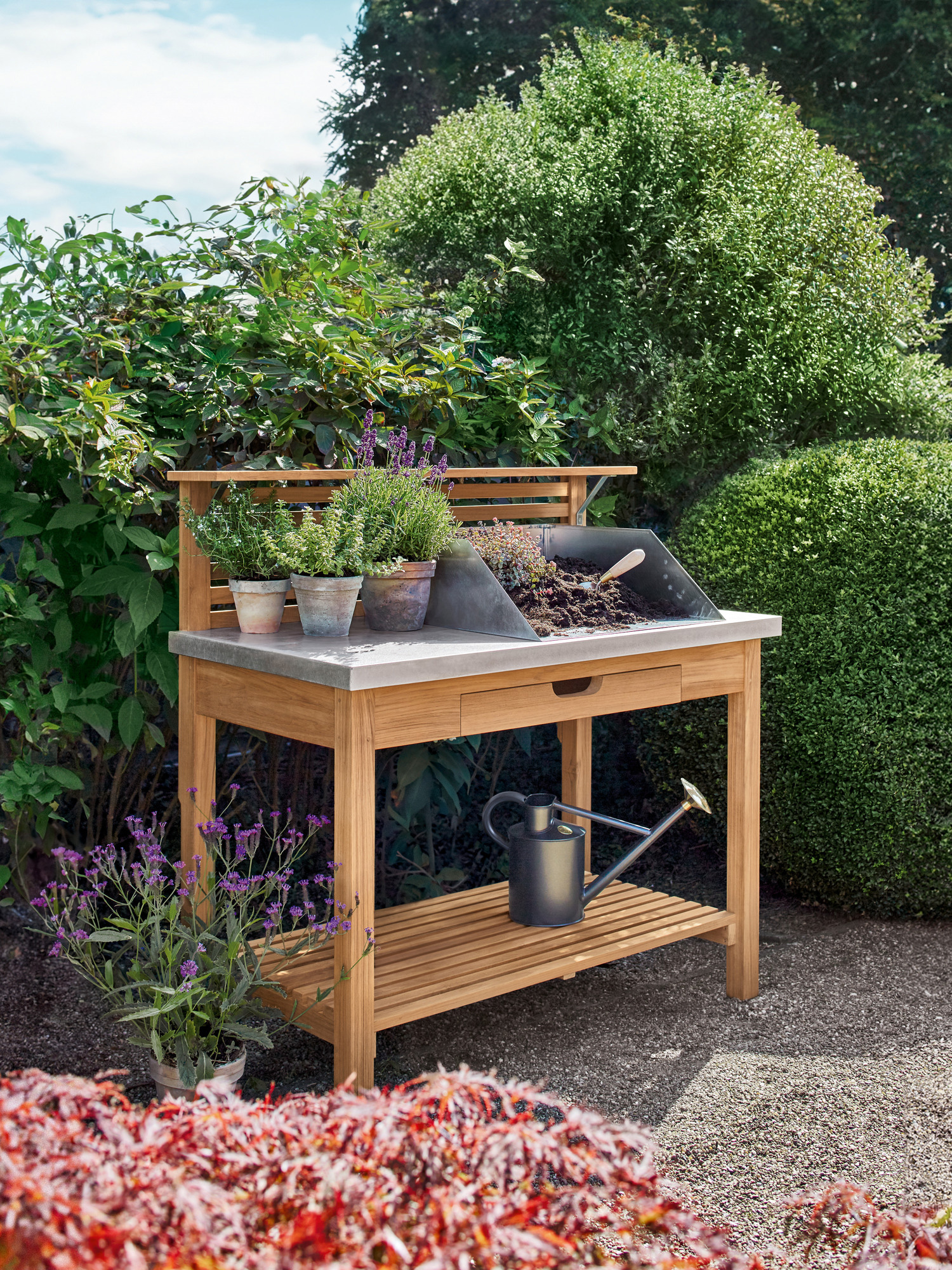 The famously known 'potting bench' is of weatherproof teak and covered in zinc, which prevents contamination by bacteria when pricking-out and planting. A small shelf as well as the slatted surface underneath provide storage space. A drawer is a convenient place for seed packets and small tools. A bowl of titanium zinc for mixing soil is included in the delivery.