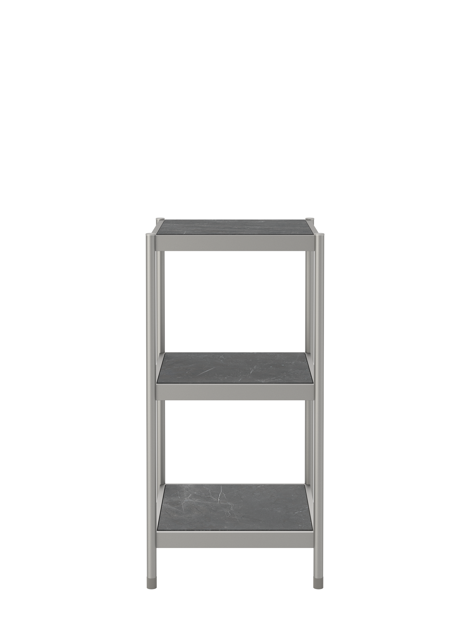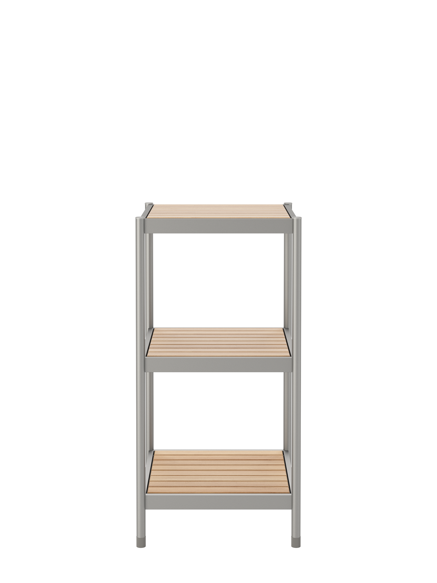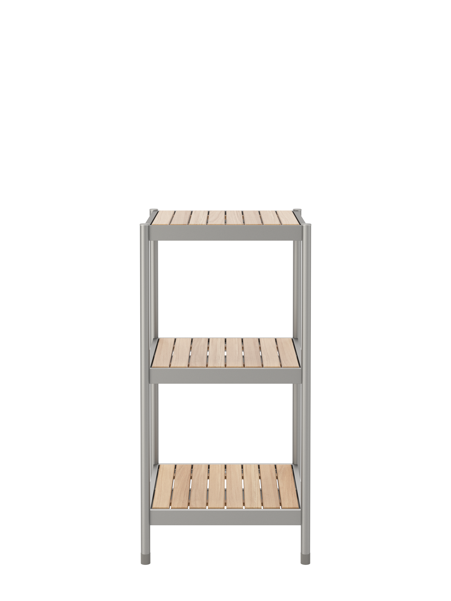 The weatherproof garden shelving module made of anodised aluminium blends harmoniously into any environment with its minimalist design and gently shifting colour nuances. As a solitaire, a slender element in a row or as a corner solution, it can be combined with other modules from the Rana collection, as desired. It offers practical storage space for crockery, accessories or utensils for the outdoor kitchen on three levels, with a choice of shelves in different materials. The shelves have to be ordered separately. Height adjusters on the legs level out any unevenness in the flooring.