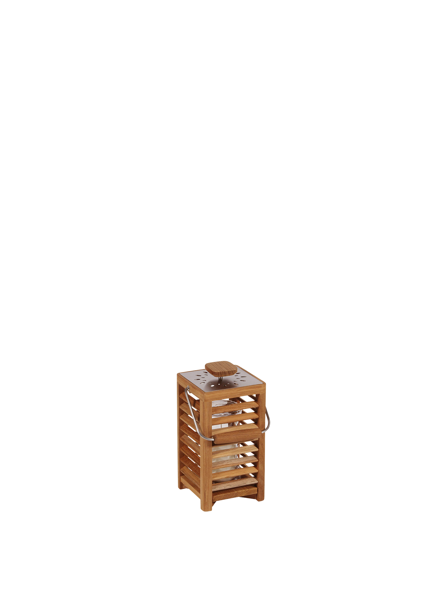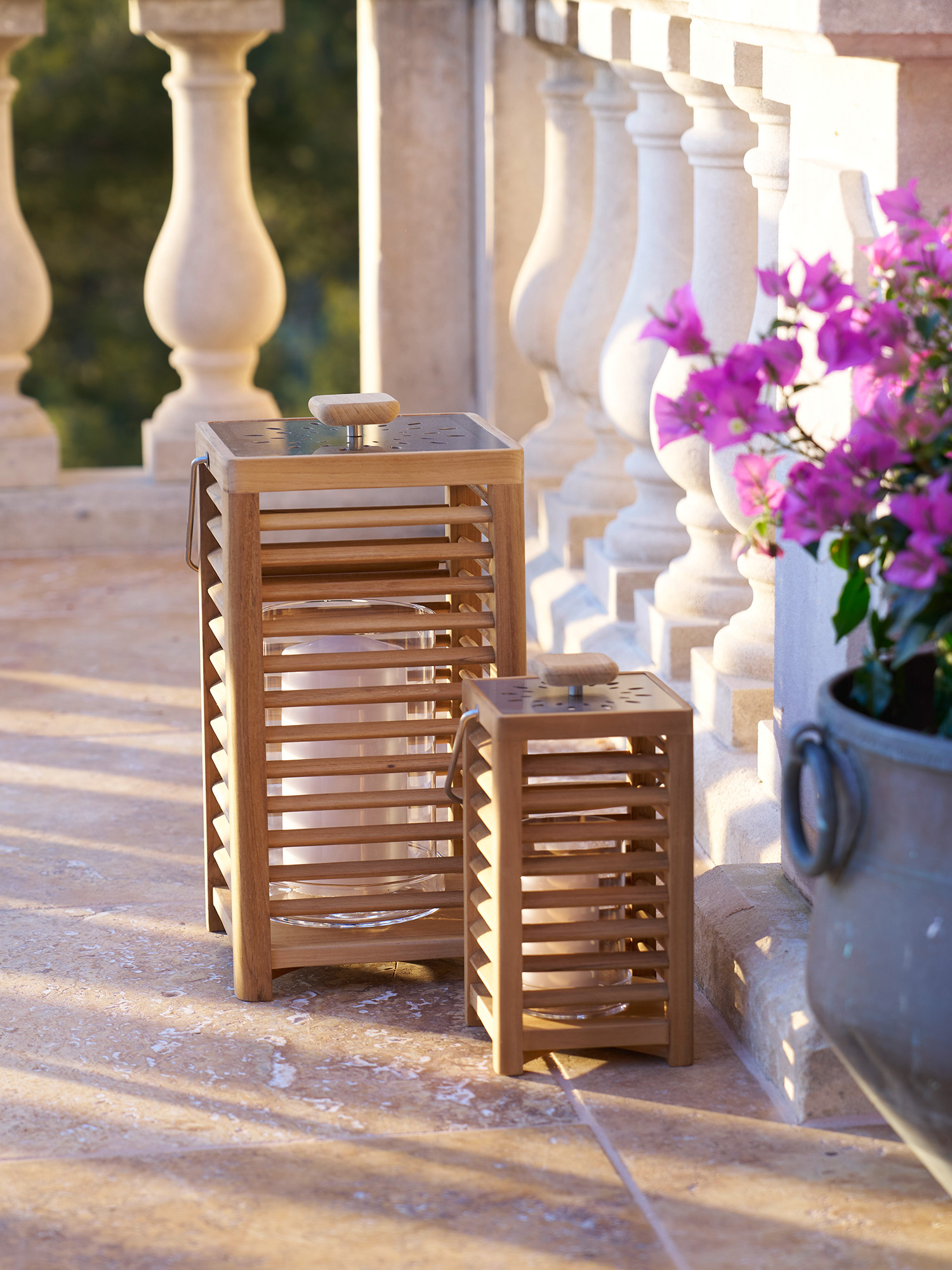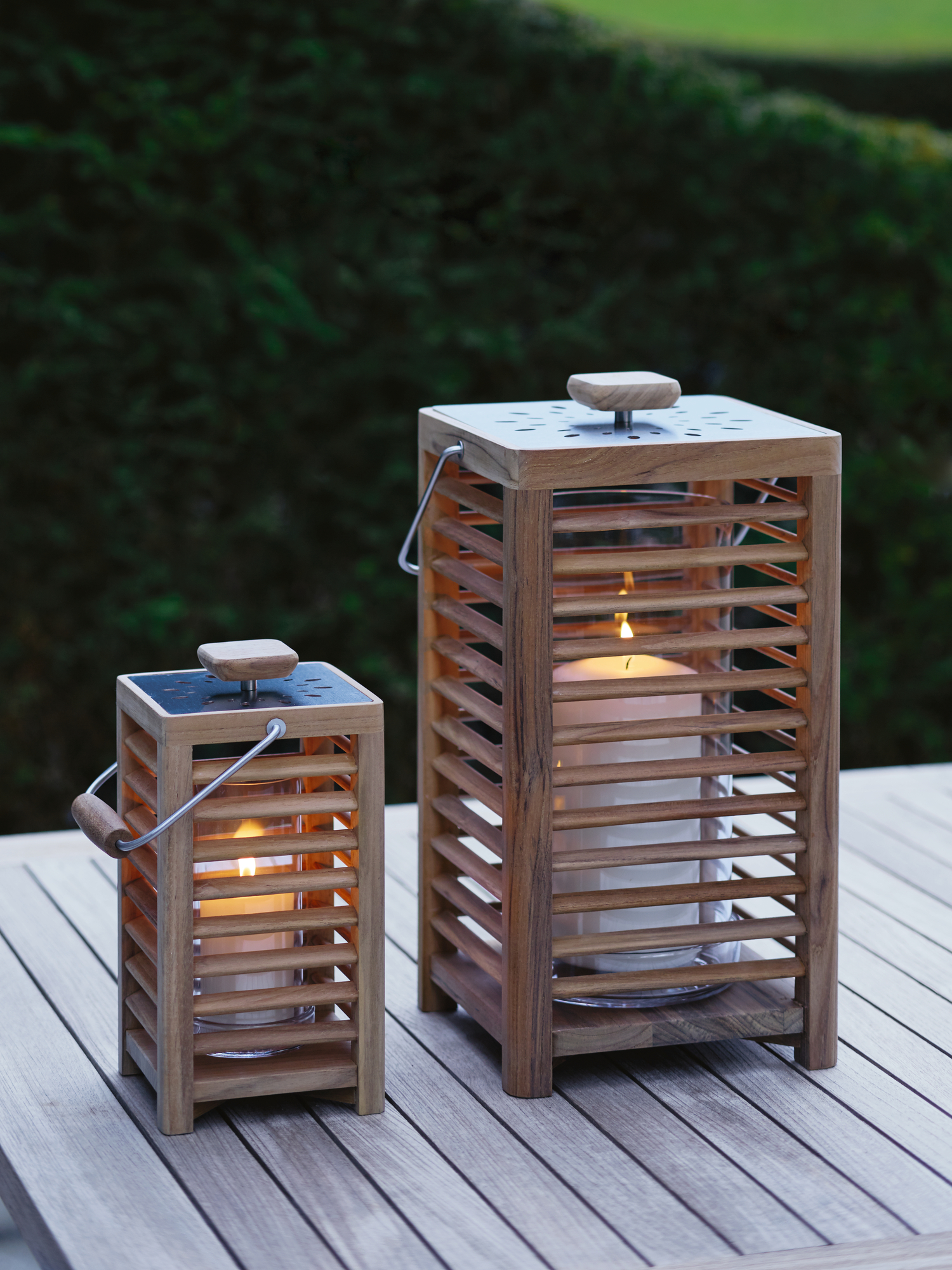 Available in two sizes, the unique design of the lanterns is defined by straight lines. A removable glass cylinder inside the lantern protects the candle light that creates special effects thanks to the gently downward sloping slats.