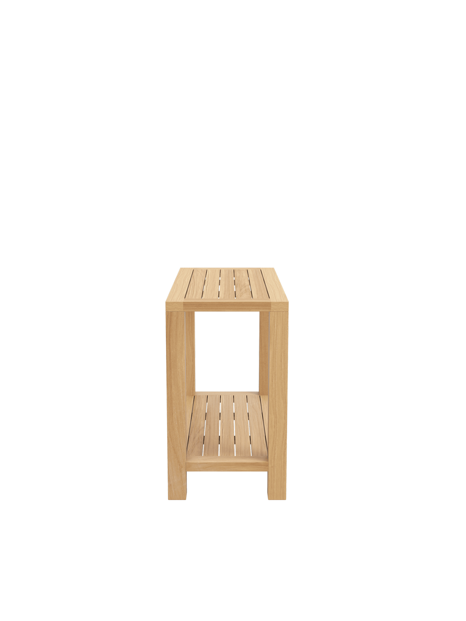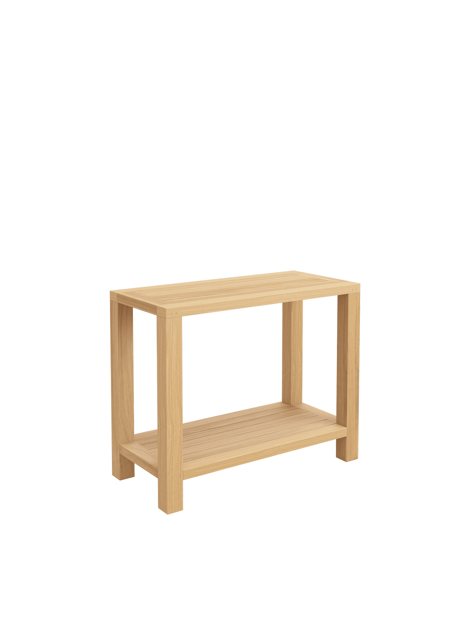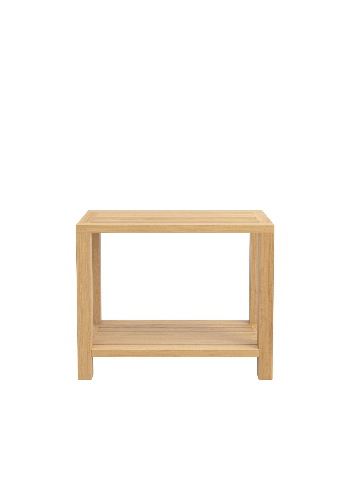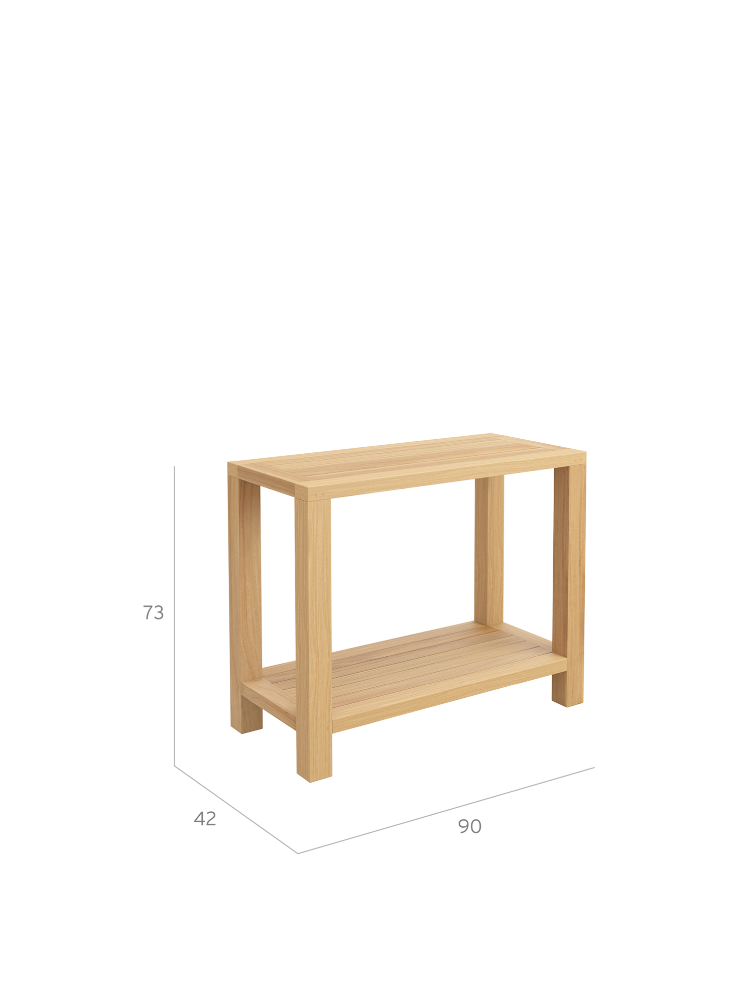 The modern look of the spacious square table complements the lighter teak series. The clean lined Console Table provides space for tableware or accessories on two levels, is easily drawn up and is an elegant addition.