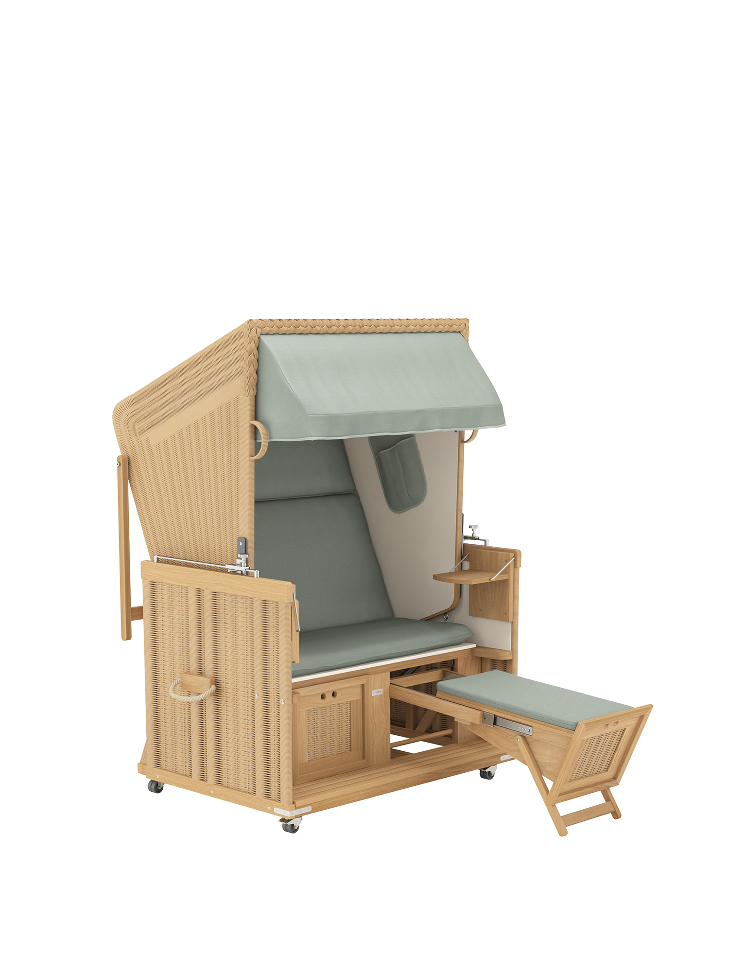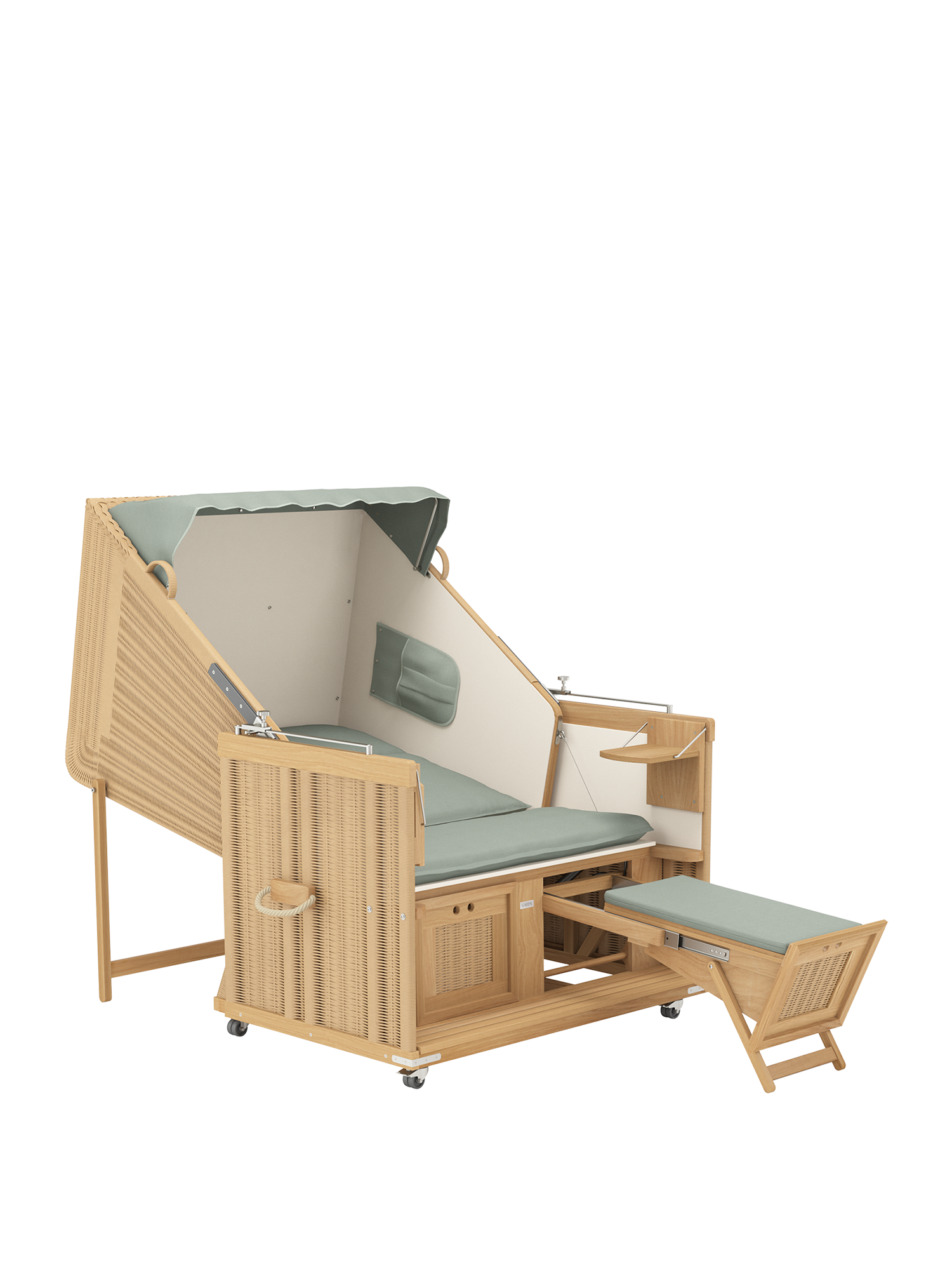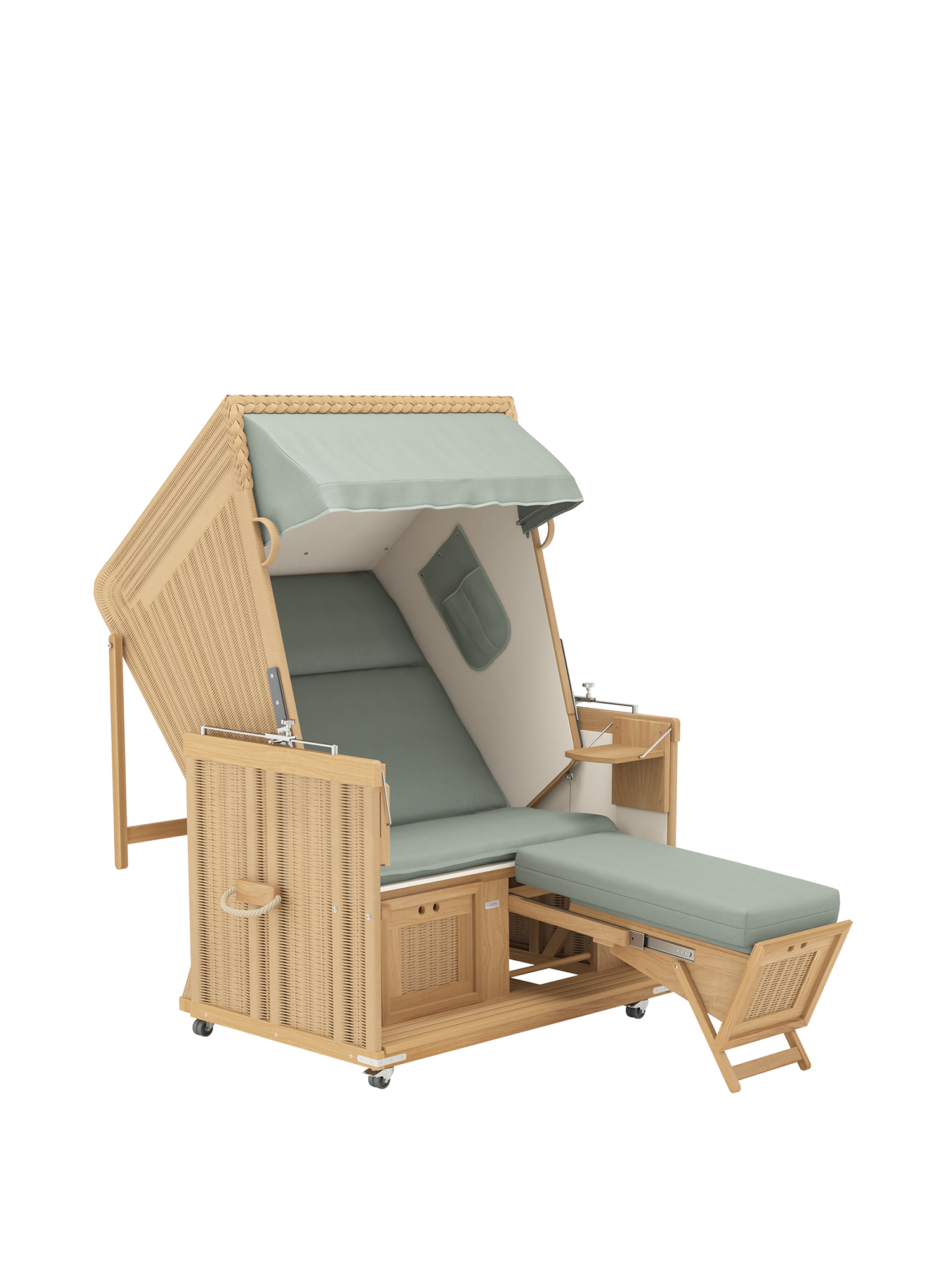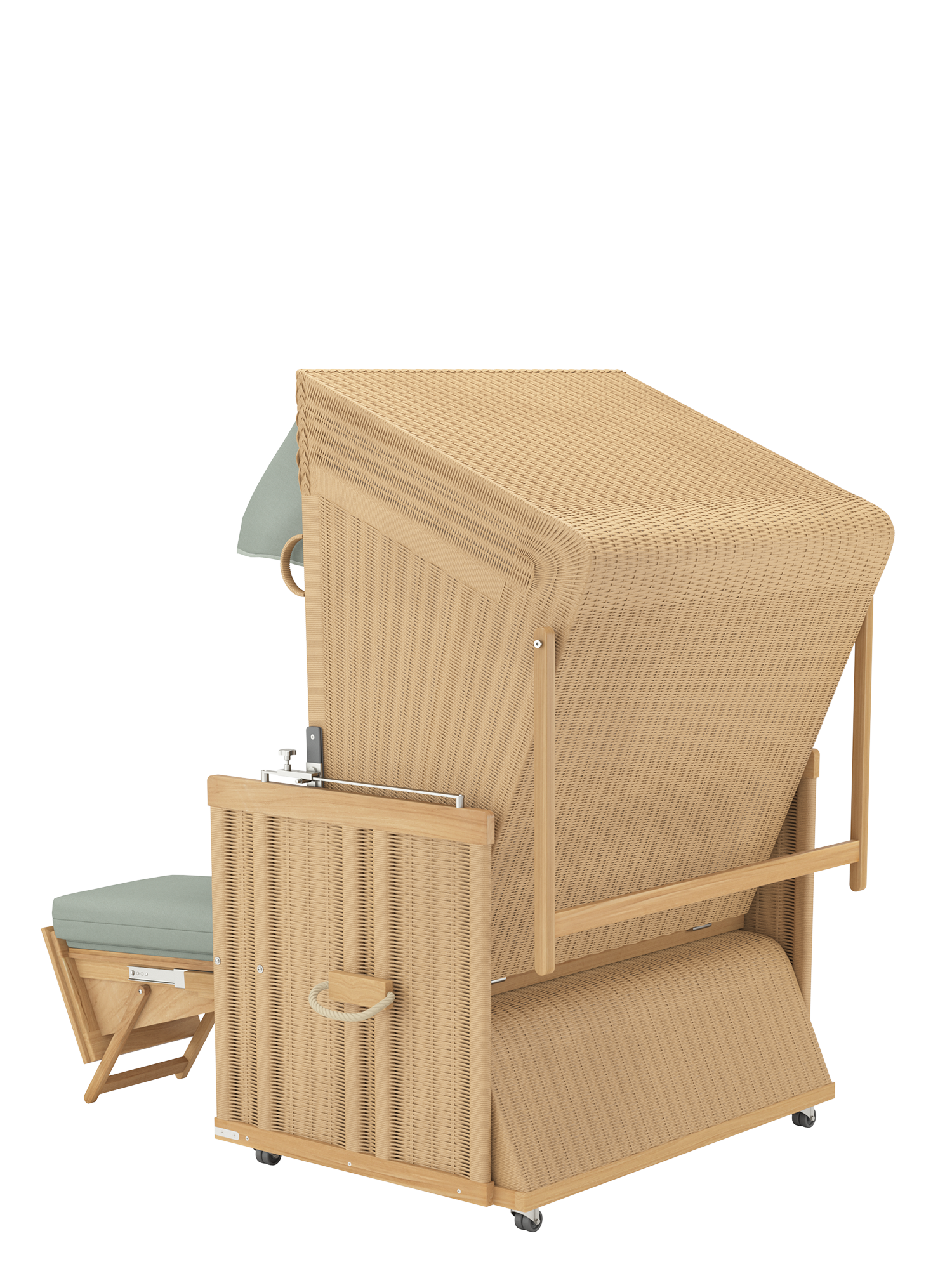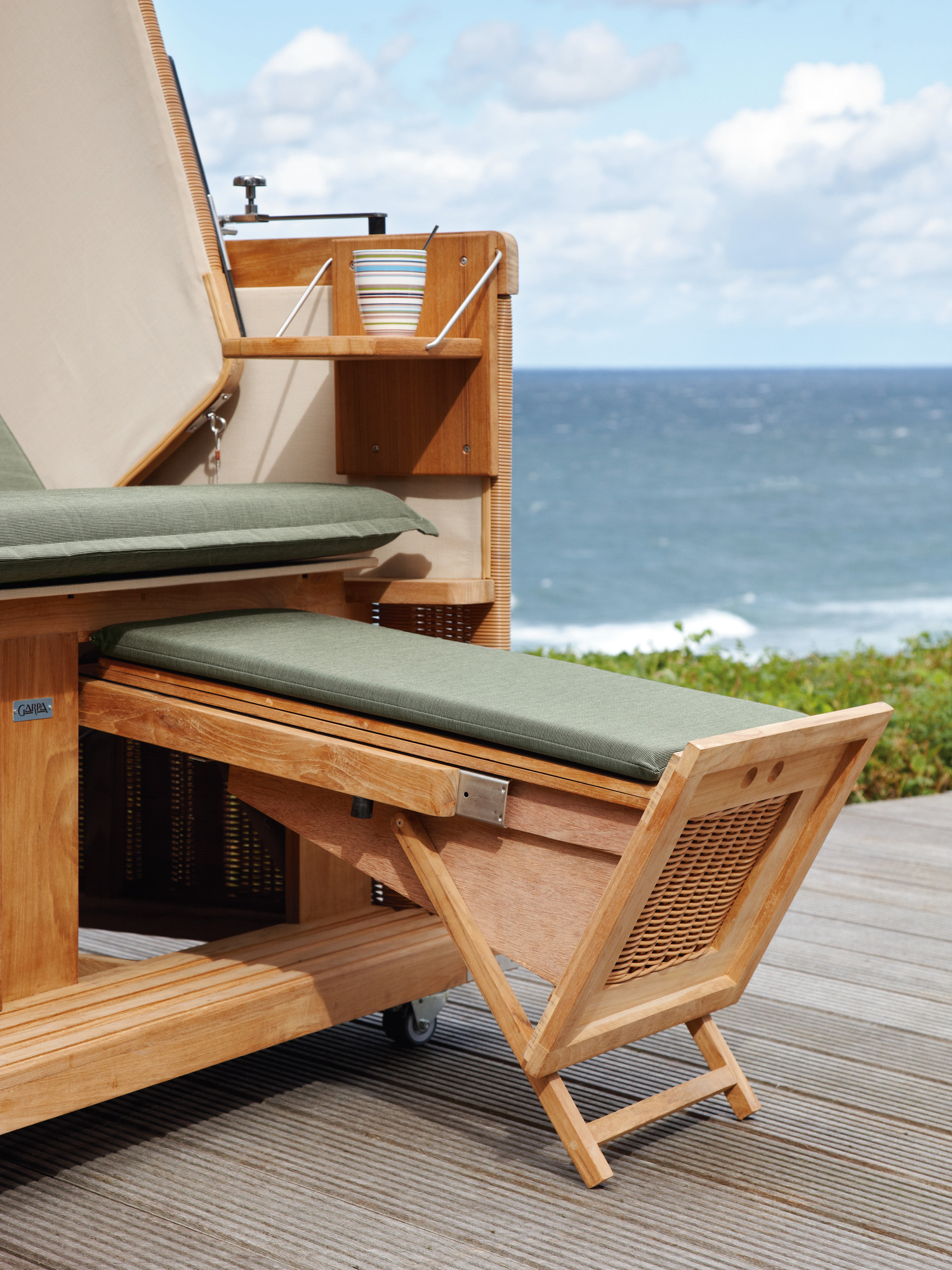 The roomy, upholstered seat of the Strandkorb is variably adjustable and can be made into a completely flat, double lounger. Thanks to a recoil spring, the Strandkorb can be effortlessly raised with two handles.