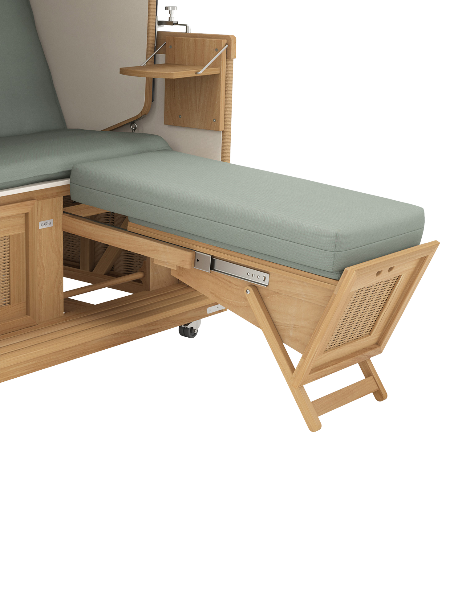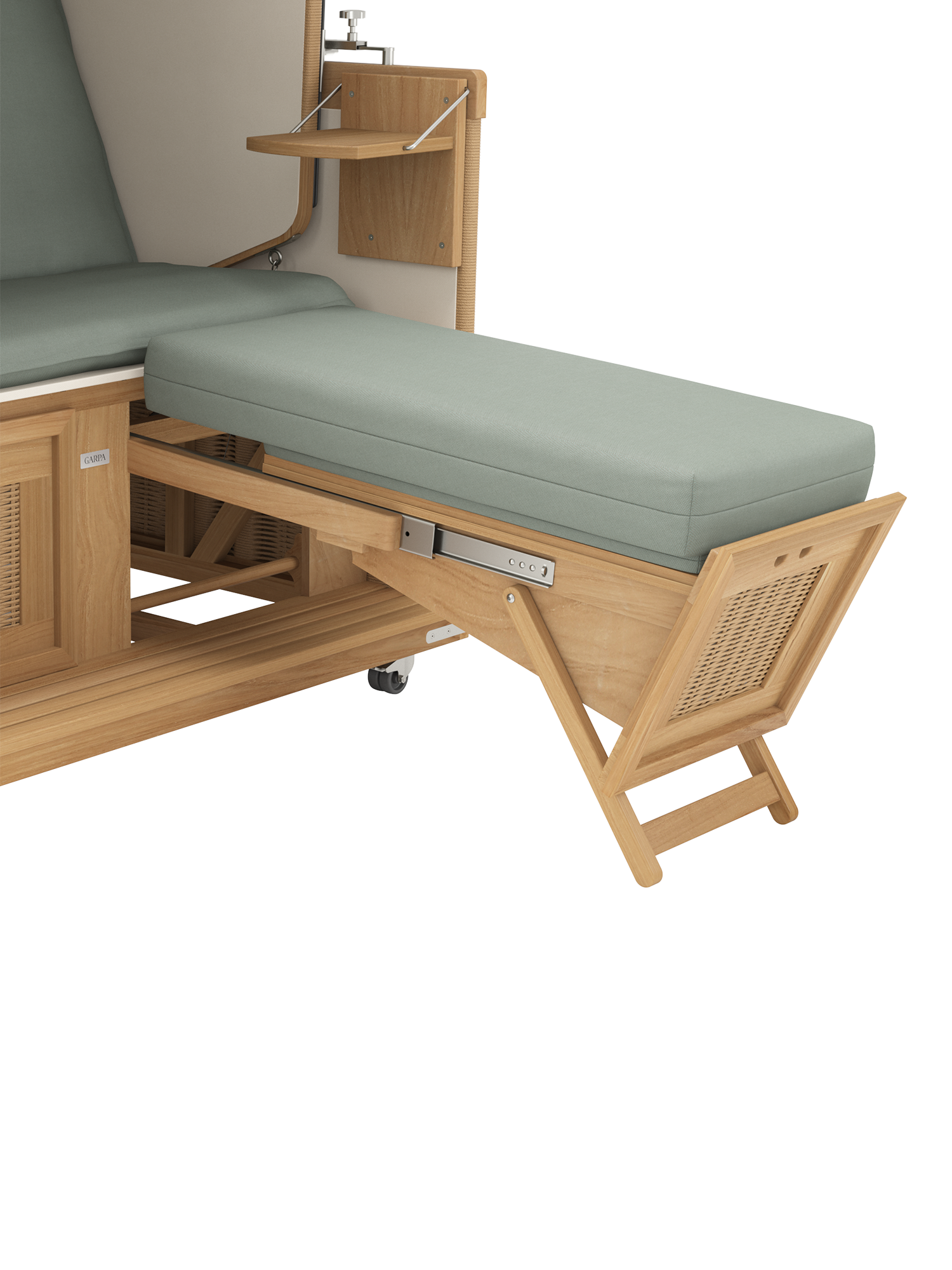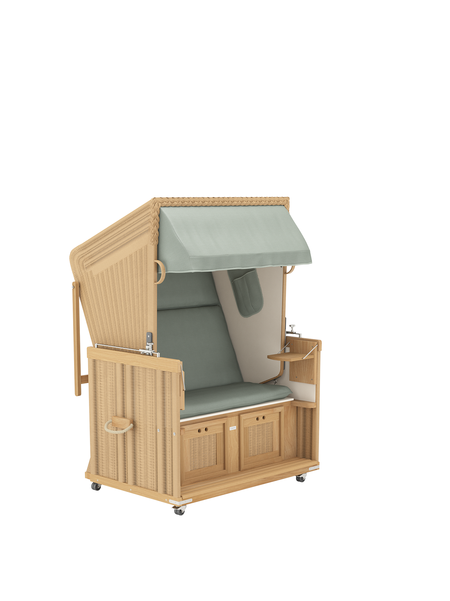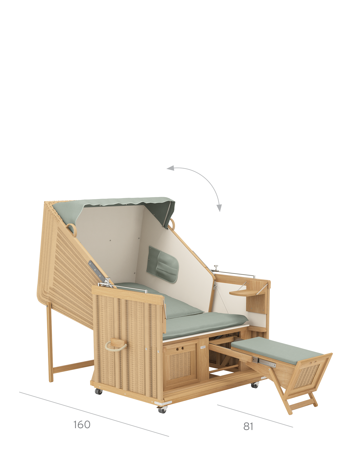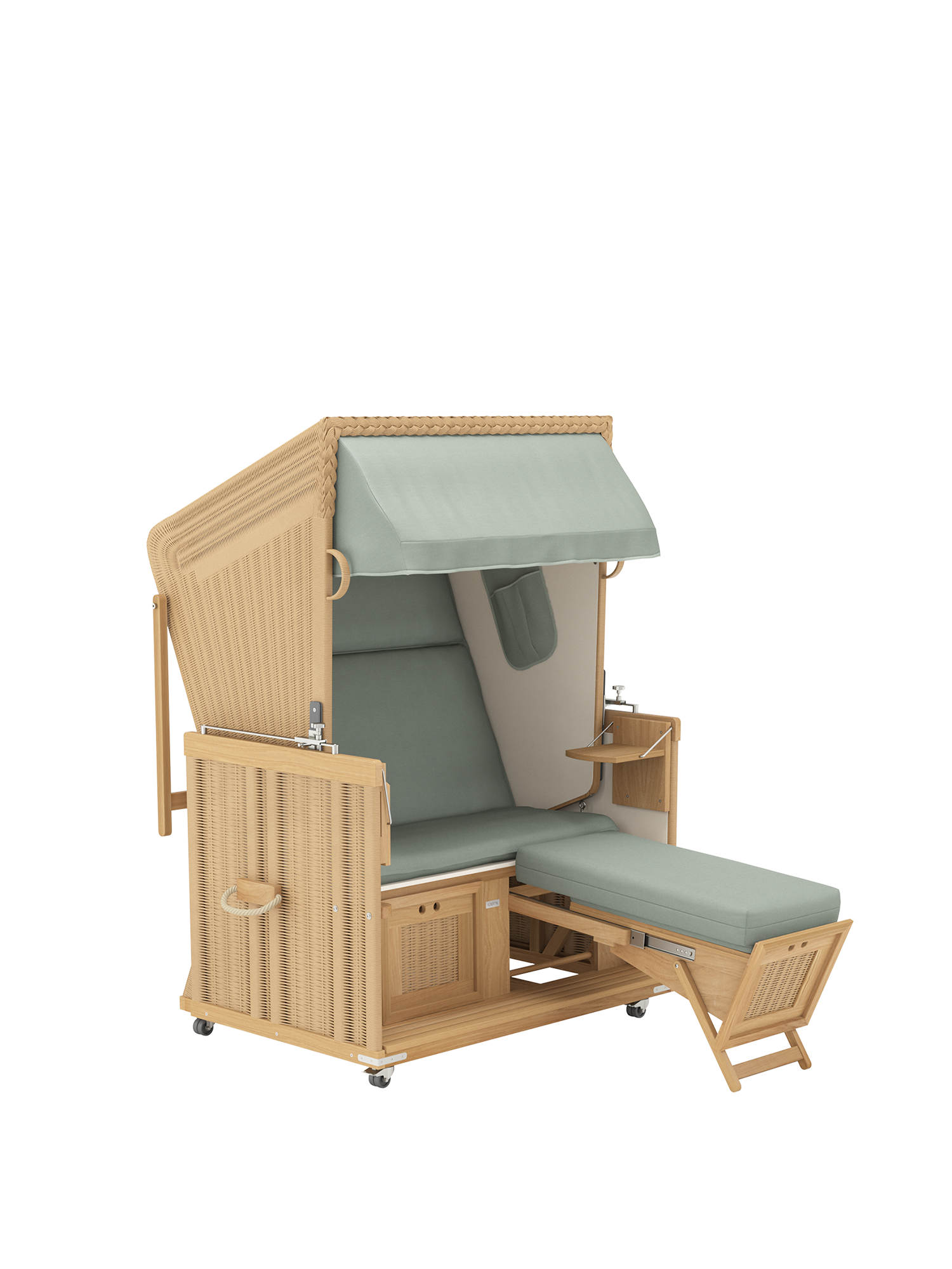 The roomy, upholstered seat of the Strandkorb is variably adjustable and can be made into a completely flat, double lounger. Thanks to a recoil spring, the Strandkorb can be effortlessly raised with two handles.