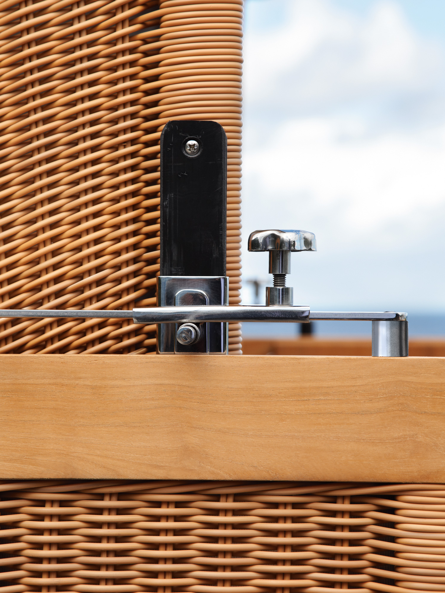 The Strandkorb is of a solid teak construction combined with weatherproof synthetic weave and stainless steel fittings. The elegant fabric specially created for Garpa, is hard-wearing, and with the exception of the lining, is removable and washable.