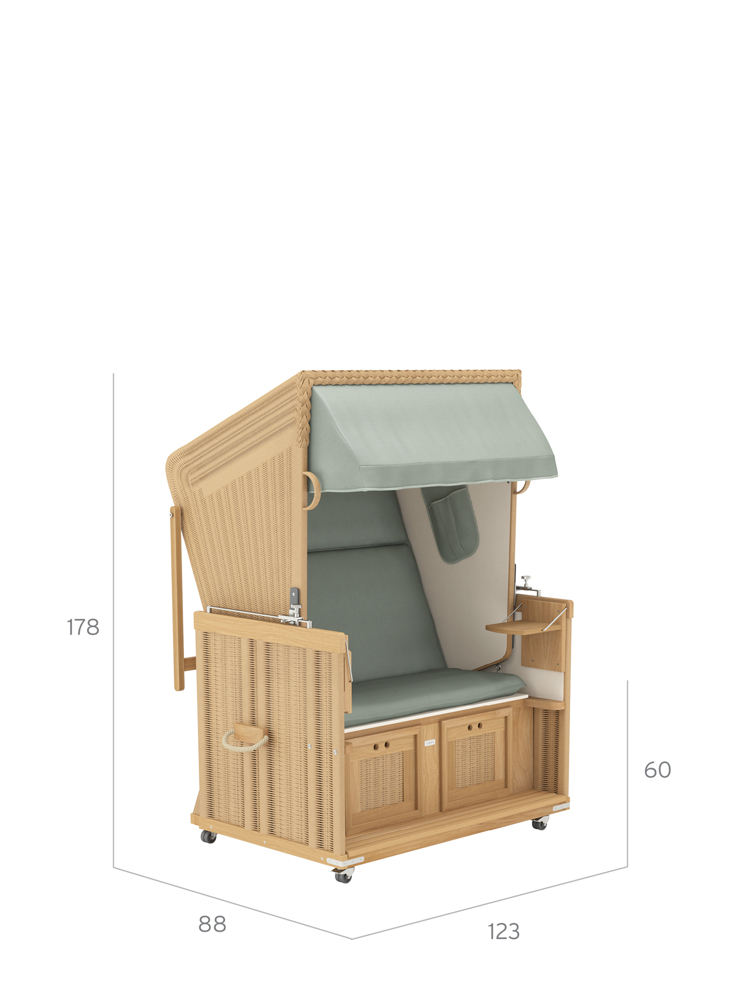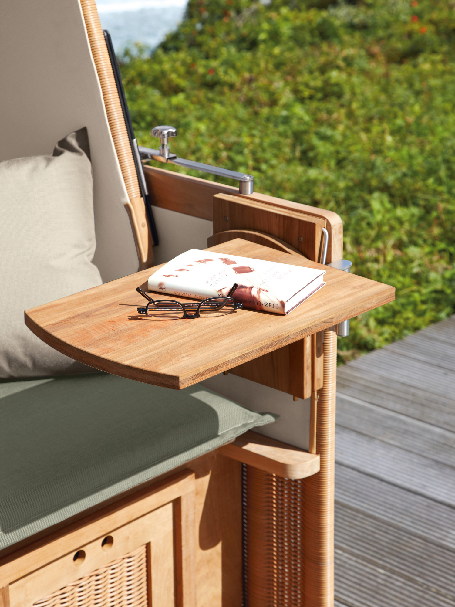 Two teak trays and a book bag are included in the delivery. Wheels, which can also be locked, make the Strandkorb easily mobile. A protective cover is also included. Feather cushions in various designs can be ordered separately. Please select them under "Accessories".