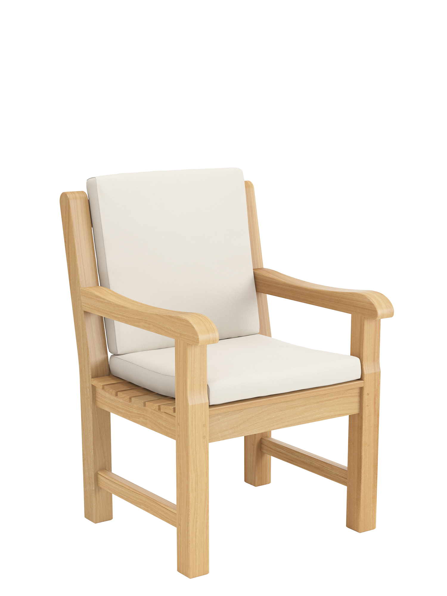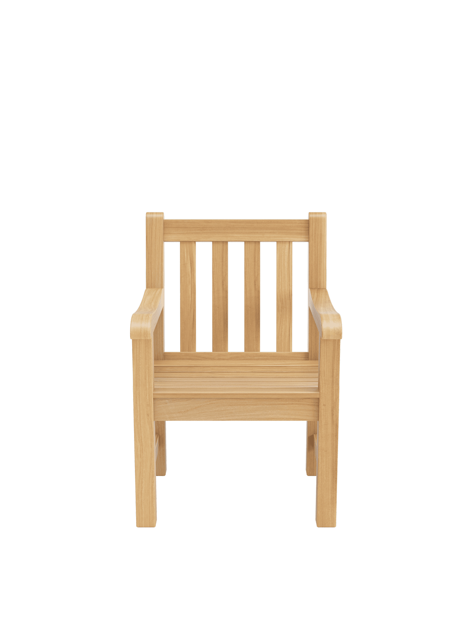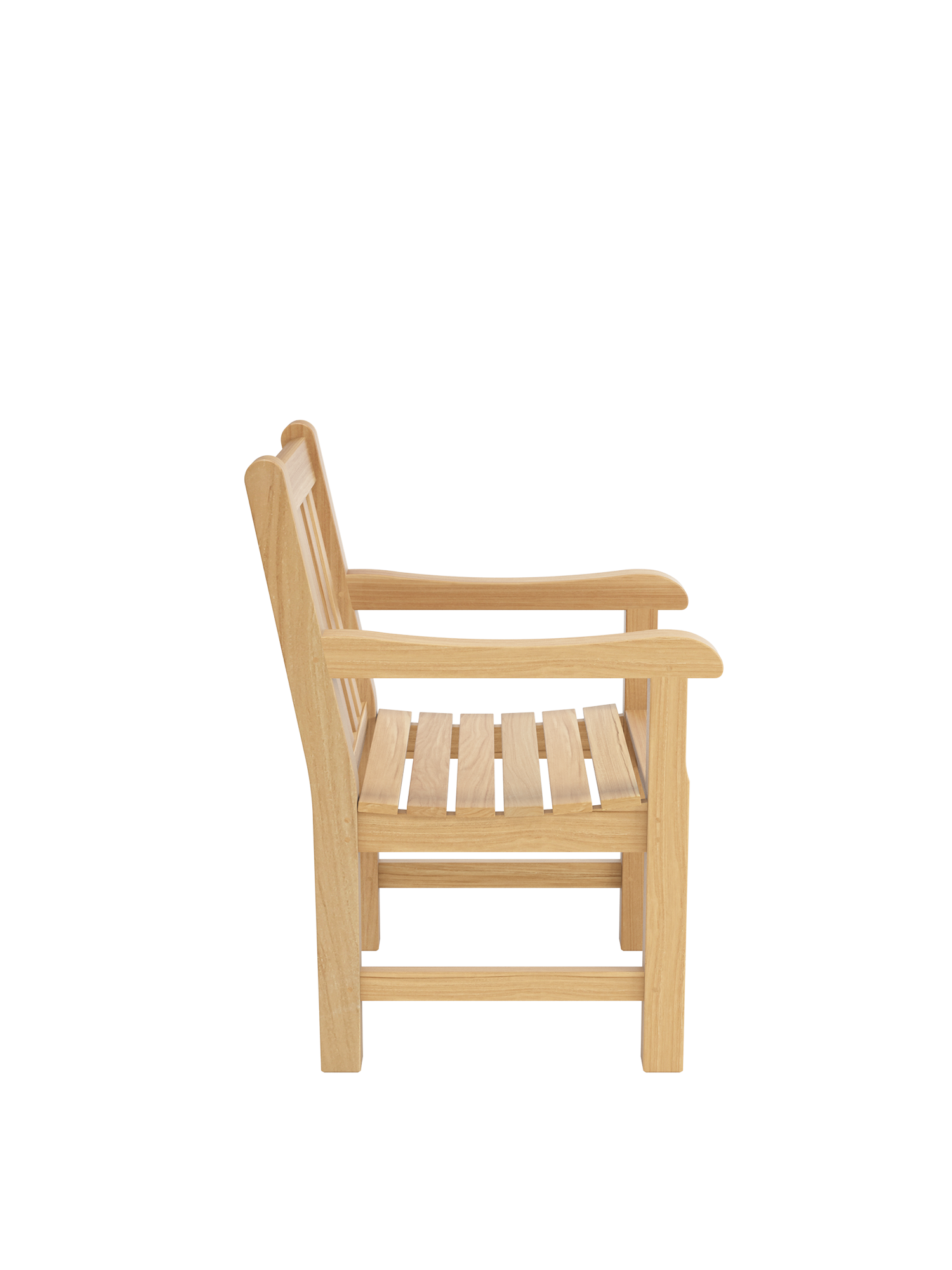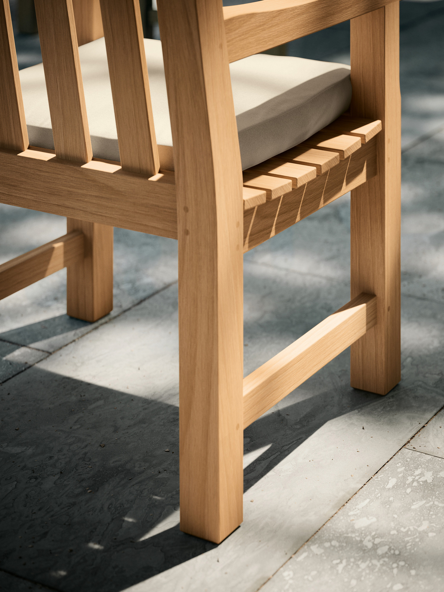 The generous seat of the teak armchair is shaped to the body, the armrests are gently rounded and the slats and crosspiece of the backrest unite so smoothly that they look and feel as if they had been made from a single piece of wood.