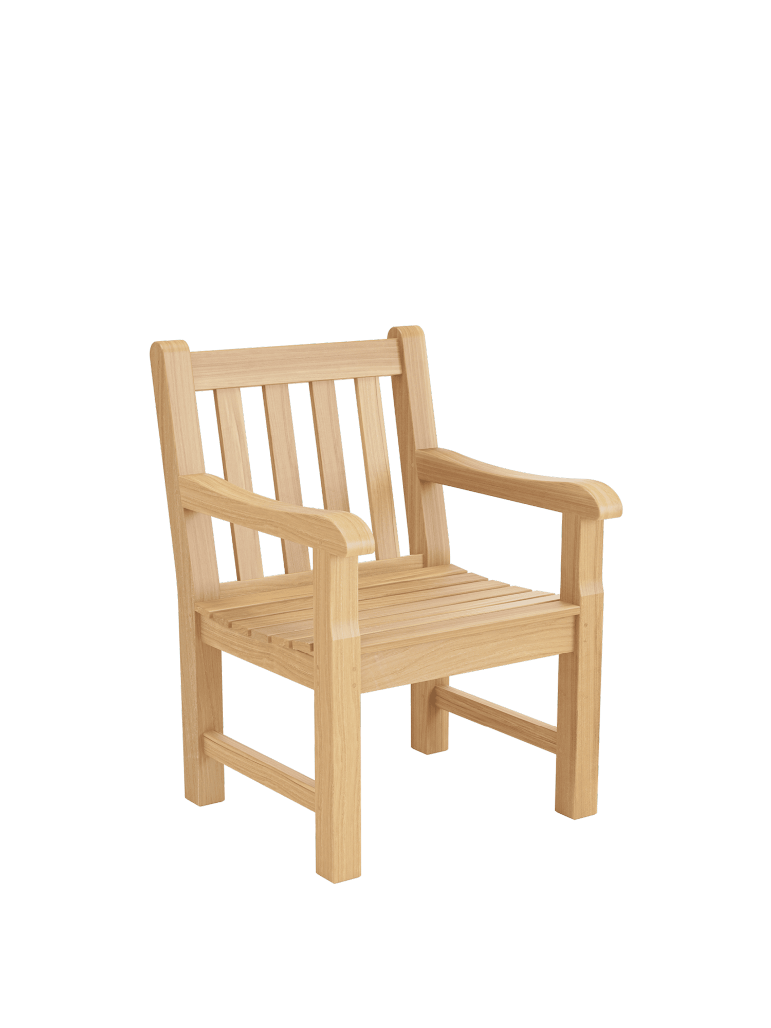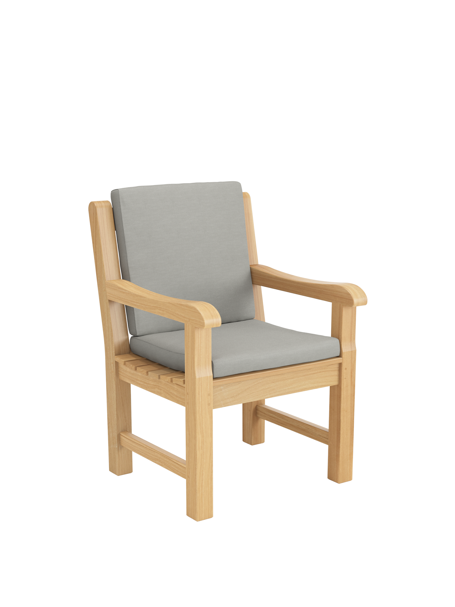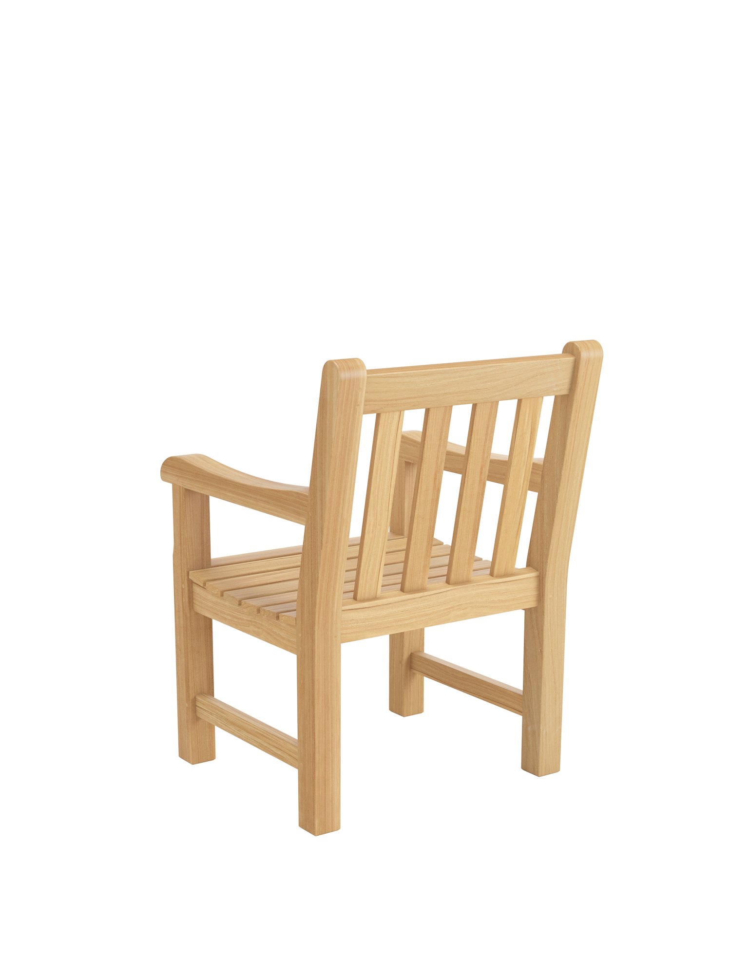 The generous seat of the teak armchair is shaped to the body, the armrests are gently rounded and the slats and crosspiece of the backrest unite so smoothly that they look and feel as if they had been made from a single piece of wood.