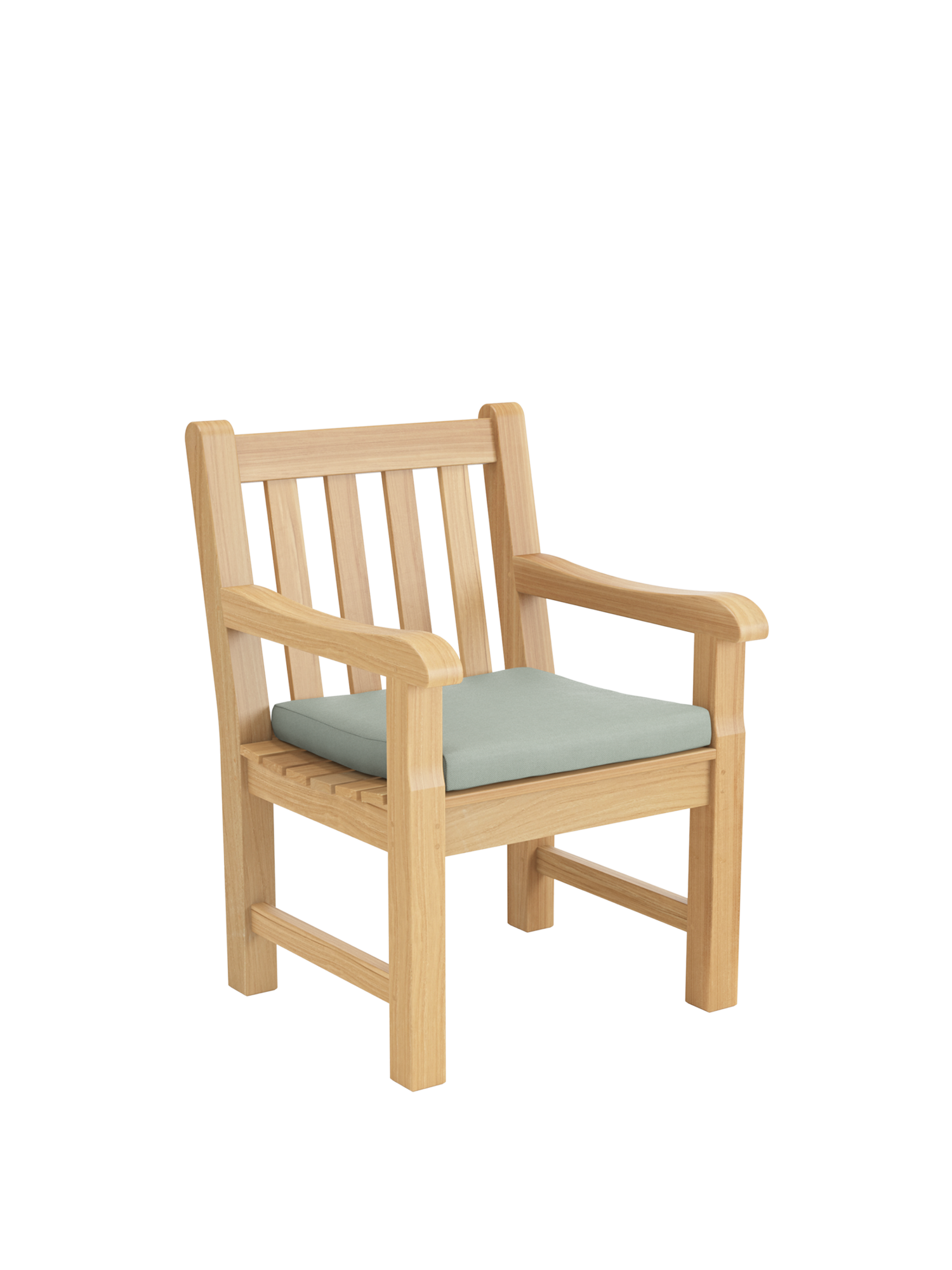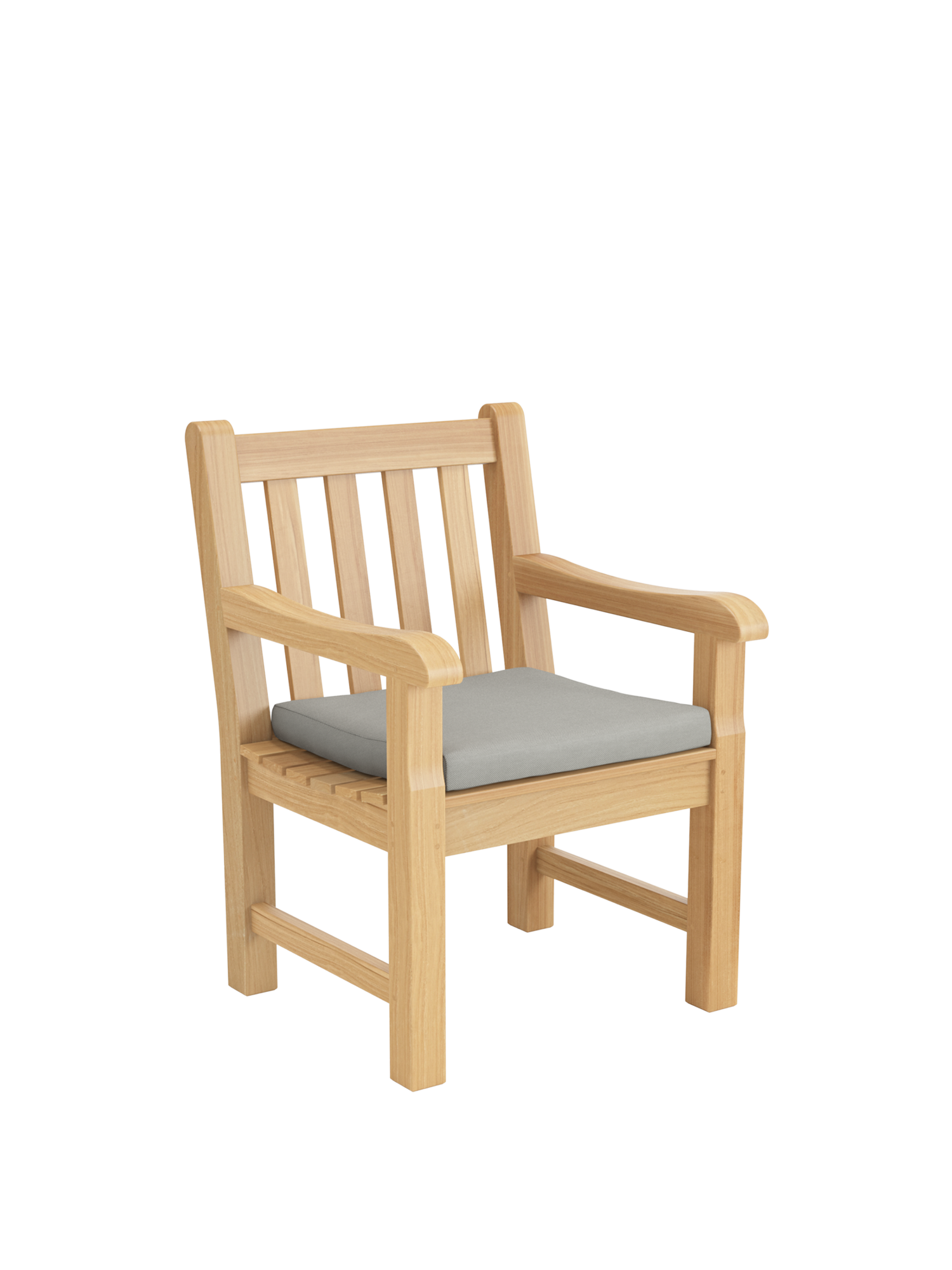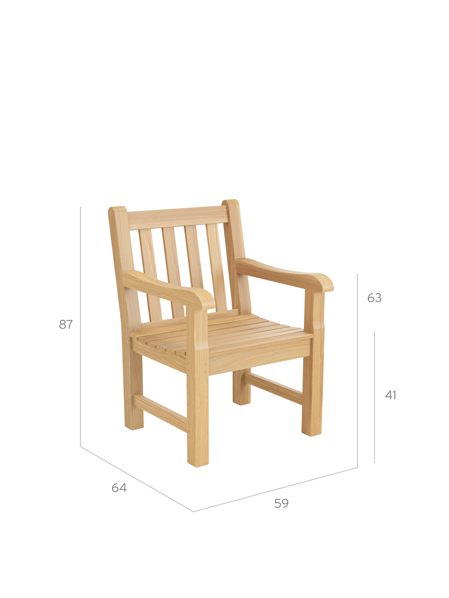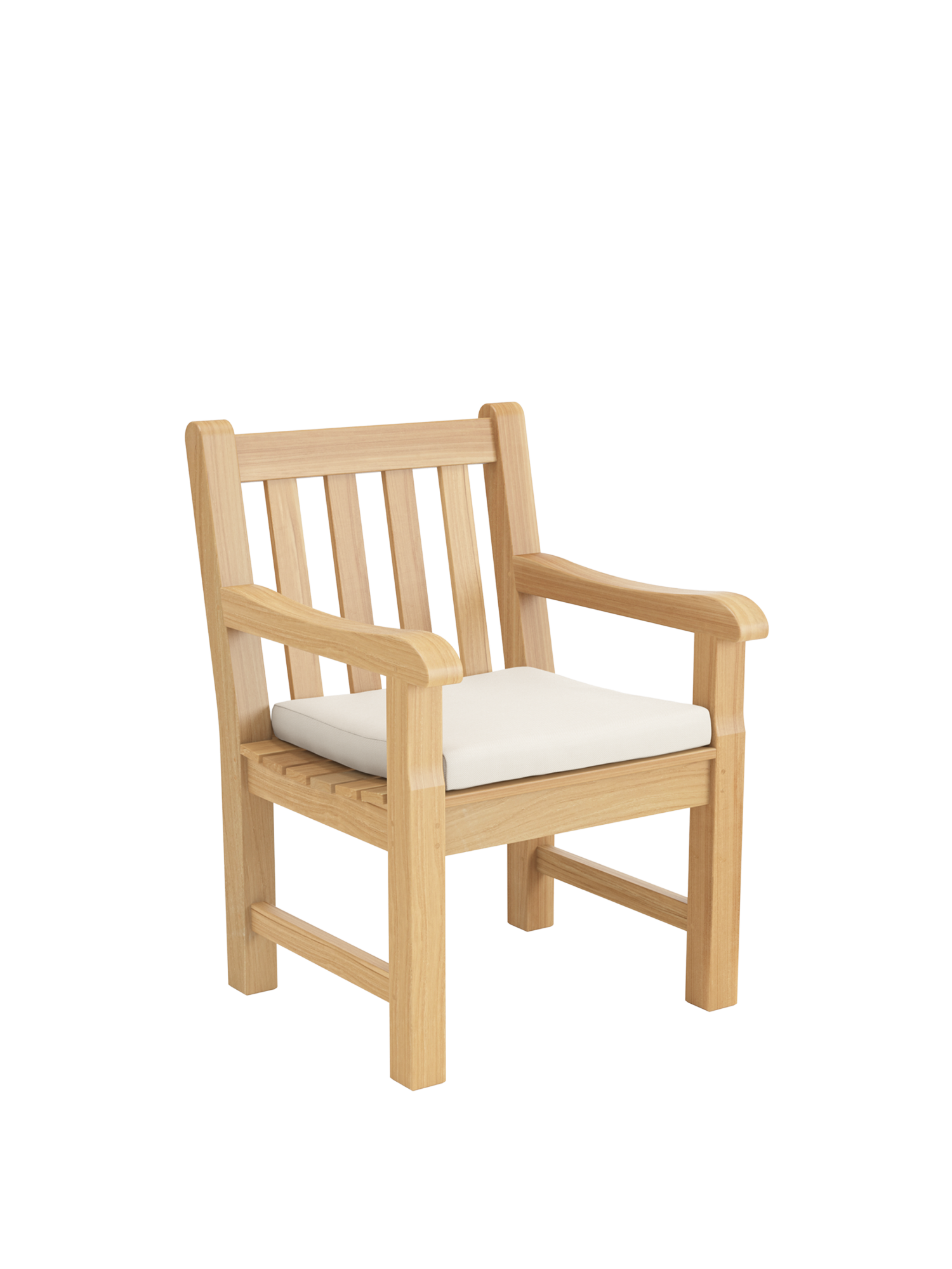 The generous seat of the teak armchair is shaped to the body, the armrests are gently rounded and the slats and crosspiece of the backrest unite so smoothly that they look and feel as if they had been made from a single piece of wood.