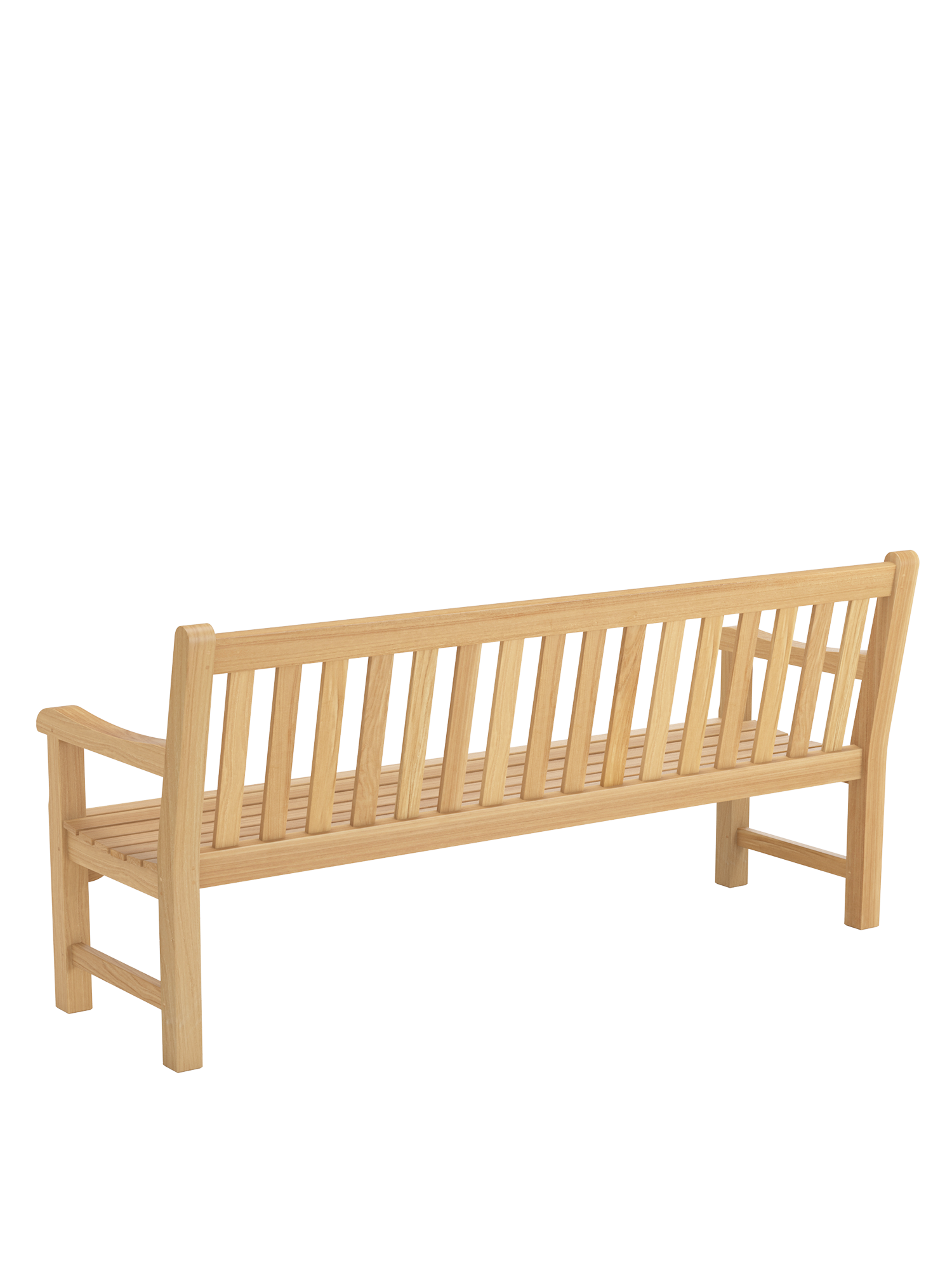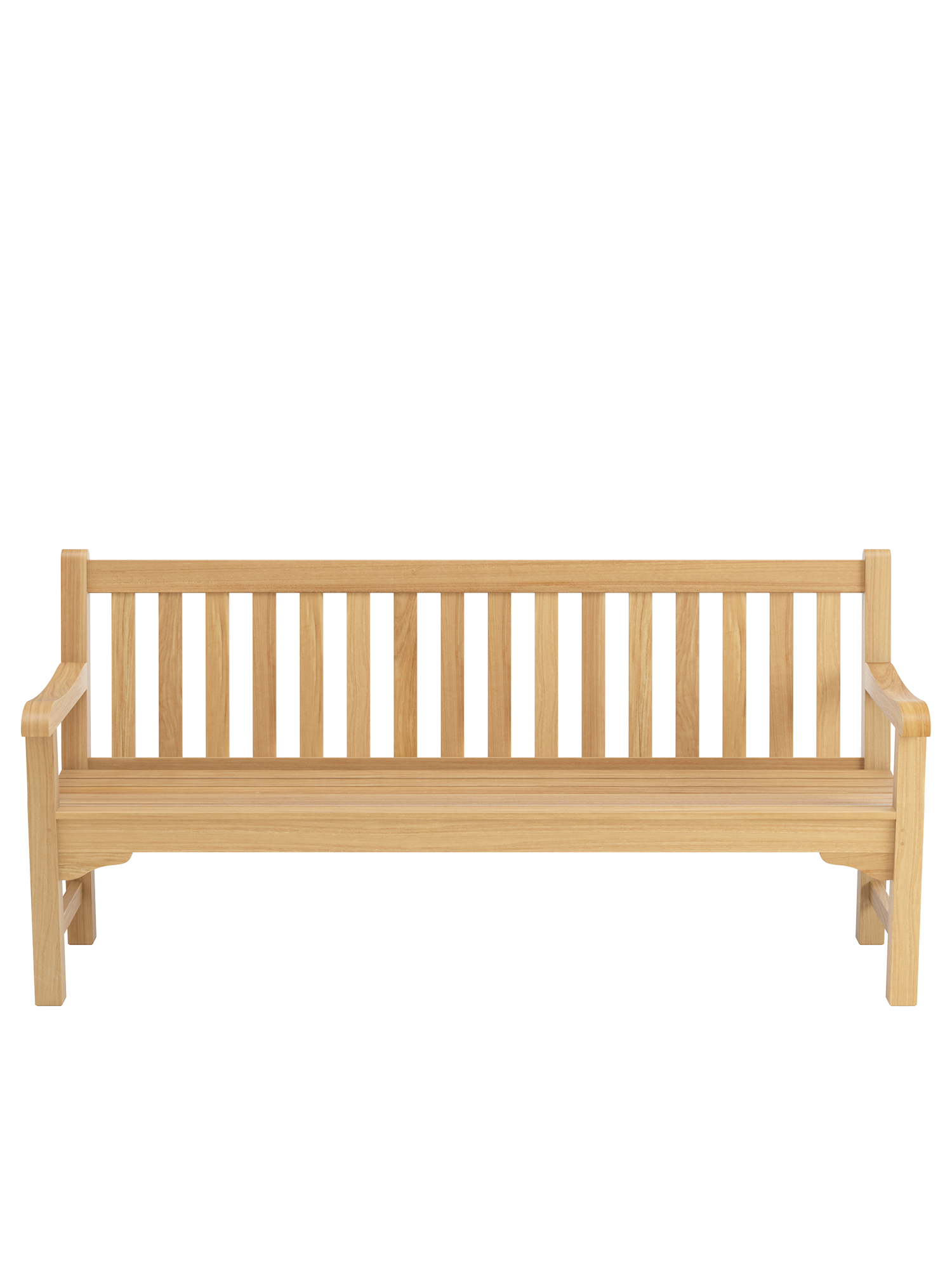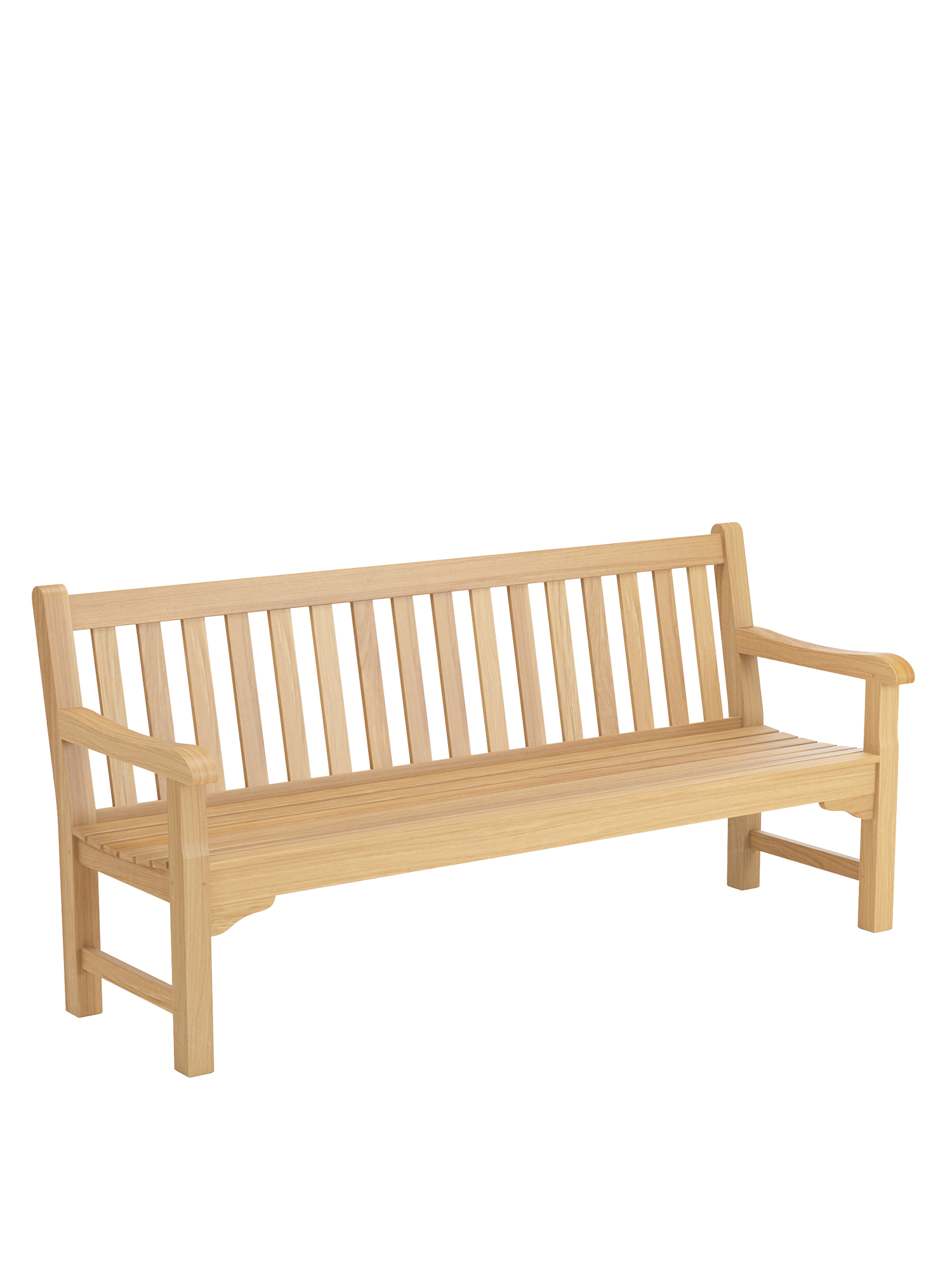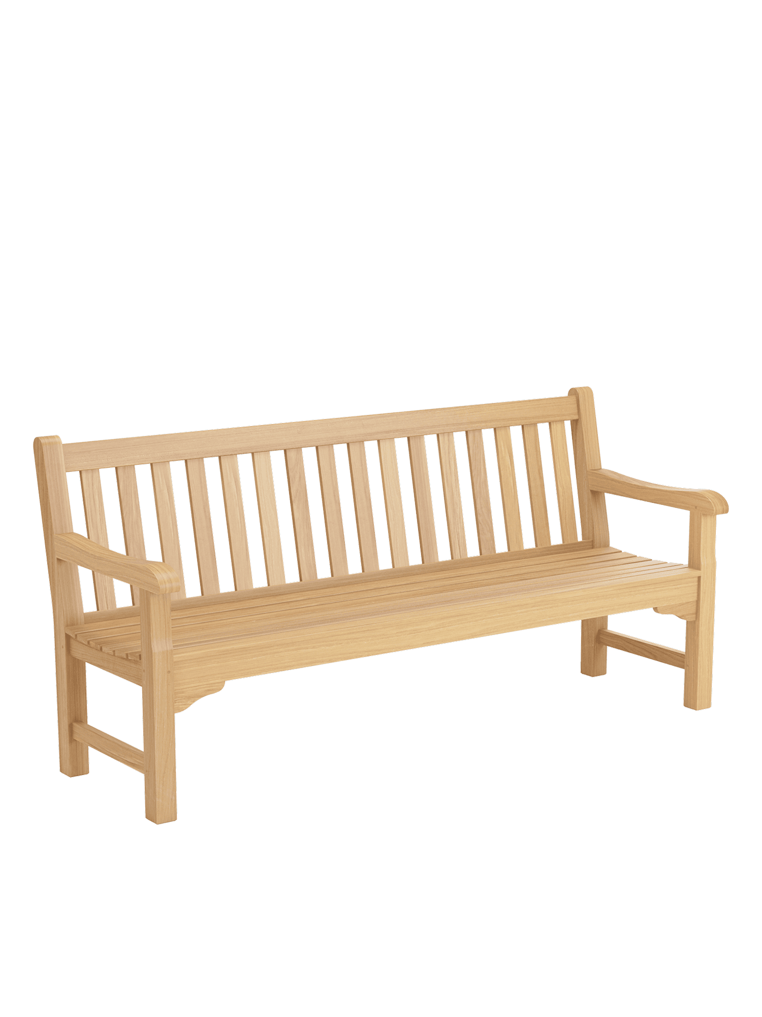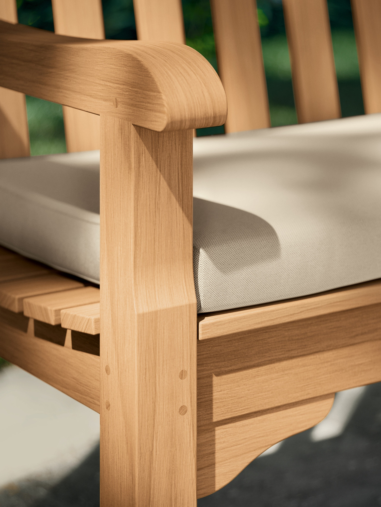 The generous seat of the teak bench is shaped to the body, the armrests are gently rounded and the slats and crosspiece of the backrest unite so smoothly that they look and feel as if they had been made from a single piece of wood.