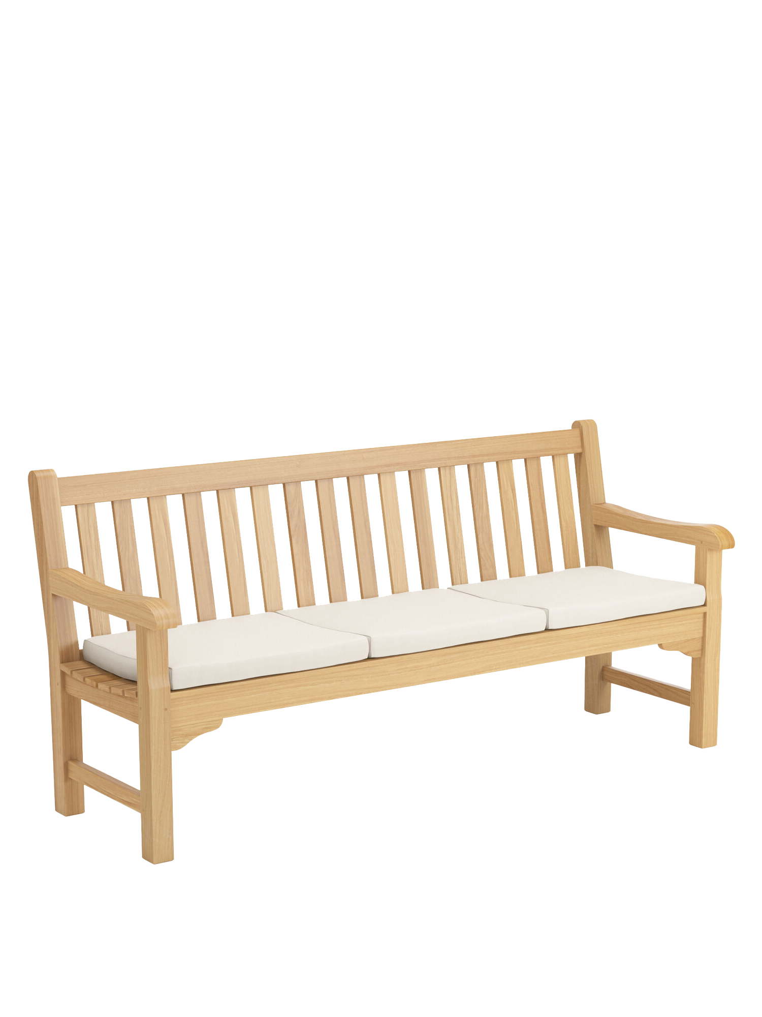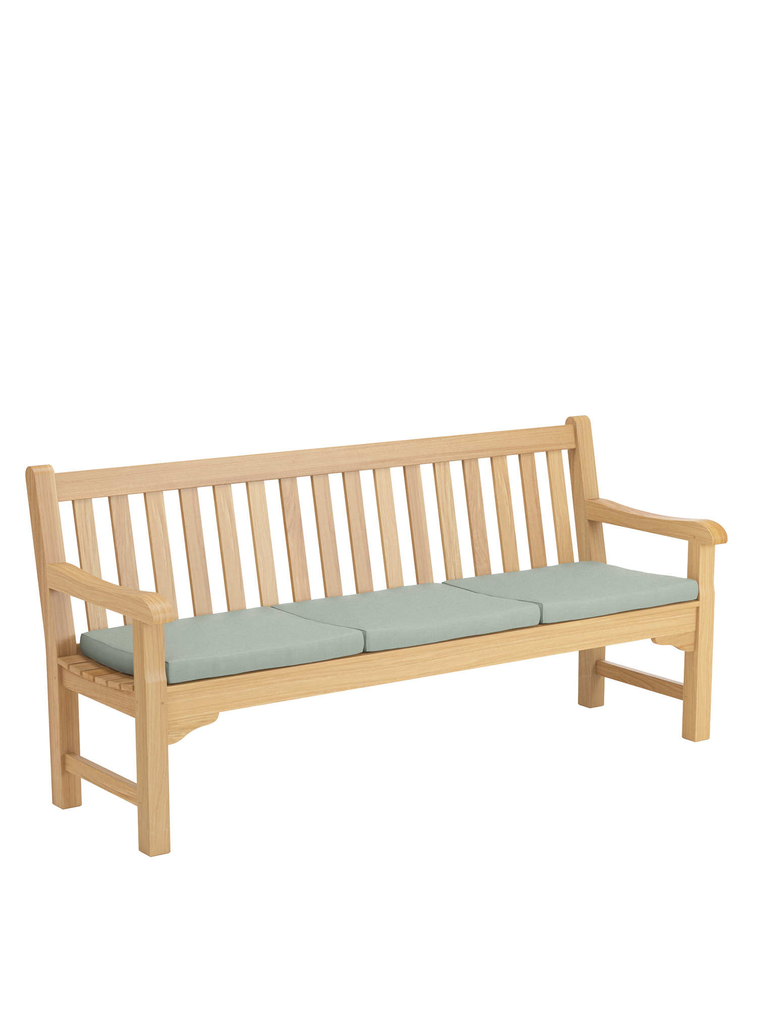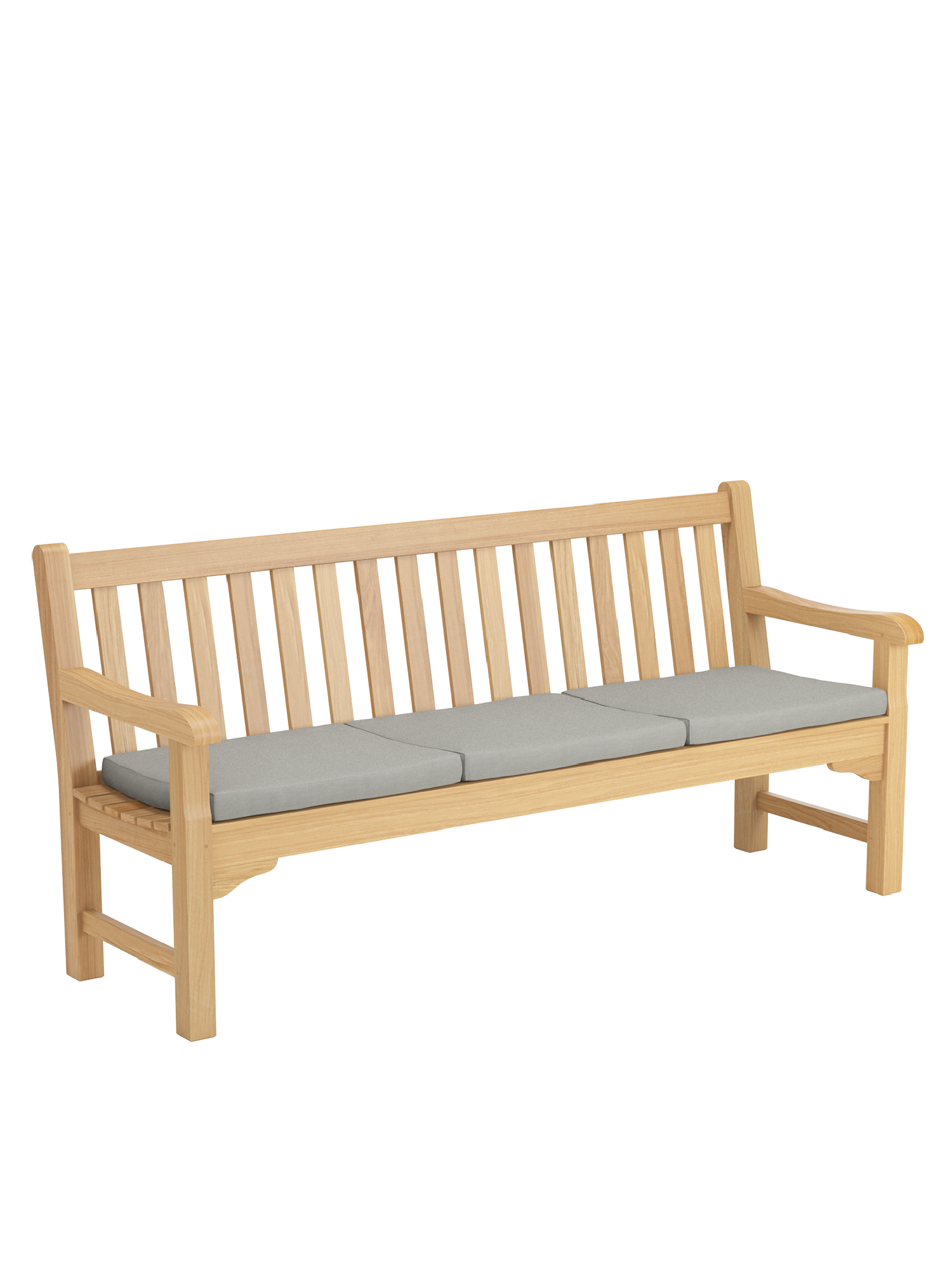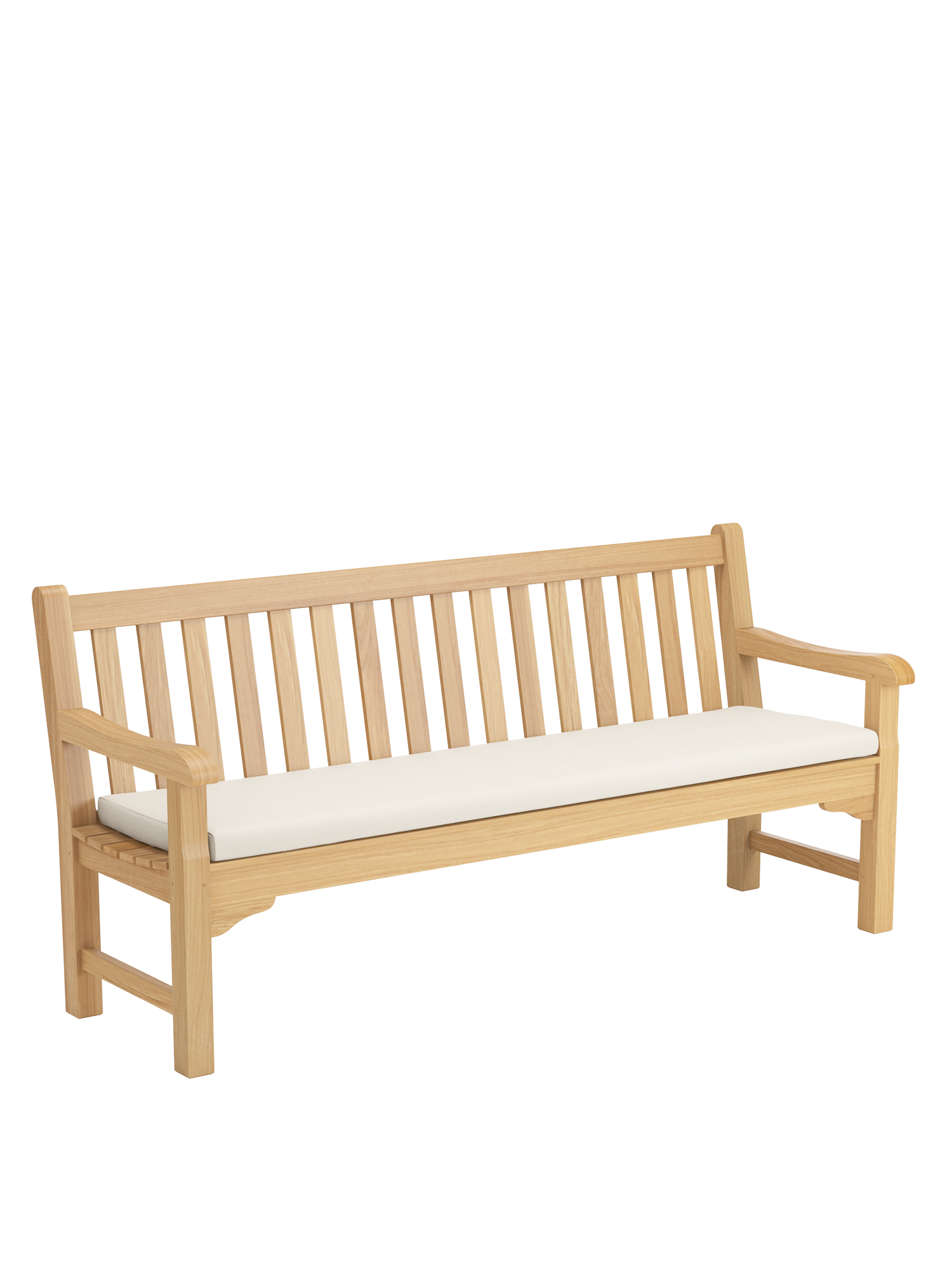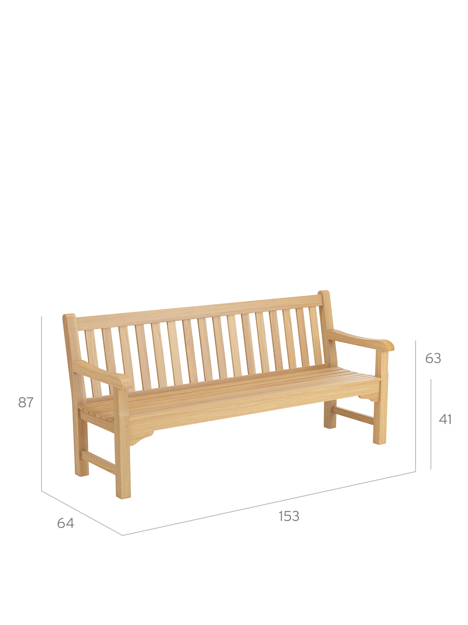 The generous seat of the teak bench is shaped to the body, the armrests are gently rounded and the slats and crosspiece of the backrest unite so smoothly that they look and feel as if they had been made from a single piece of wood.