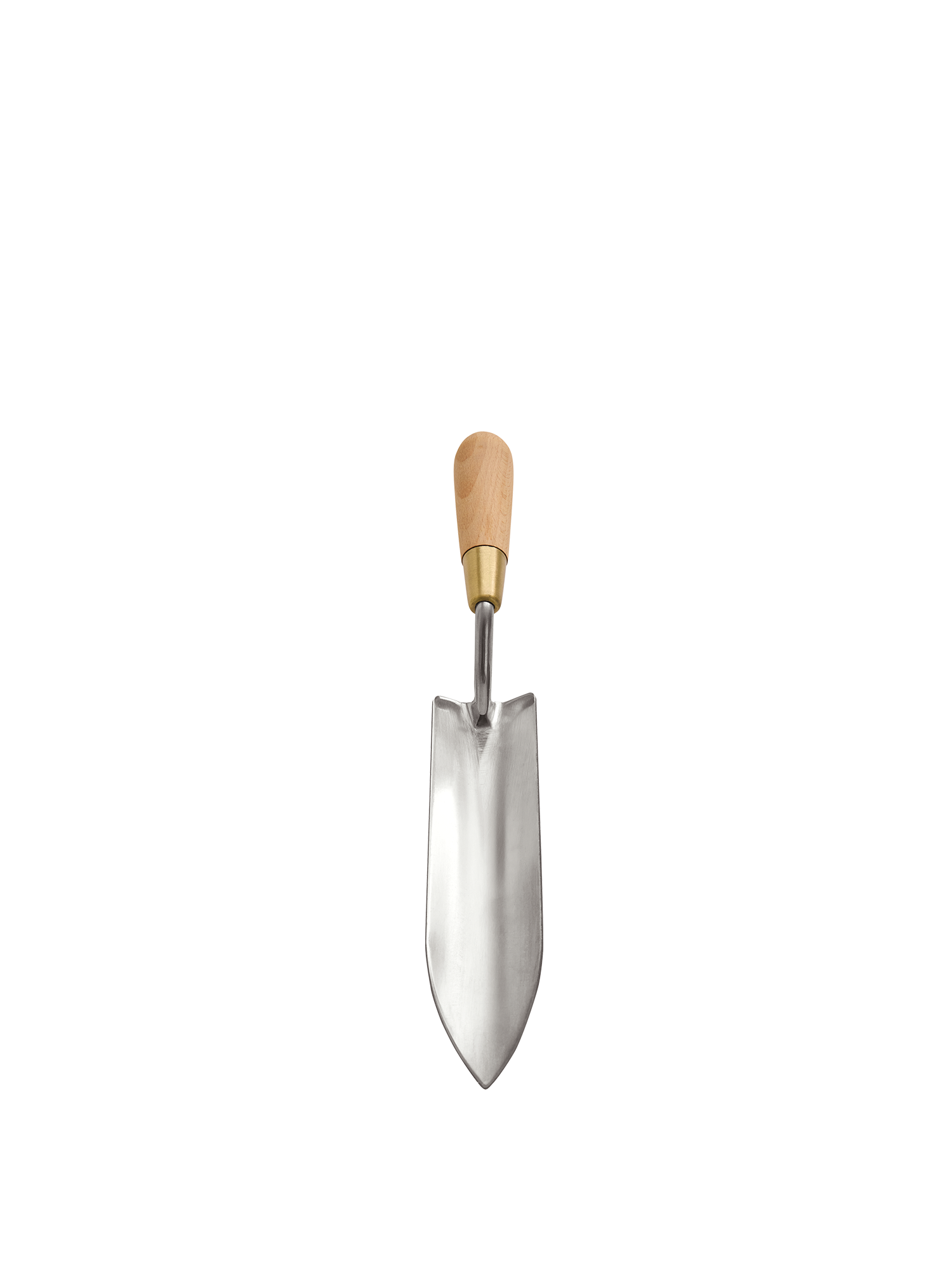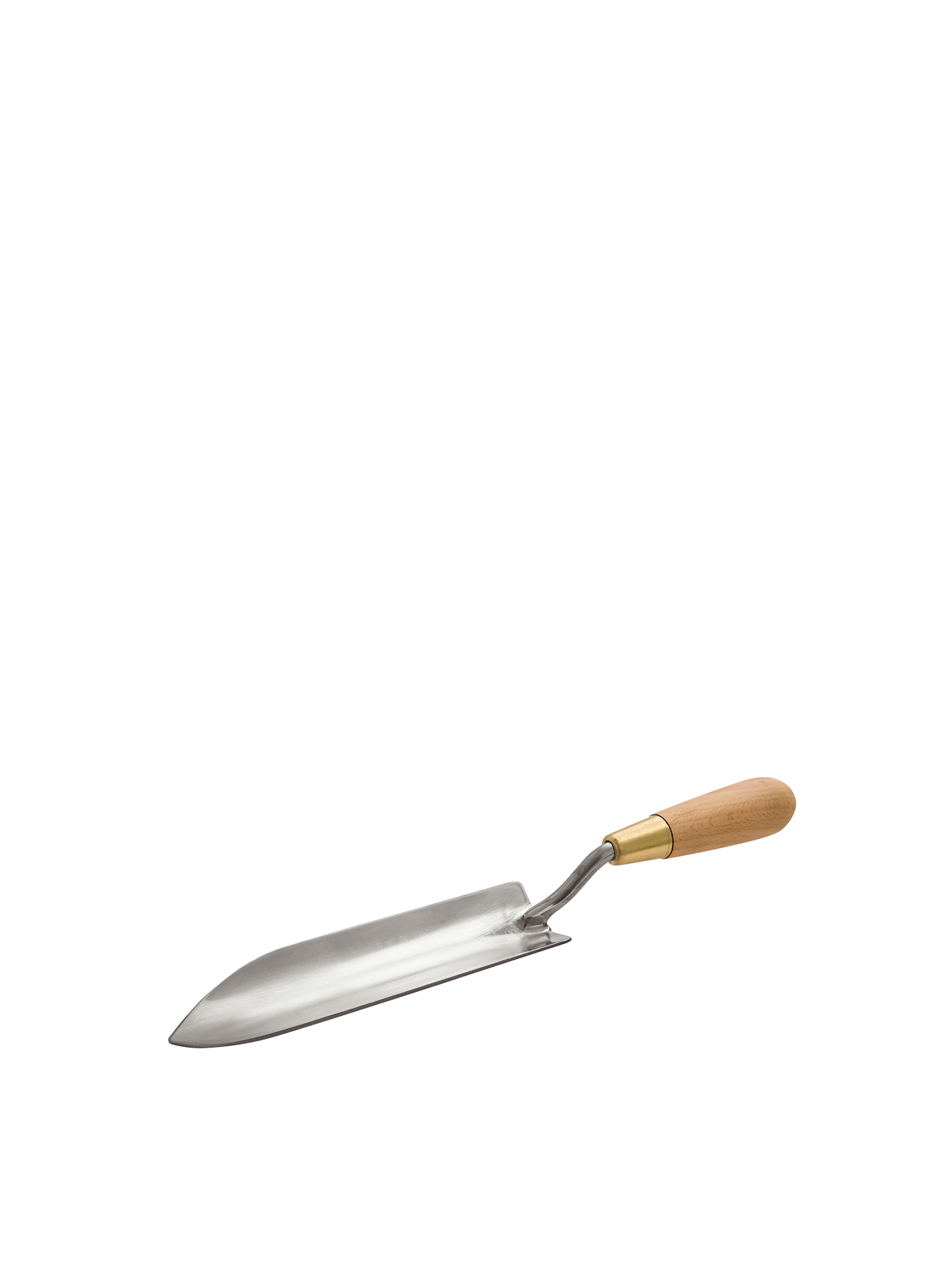 Both long and narrow, the stainless steel planting trowel is particularly suitable for gardening in small spaces and for removing weeds with deep roots. The handle, made of brass and FSC-certified beech wood, fits perfectly in the hand.