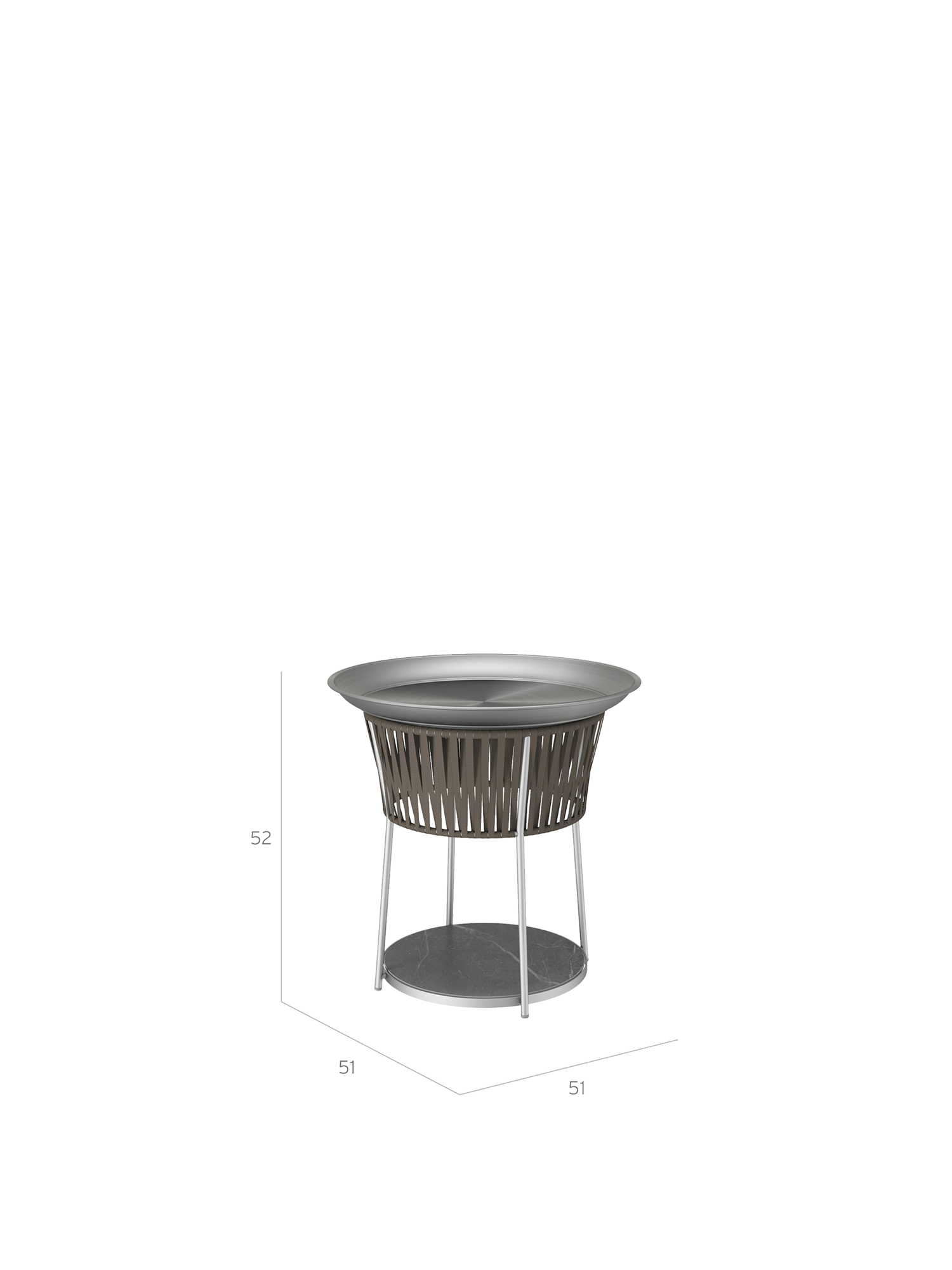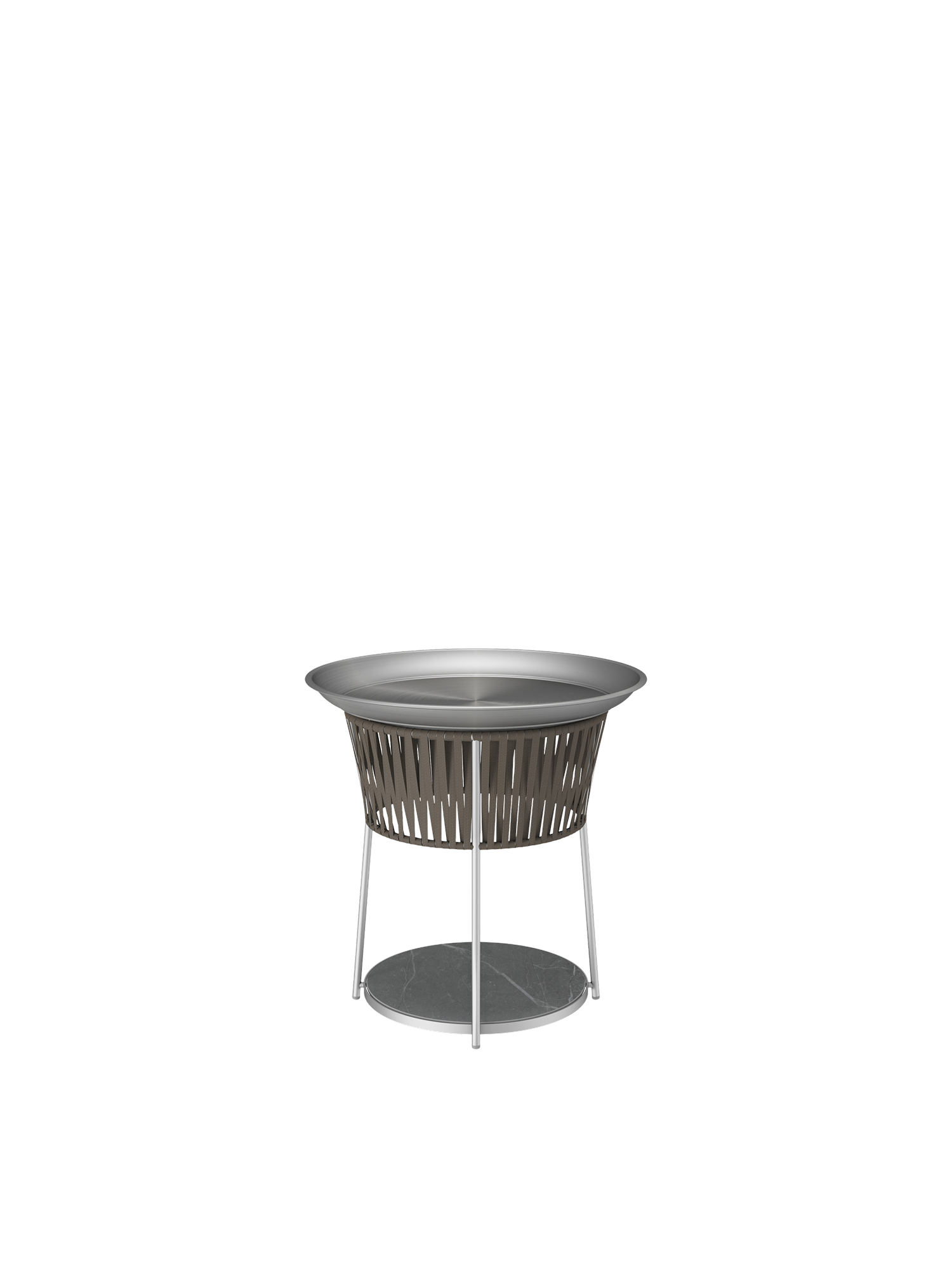 Woven about with the defining cord of the Temper series in Petrol or Brown, the elegant side table is fitted with a removable tray made of satin-finished stainless steel. It is available with a base of ceramic or glass.
