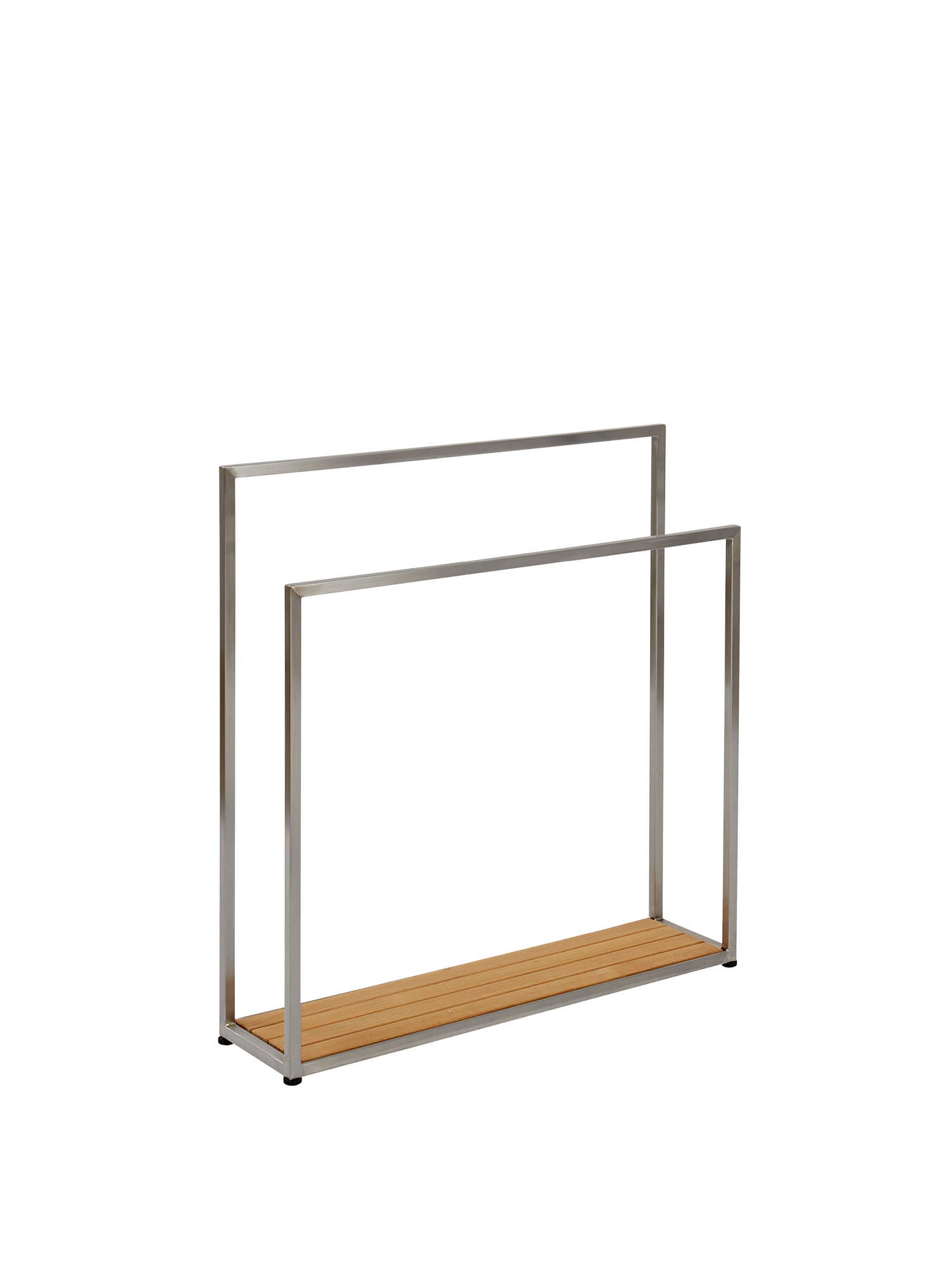 With its clean, modern lines, the two-tier stainless steel towel holder features a weather-resistant teak base. Height adjusters ensure a firm stand.