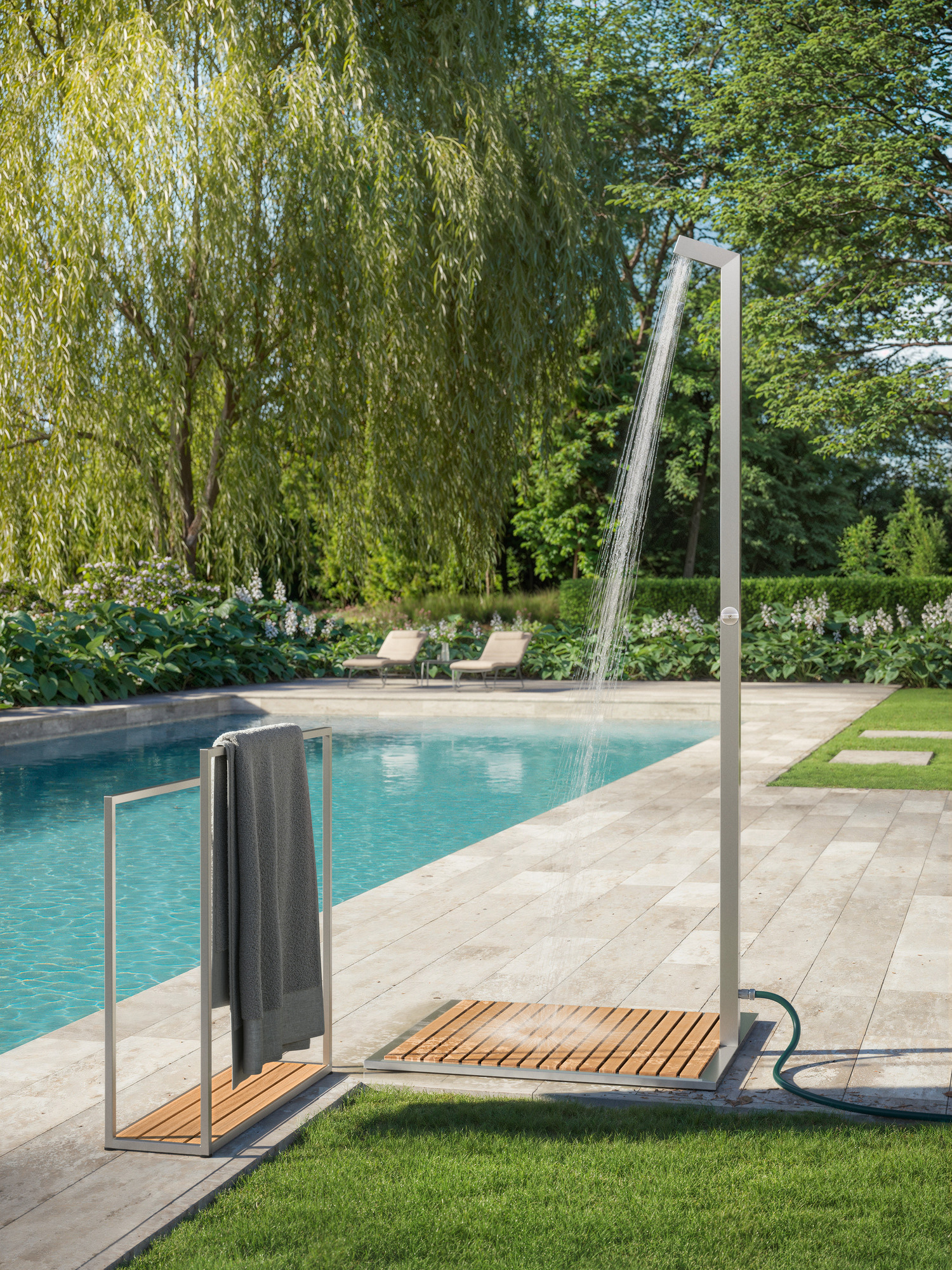Positioned next to the outdoor shower, this practical stand keeps fluffy towels close at hand.