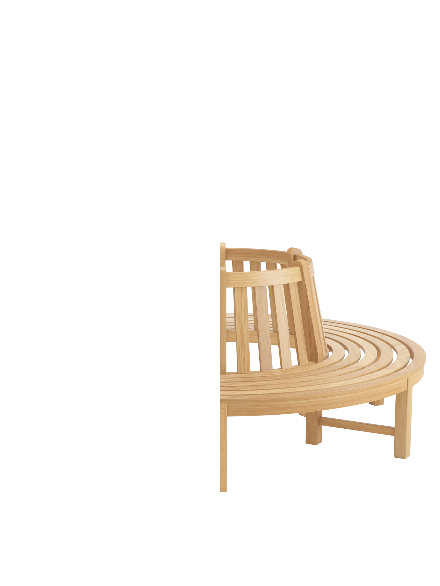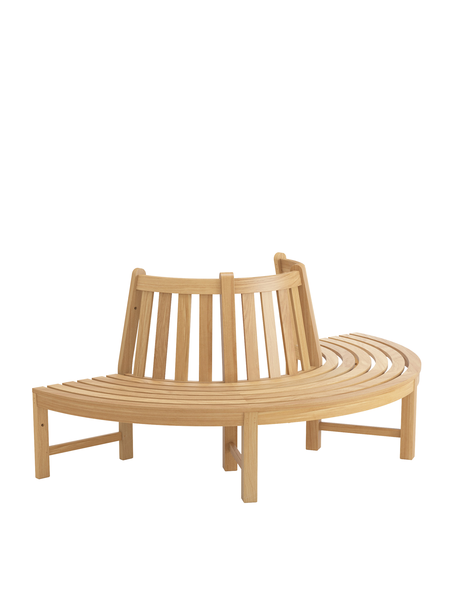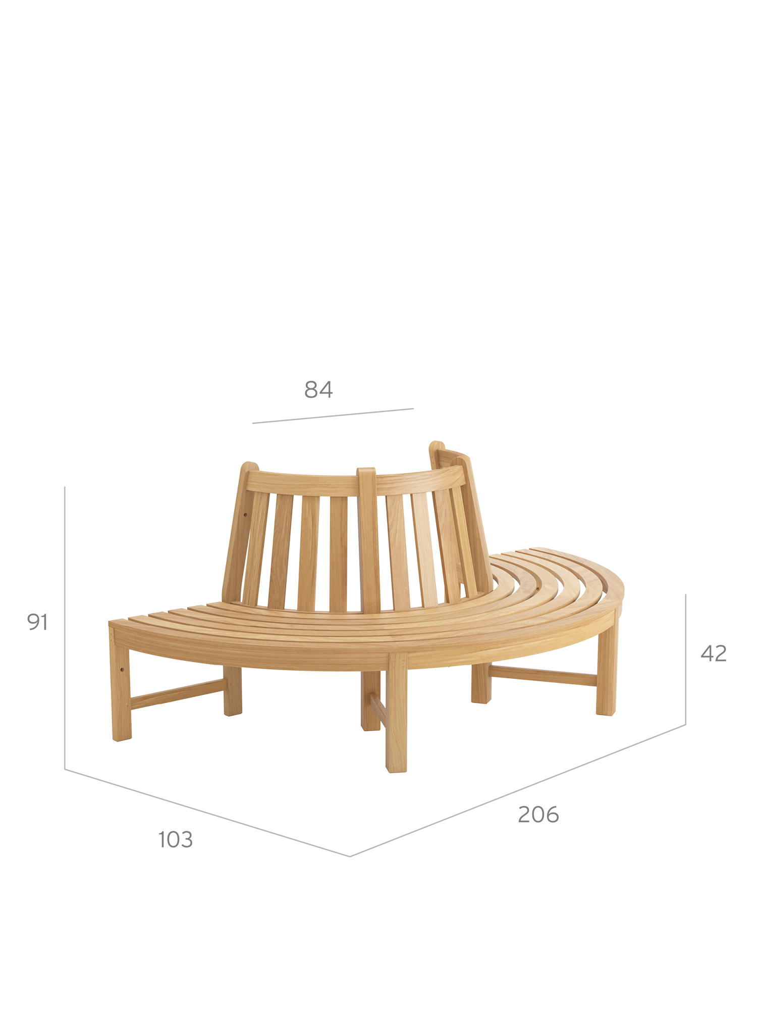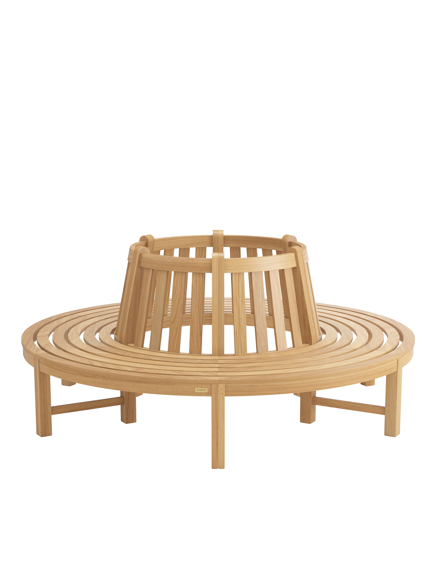 The tree seat of teak invites to a classic round. With an inner diameter of 84 cm and a seat depth of 48 cm, it embraces the tree – either in a semicircle or completely. It fits completely or half-way around the family tree. For a full circle, please order two semi-circles.
