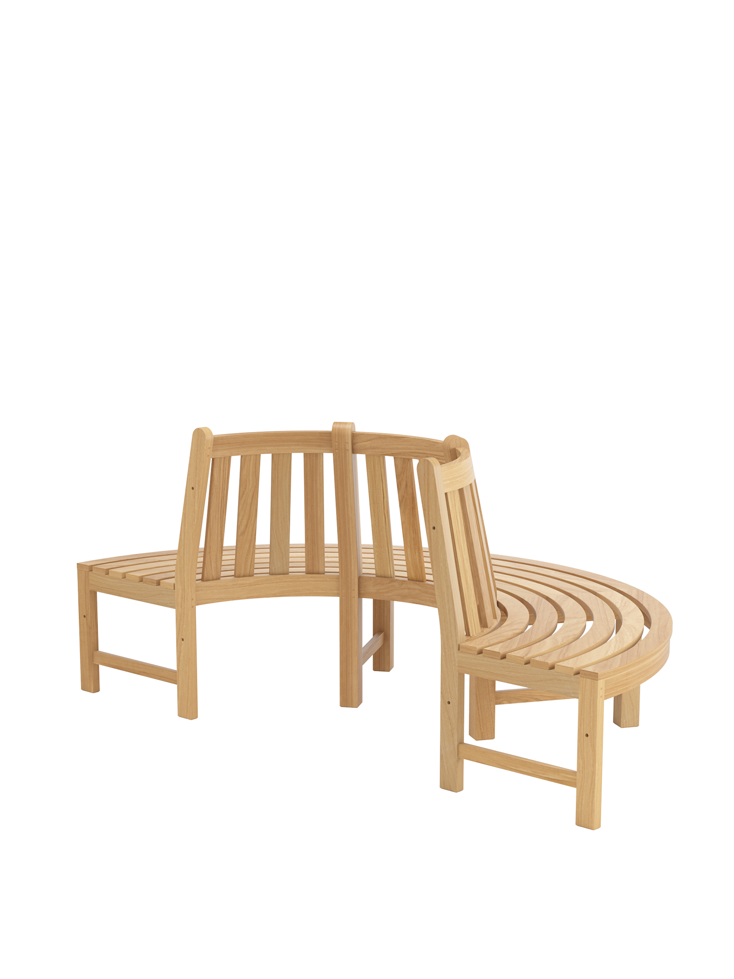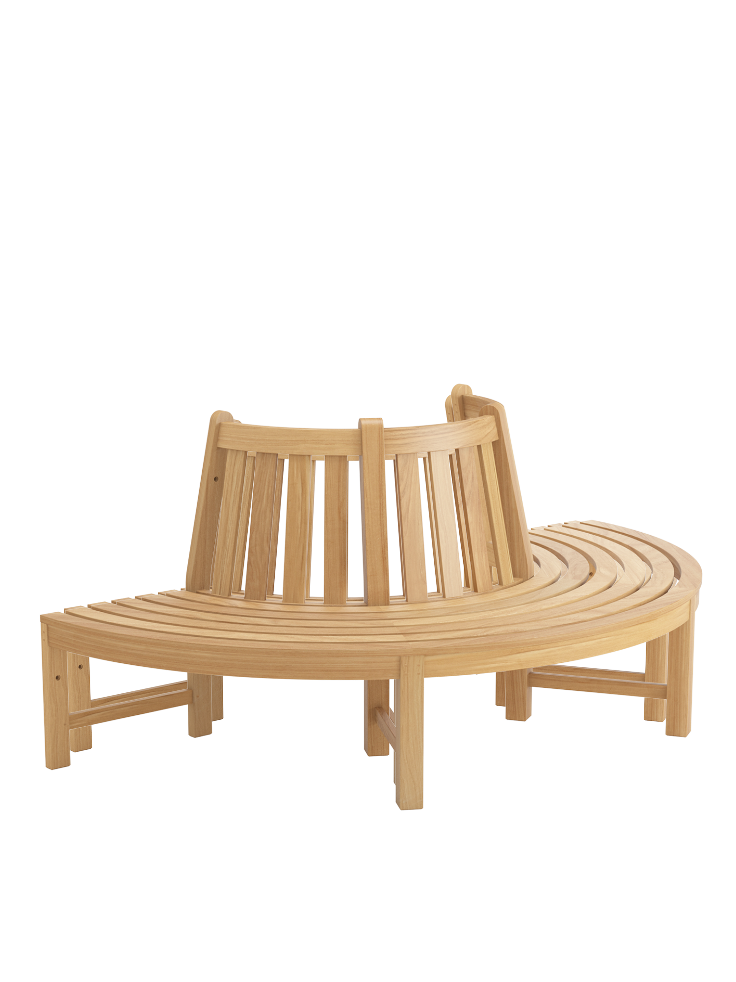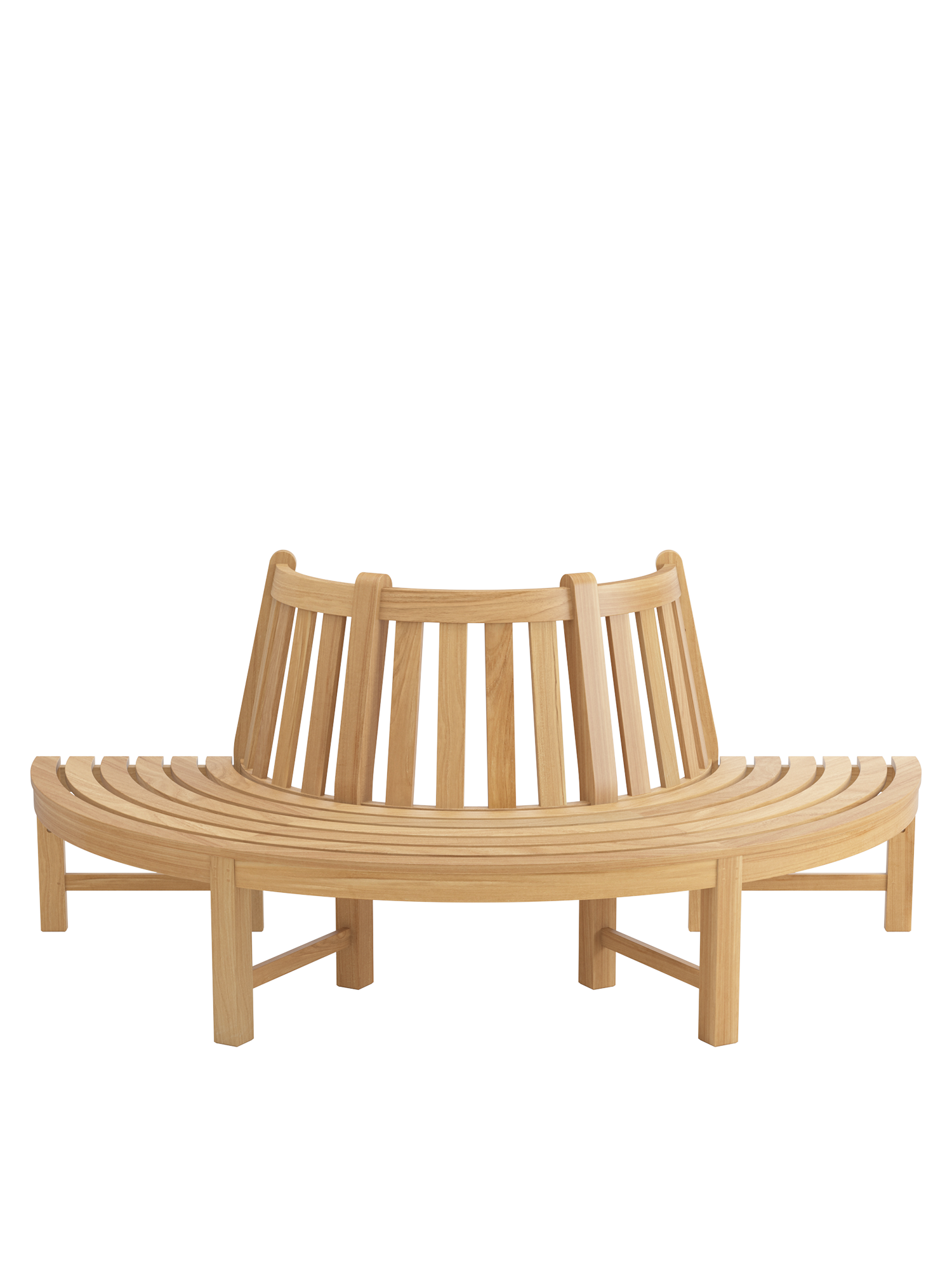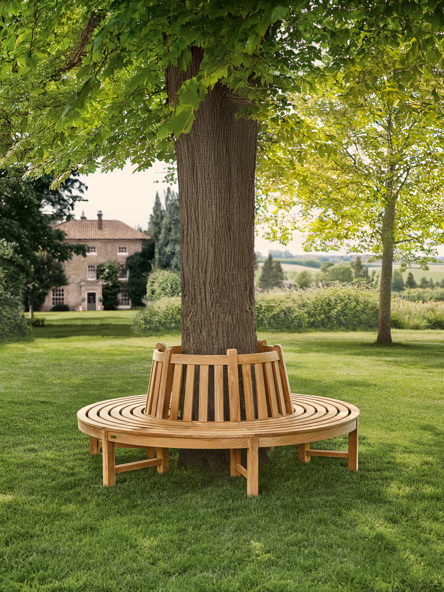 The tree seat of teak invites to a classic round. With an inner diameter of 84 cm and a seat depth of 48 cm, it embraces the tree – either in a semicircle or completely. It fits completely or half-way around the family tree. For a full circle, please order two semi-circles.