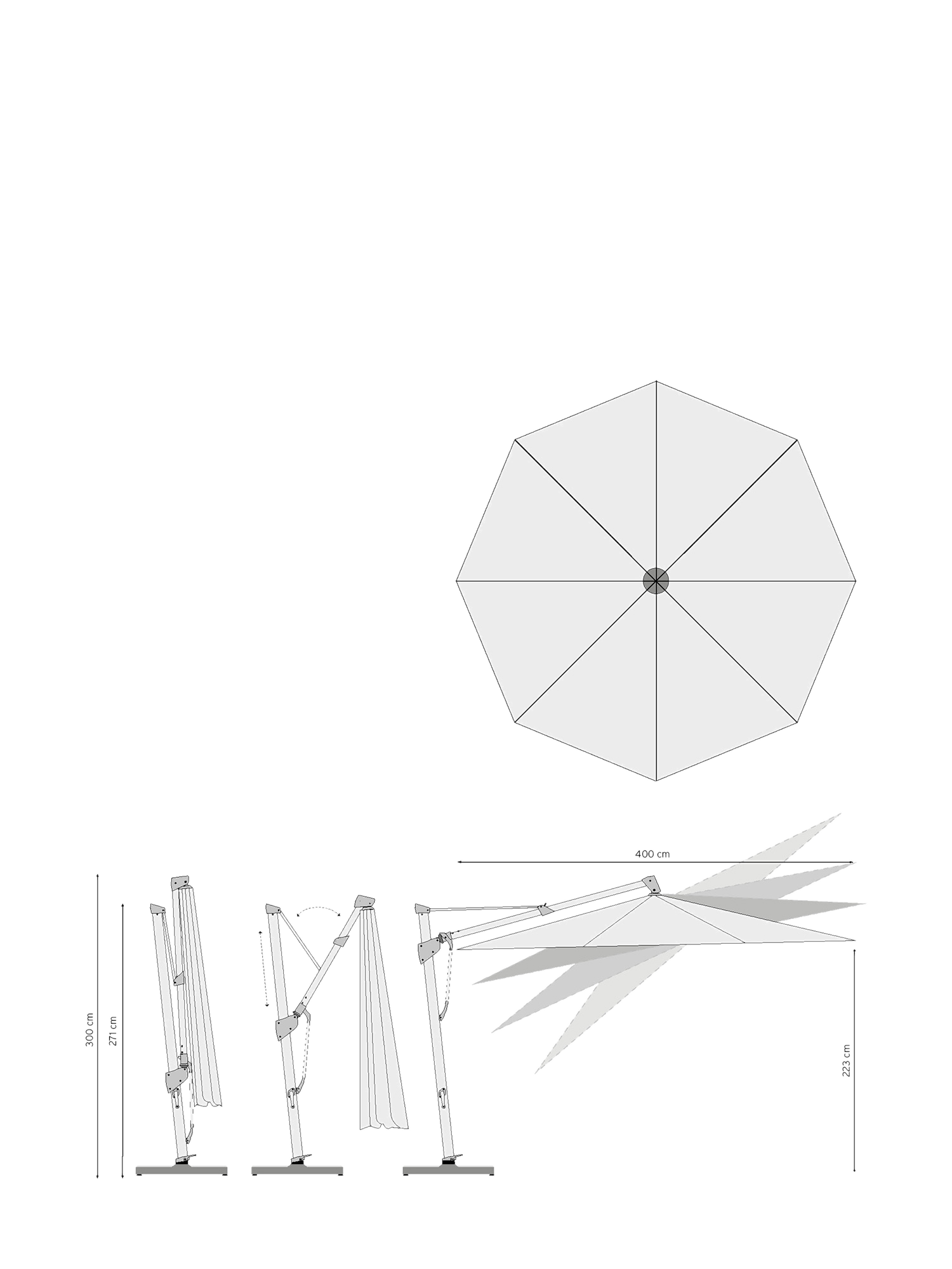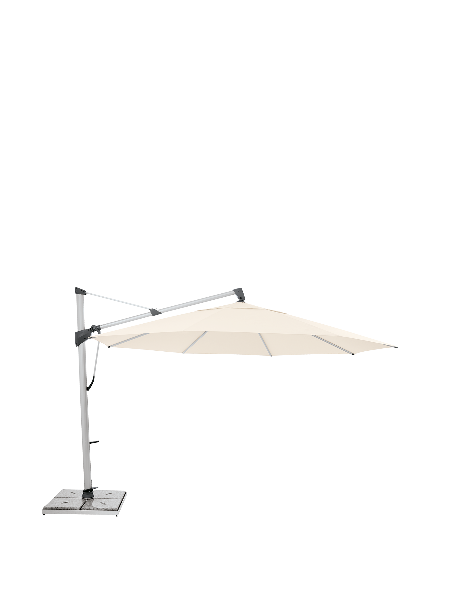Trentino's pole can be loosened in the base with the foot pedal and rotated by hand on its own axis. In this way the parasol arm always moves the shade according to the position of the sun. The canopy can also be tilted up to 90 degrees and locked in three different positions. At the table and on the terrace Trentino is especially welcome: while the canopy floats over the centre of things, the pole made of silver-grey aluminium stands discreetly to the side. The parasol is unfurled with a handle, and when closed, it is very slender.