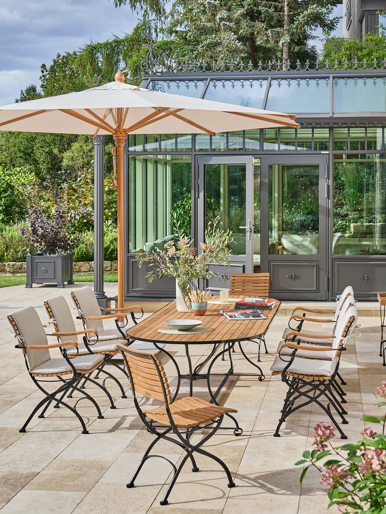 Umbria is available in many shapes and seven sizes. Whether round, square or rectangular, the parasols are suitable for specially large gatherings.
