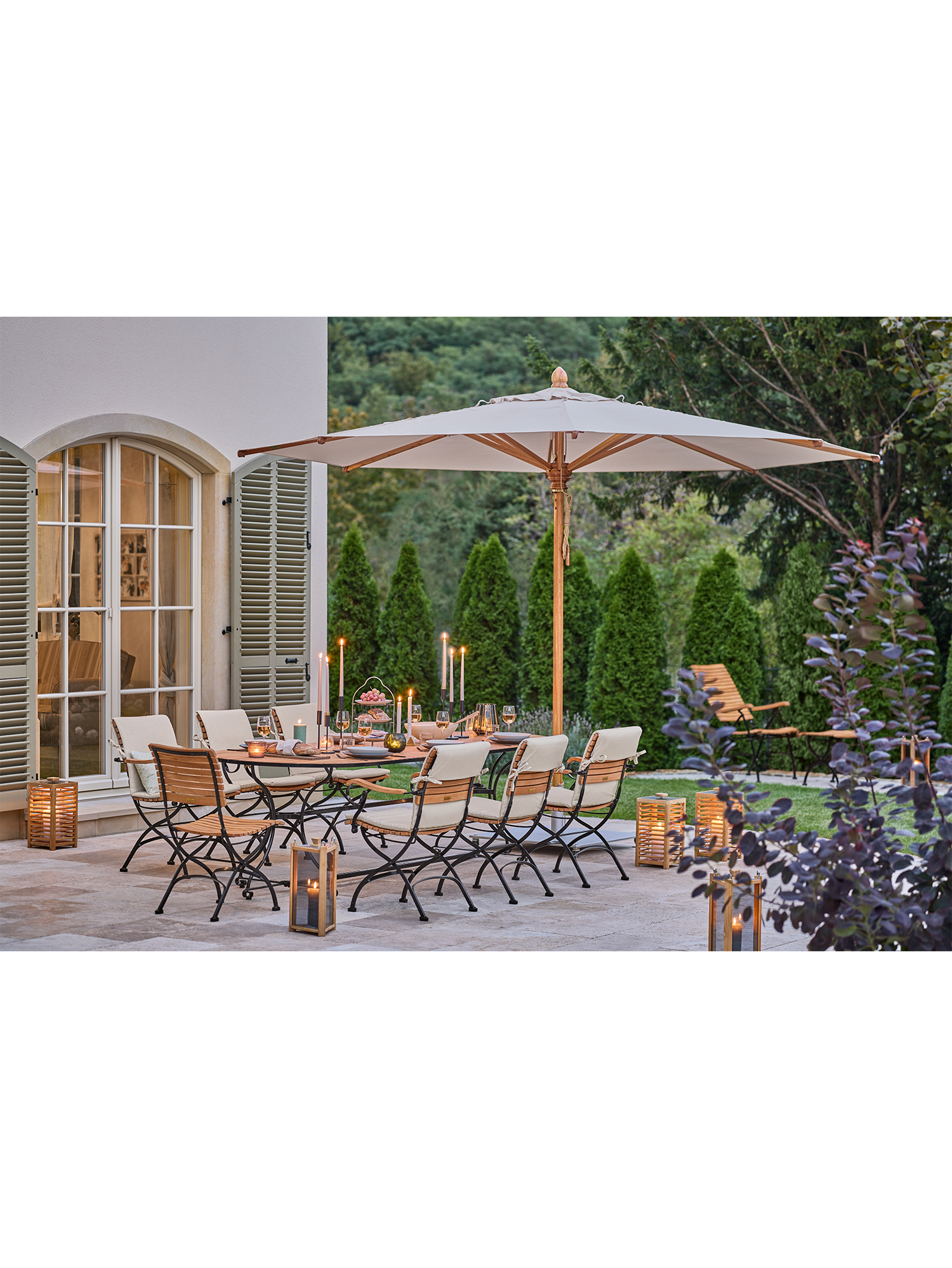 The canopies of our Umbria parasols are of lightly waterproofed polyacrylic and available in the colour Ivory.