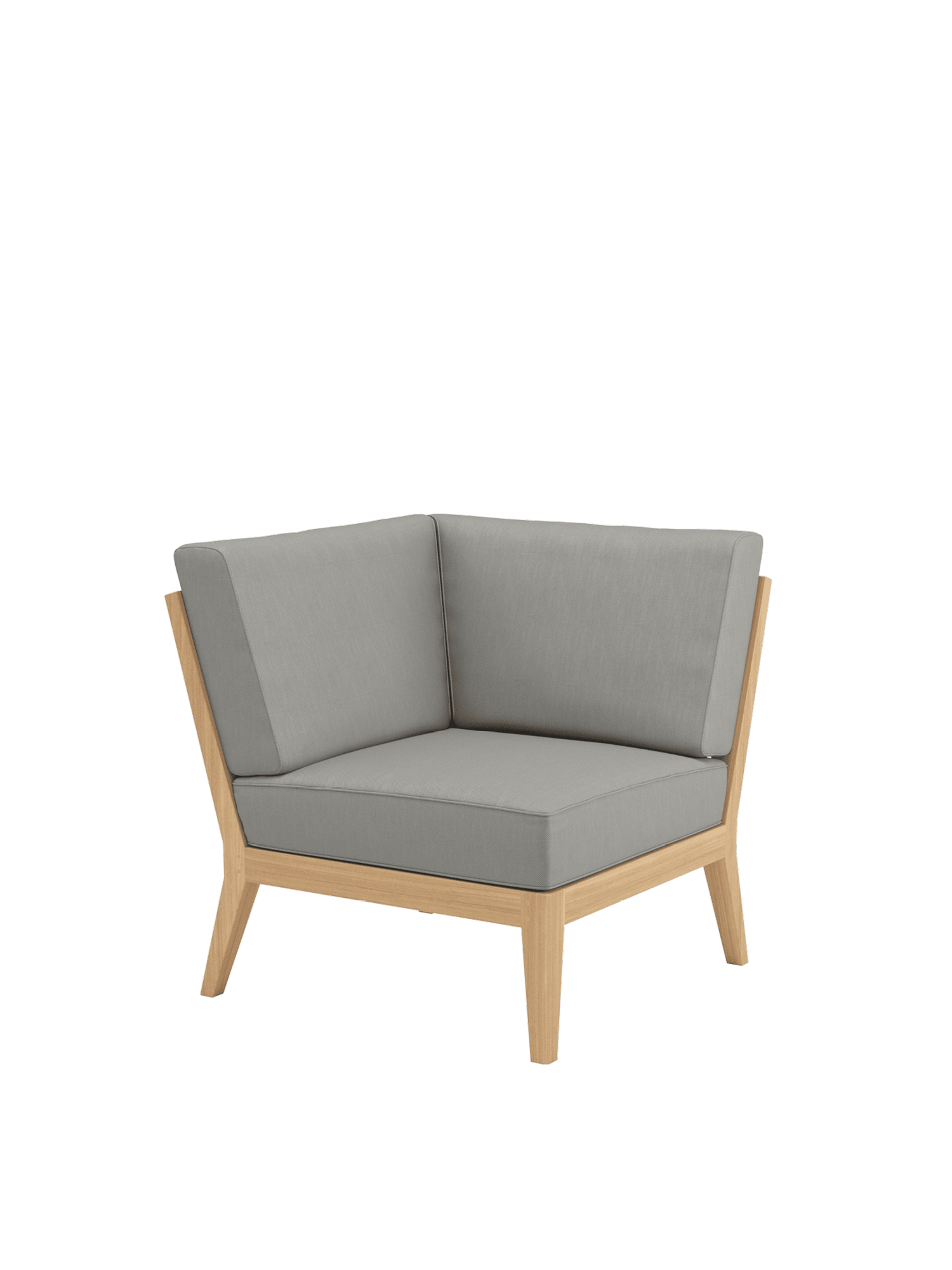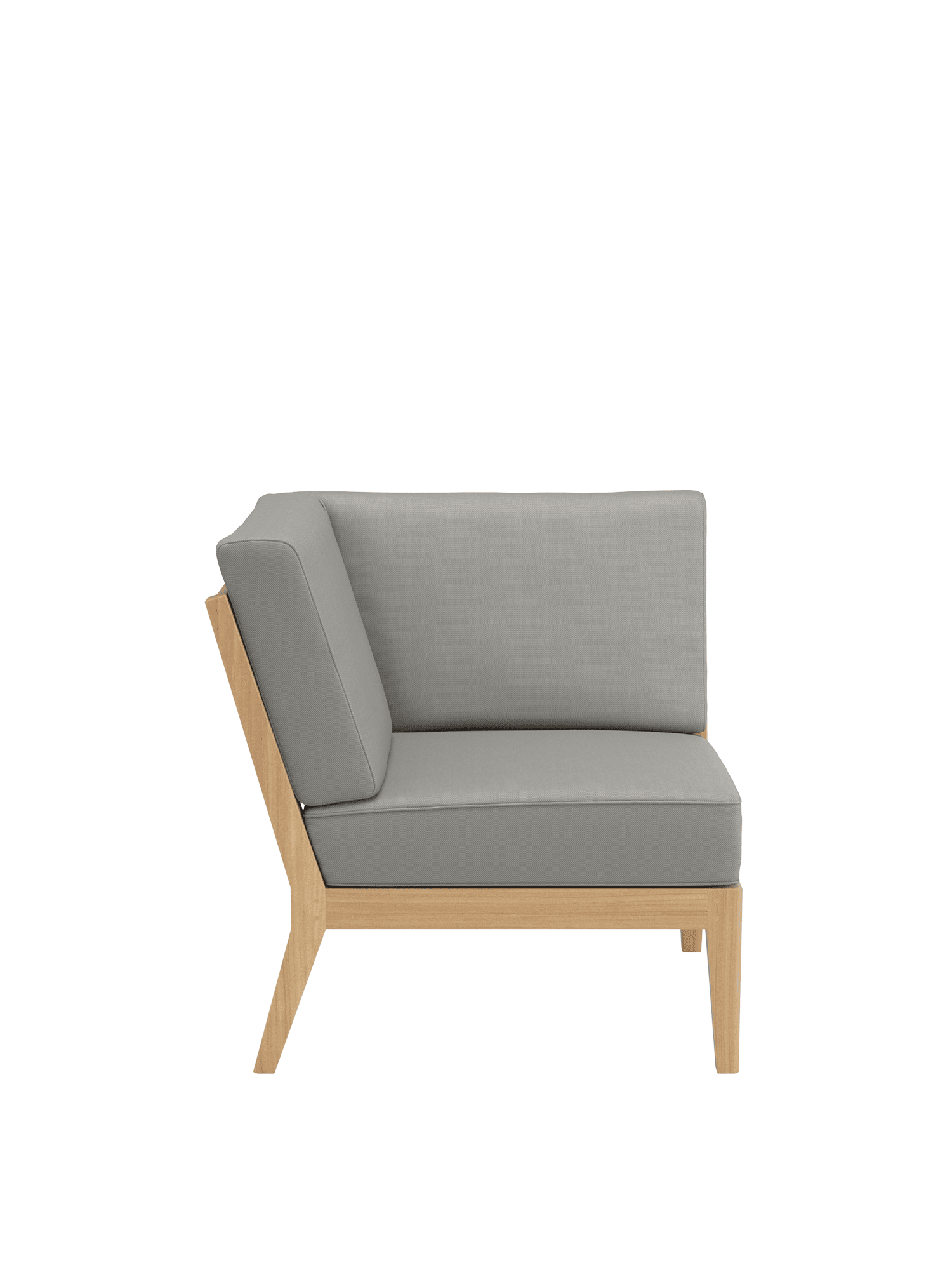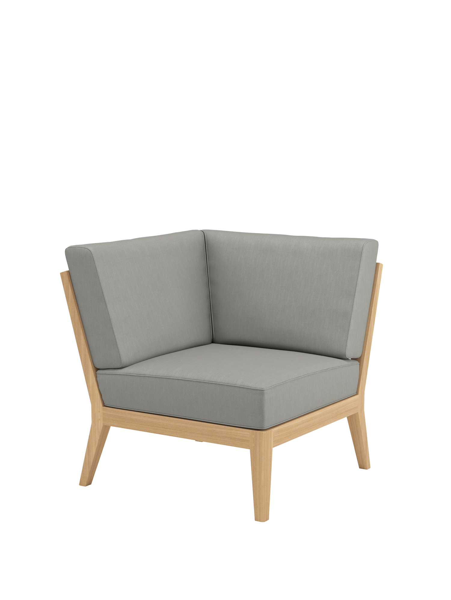 At the side of the pool or edge of the terrace, on a city balcony or in the middle of the garden: the elements of the Valencia lounge furniture create an oasis of tranquillity in every airy location of adequate size. Extra wide and especially deep, chaise longues, middle elements and corner modules made of teak with angled legs, and transversely aligned seat and backrest slats, offer plenty of space for relaxing. Thick upholstery with welted seams and feather cushions in fresh colours set summery accents.