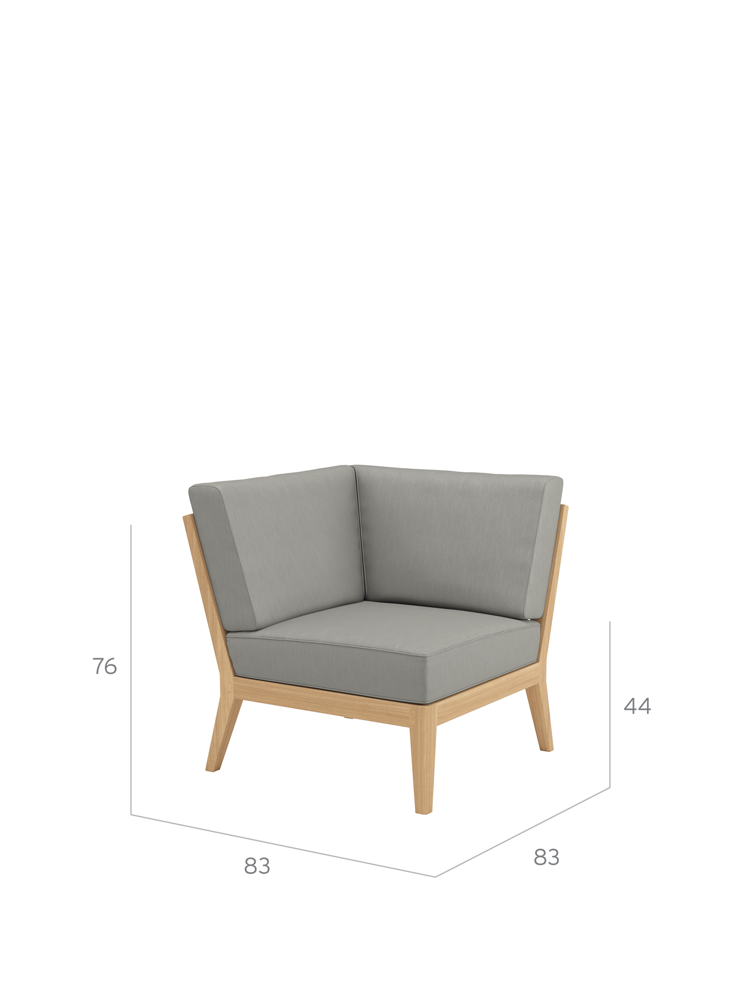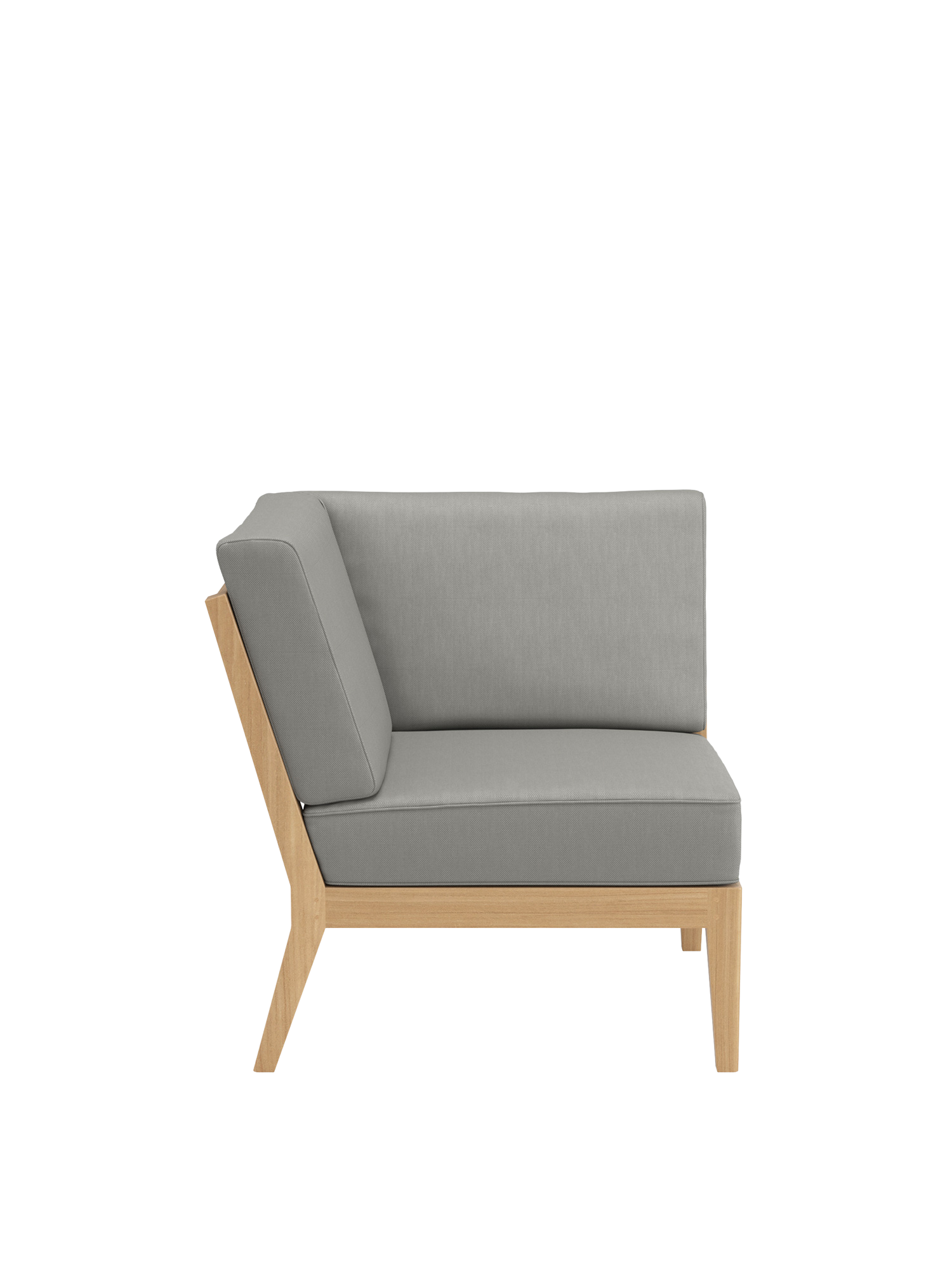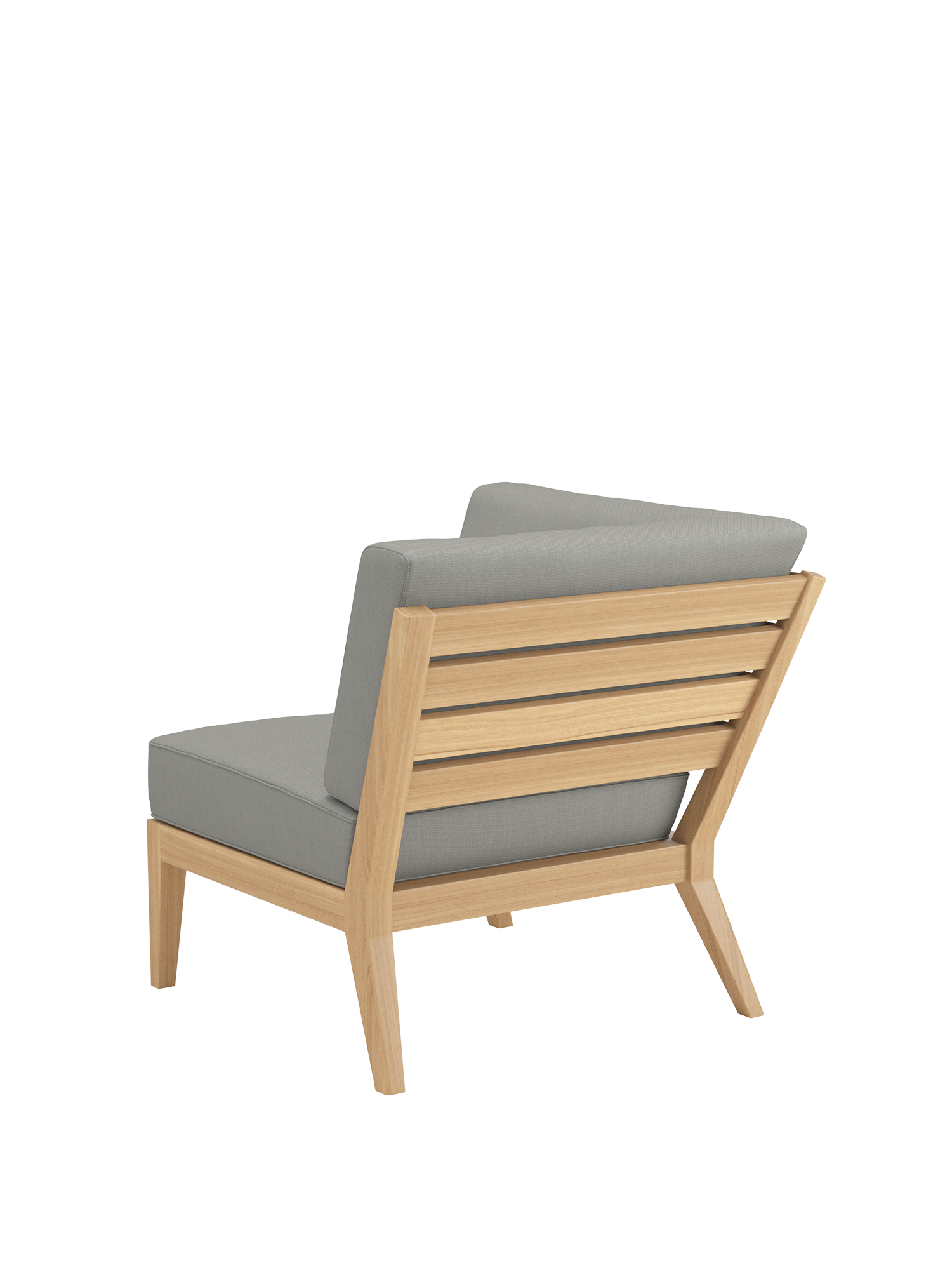 At the side of the pool or edge of the terrace, on a city balcony or in the middle of the garden: the elements of the Valencia lounge furniture create an oasis of tranquillity in every airy location of adequate size. Extra wide and especially deep, chaise longues, middle elements and corner modules made of teak with angled legs, and transversely aligned seat and backrest slats, offer plenty of space for relaxing. Thick upholstery with welted seams and feather cushions in fresh colours set summery accents.