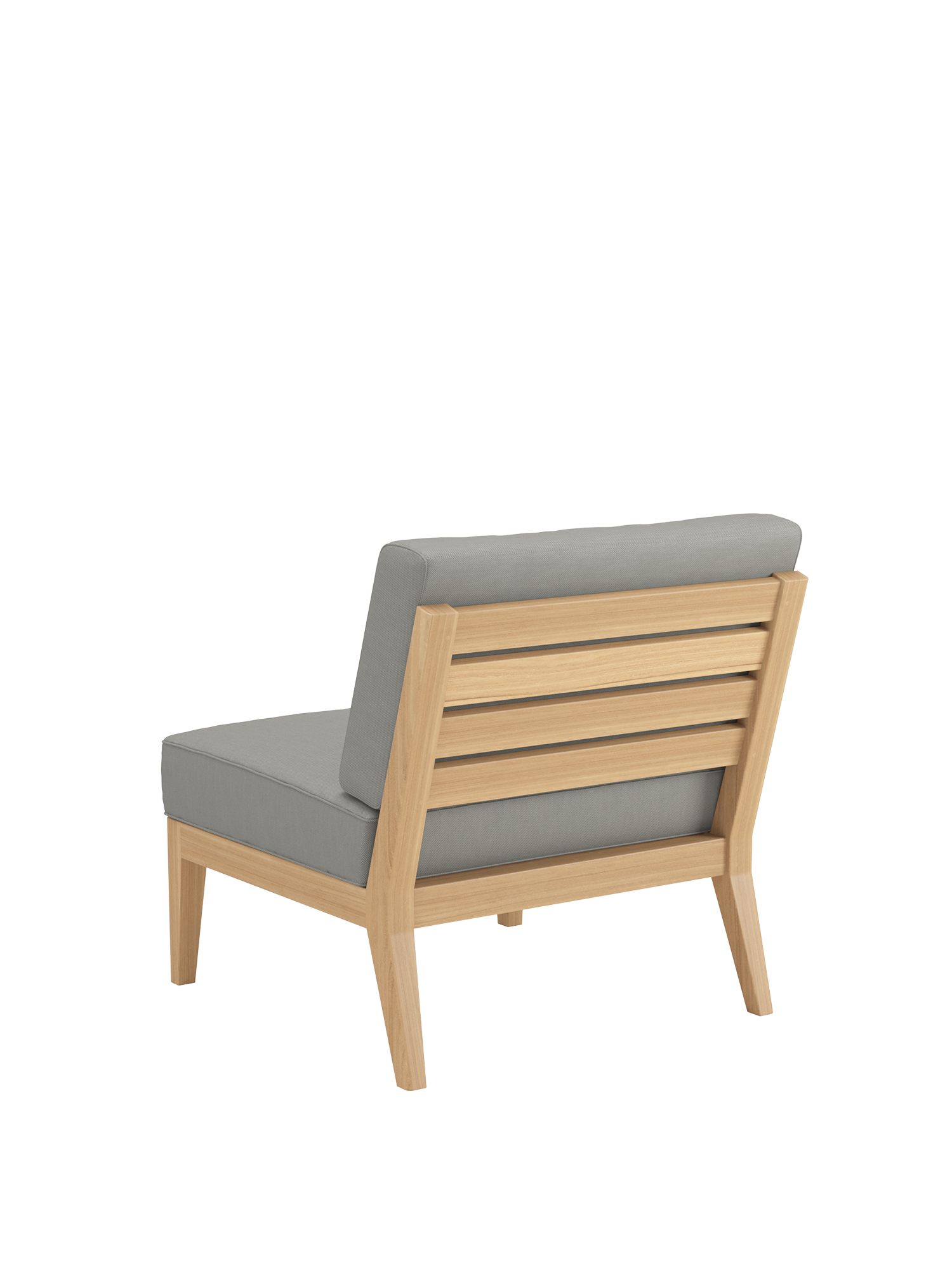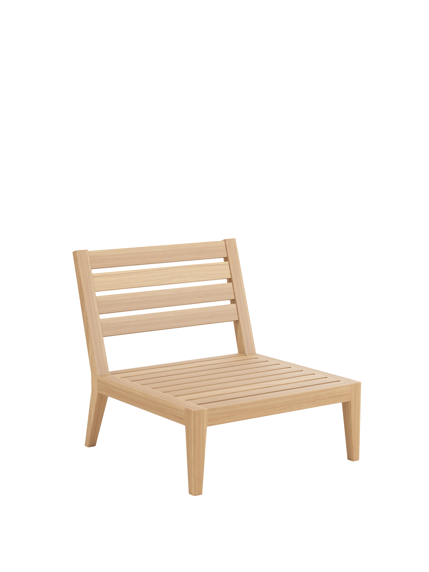 At the side of the pool or edge of the terrace, on a city balcony or in the middle of the garden: the elements of the Valencia lounge furniture create an oasis of tranquillity in every airy location of adequate size. Extra wide and especially deep, chaise longues, middle elements and corner modules made of teak with angled legs, and transversely aligned seat and backrest slats, offer plenty of space for relaxing. Thick upholstery with welted seams and feather cushions in fresh colours set summery accents.