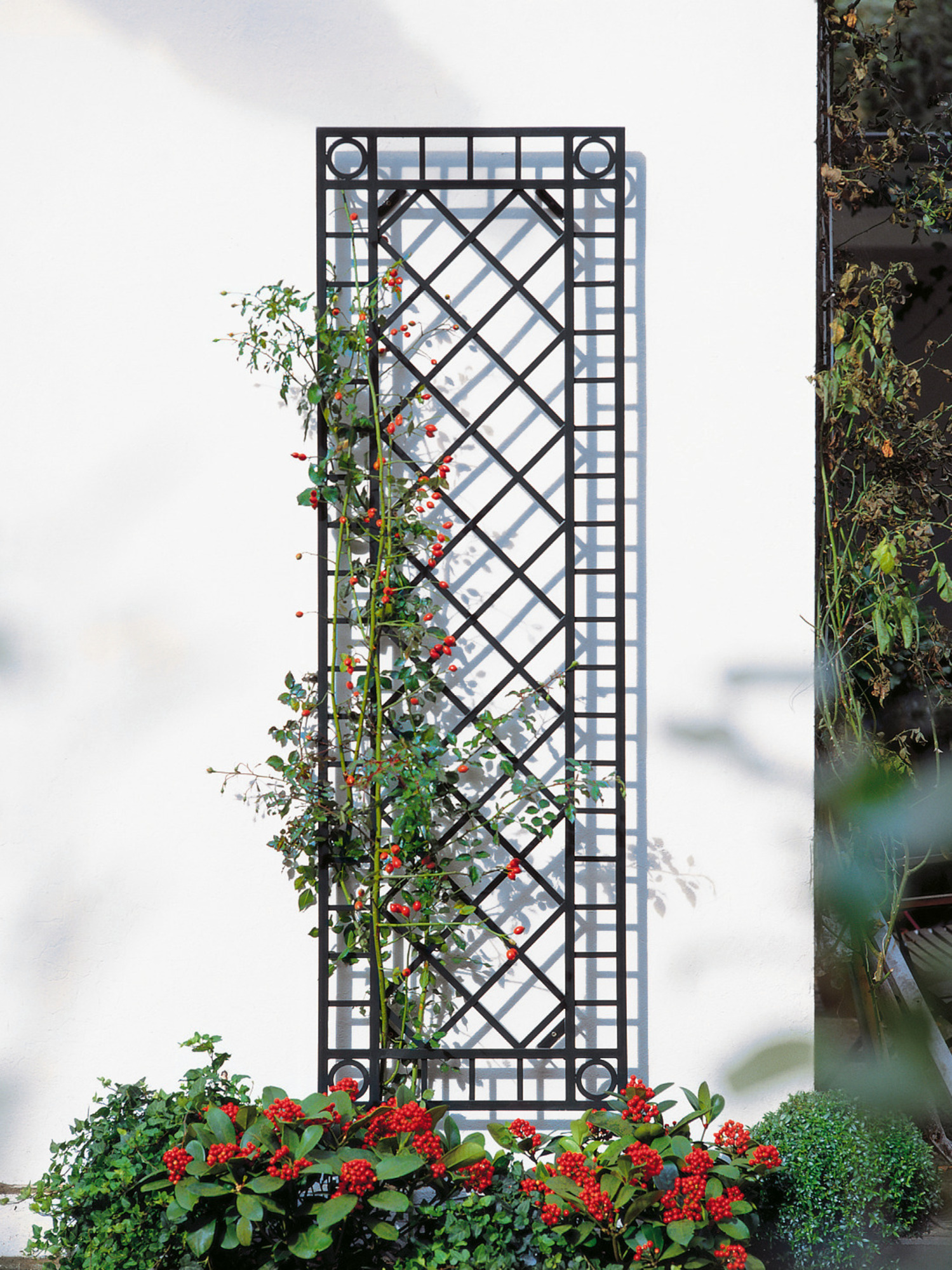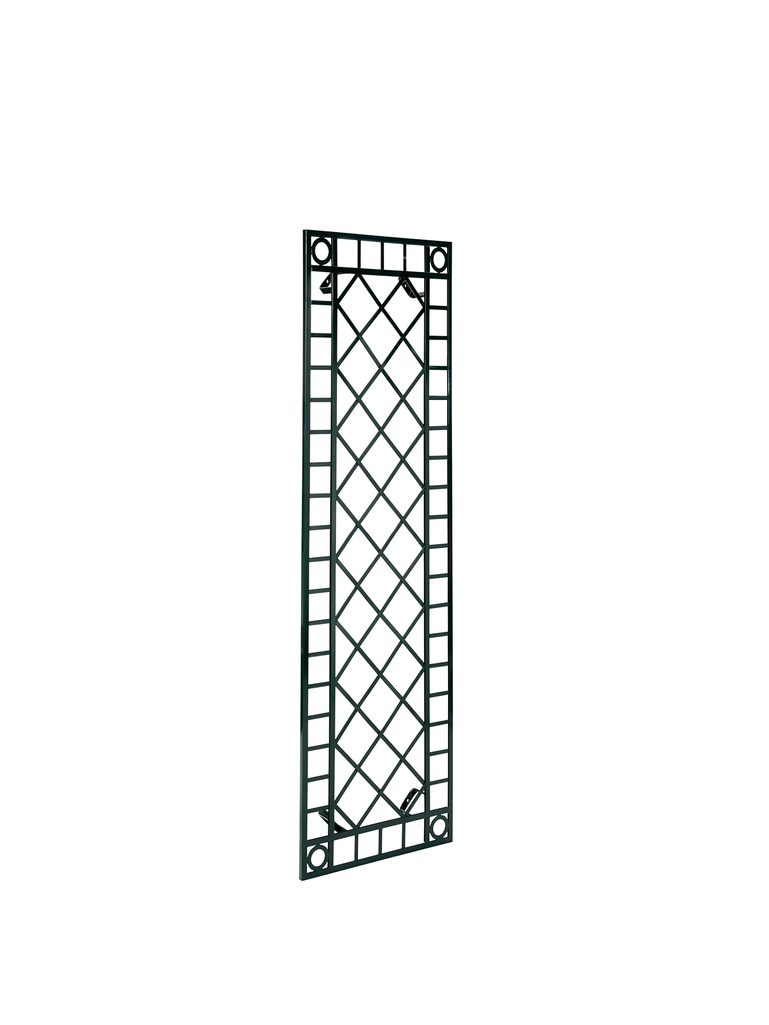 An elegant plant support to beautify a wall. The wall trellis is of weatherproof aluminium with dark green powder-coating. Strong mounting at the back ensures the right distance from the wall, providing the plant with air as well as grip. The trellises are available in two widths. Please note that mounting cannot be undertaken by our forwarding agent.